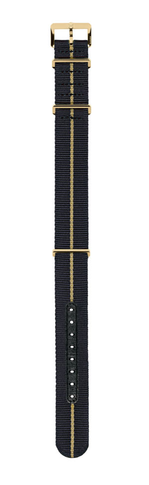 Personalising your style has never been so easy thanks to the new Rado EasyClip System. This NATO strap is made from durable synthetic fabric with a gold coloured middle line. It is attached to the watch head with the help of easy removable spring bars. The strap is secured with a bronze thorn buckle and bronze loops. Please note that this strap is exclusively intended for our Captain Cook Automatic Bronze with a diameter of 42 mm. The watch head shown in the picture is not included. You can find more information on replacing the strap with our Easy-Clip system here.