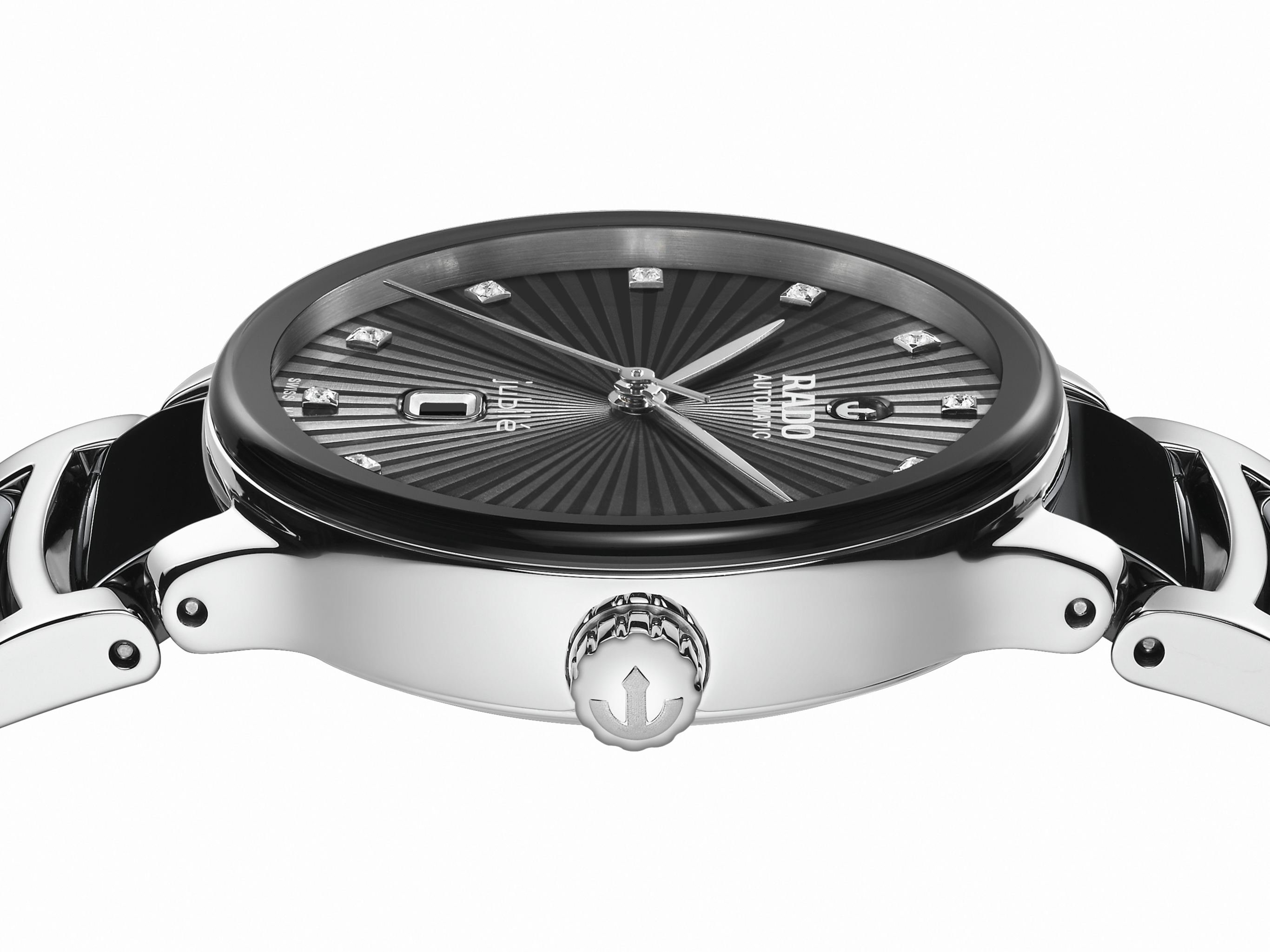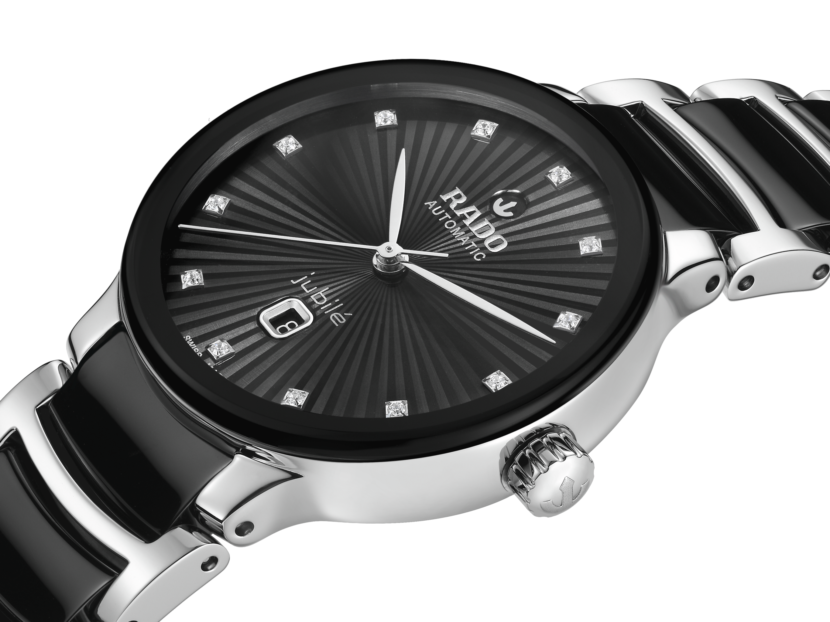 经典Centrix晶萃系列镶钻自动机械腕表不仅在技术上进行调整,亦在美学上予以重新设计。修改后的表款,拥有一个圆形的无边框蓝宝石水晶玻璃表镜,以及一个与弧形水晶边缘浑然天成的弧形表壳。调整后的表耳和搭配黑色高科技陶瓷中央链节的抛光精钢表链,令这款经典时计的整体外观更臻完美。表盘通过压印成型并以漆面填充,为黑色刻面表盘创造出华丽的3D效果。由于搭载Nivachron™防磁游丝,使这款R582型三针机芯在3至5个位置上远超标准测试要求,实现更高的可靠性和精确度。这款腕表防水深度可达50米,并提供48小时的动力储存。