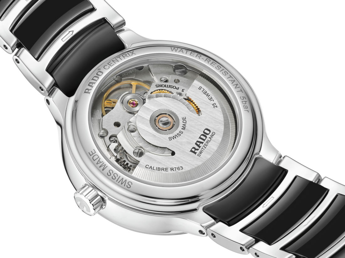 戴上Centrix晶萃系列开芯腕表,切身感受艺术表达与设计风格的美妙融合。略带圆弧边缘的微凸蓝宝石玻璃表镜,与表壳严丝合缝的胶合在一起,令设计更加完整一体;表壳覆有双面防眩目涂层,确保能够清晰读时。由于搭载Nivachron™防磁游丝,使这款R763型三针机芯在3至5个方位上远超标准测试要求,实现更高的可靠性和精确度。 这款标志性的腕表在表耳和表链处都经过调整,表链由玫瑰金色PVD镀层精钢和黑色高科技陶瓷中间链节制成,令这款经典时计的整体外观更加完美。镶有12颗钻石的黑色刻面表盘,经过压印上漆,形成一种华丽的3D效果。这款腕表防水深度可达50米,并提供80小时的动力存储。