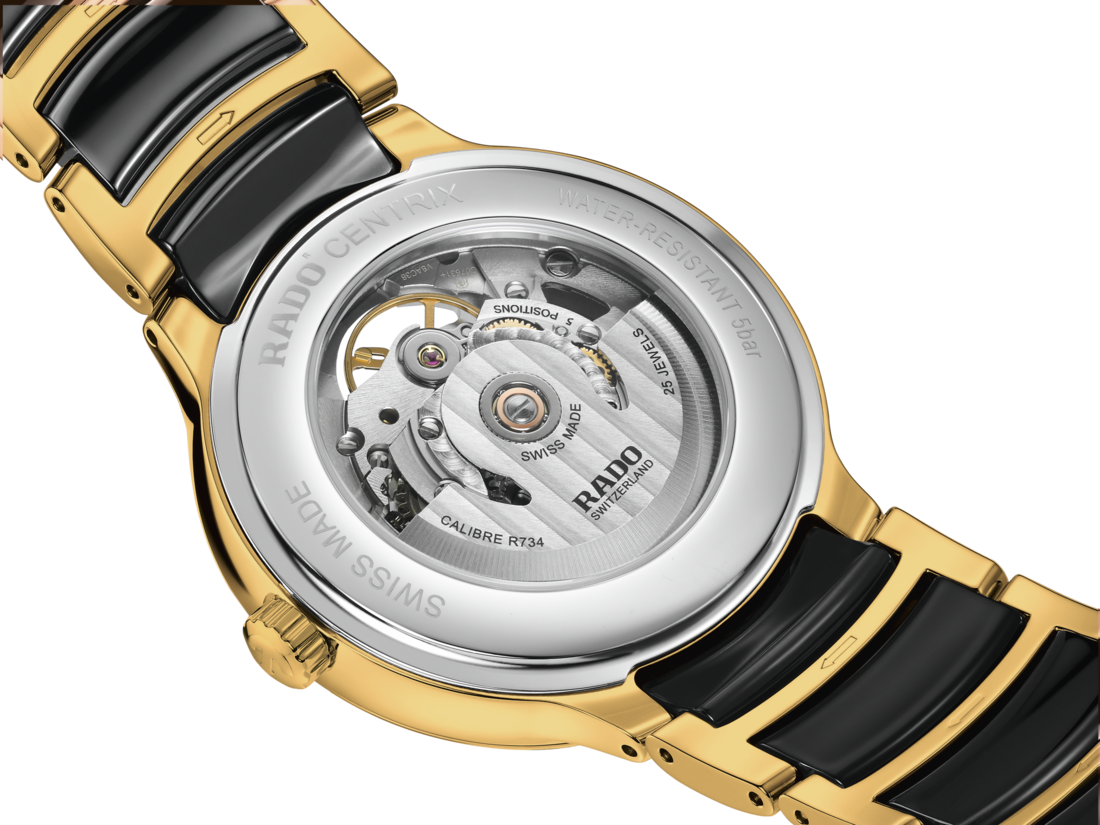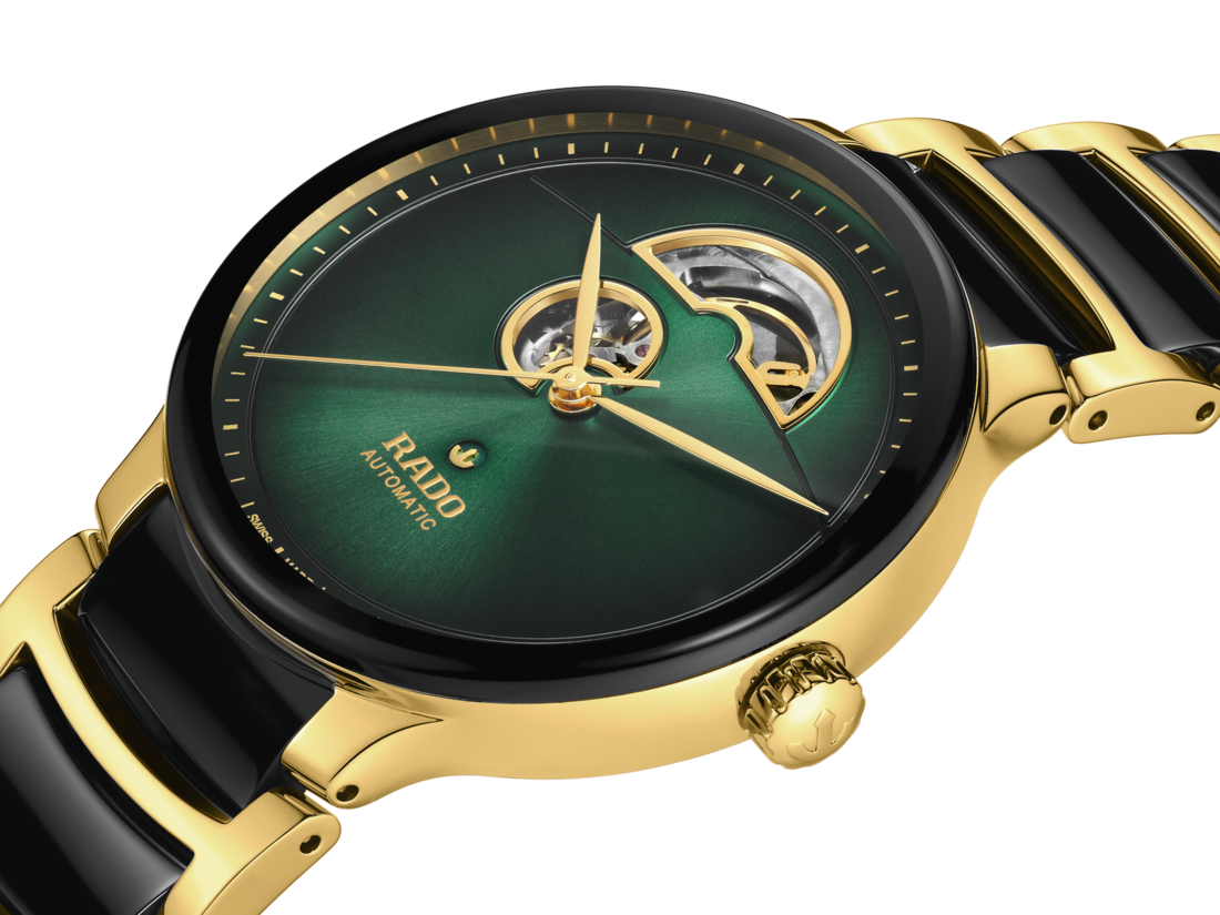 探索创新与美学的完美平衡,尽在Rado瑞士雷达表Centrix晶萃系列自动机械开芯腕表。 这枚腕表采用了Rado瑞士雷达表R734型自动机械机芯,无论是精准度或可靠性均无可挑剔。拥有令人赞叹的80小时动力储存,可确保腕表长时间运行。Nivachron™防磁游丝和五方位调校,进一步提升腕表的精准度。Centrix晶萃系列自动机械开芯腕表选用抛光黄金色精钢表壳,直径39.5 mm,外观精致典雅,尽显精湛工艺。抛光精钢底盖搭配蓝宝石玻璃表镜,可以一窥腕表内部的迷人构造。表盘呈现出绿色到黑色的渐变之美,令人目不转睛,为腕表设计增添不少深度和魅力。黄金色指针和表盘相映成趣,确保清晰易读之外,尽显典雅气质。表链选用抛光黄金色精钢和黑色高科技陶瓷中间链节,形成鲜明对比。