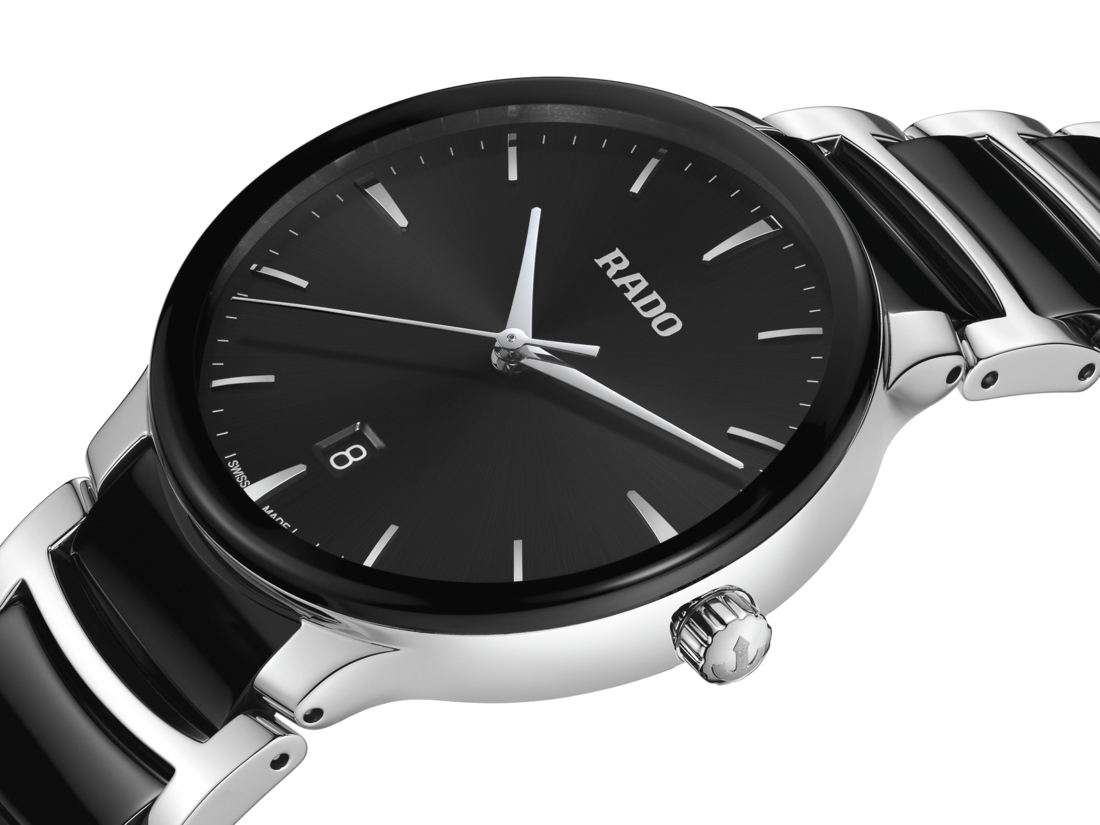 The classic Centrix Quartz has been reworked not only technically, but also aesthetically. The modified model has a rounded sapphire crystal that extends all the way to the edge and a curved case blending with the curved crystal edge. The adjusted case lugs and the bracelet made of polished stainless steel with black high-tech ceramic middle links complete the overall appearance of this iconic timepiece. The black sunray dial with rhodium-coloured applied indexes matches perfectly with the rhodium-coloured hands. Thanks to the PreciDrive and HeavyDrive features in the calibre R073 quartz movement, the watch has greater accuracy and resistance to shocks. The watch is water-resistant down to 50 m.