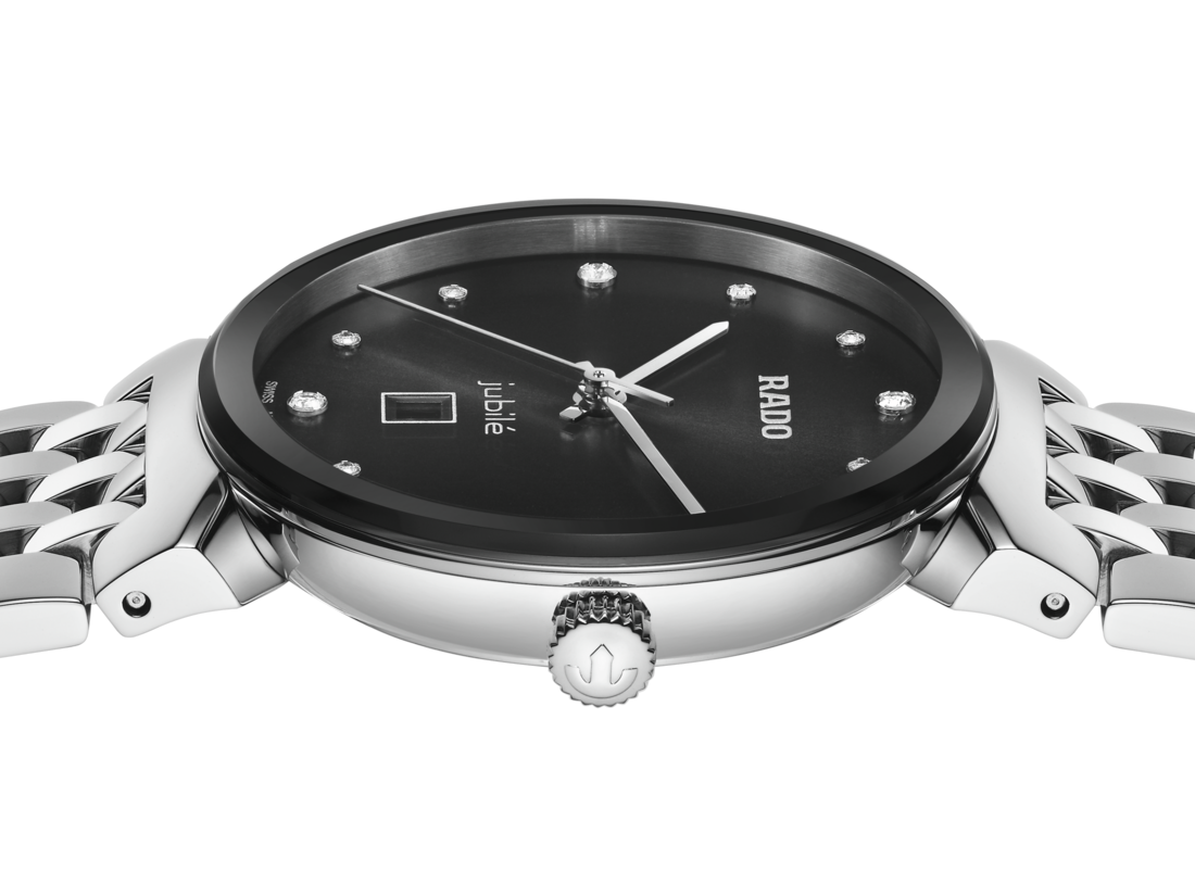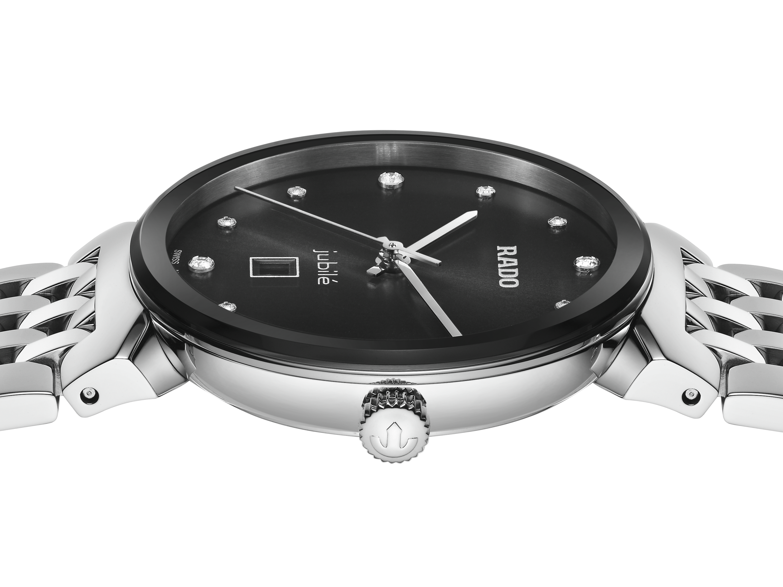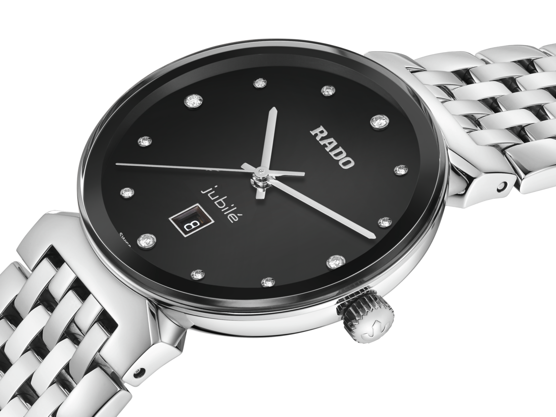 Rado瑞士雷达表Florence佛罗伦萨经典系列腕表充满和谐感的设计构思,令人联想起这款腕表所命名城市——意大利佛罗伦萨标志性典雅圆顶和钟塔。该系列腕表搭载高品质自动机械机芯和品牌创新材质工艺——无边框金属镀层蓝宝石玻璃,堪称是经得起时间考验的瑞士时计臻品。这款30毫米腕表拥有无边框弧形斜面蓝宝石水晶玻璃表镜。表壳、表圈、表冠和表链均采用抛光精钢制成。黑色太阳纹表盘镶嵌着12颗钻石,印有“jubilé”标志,与铑色指针完美搭配。搭载三针R079型石英机芯,让腕表具有更加优异的精度和抗震性。腕表防水性能达50米。此外,另有大尺寸可供挑选,是理想的情侣款腕表。