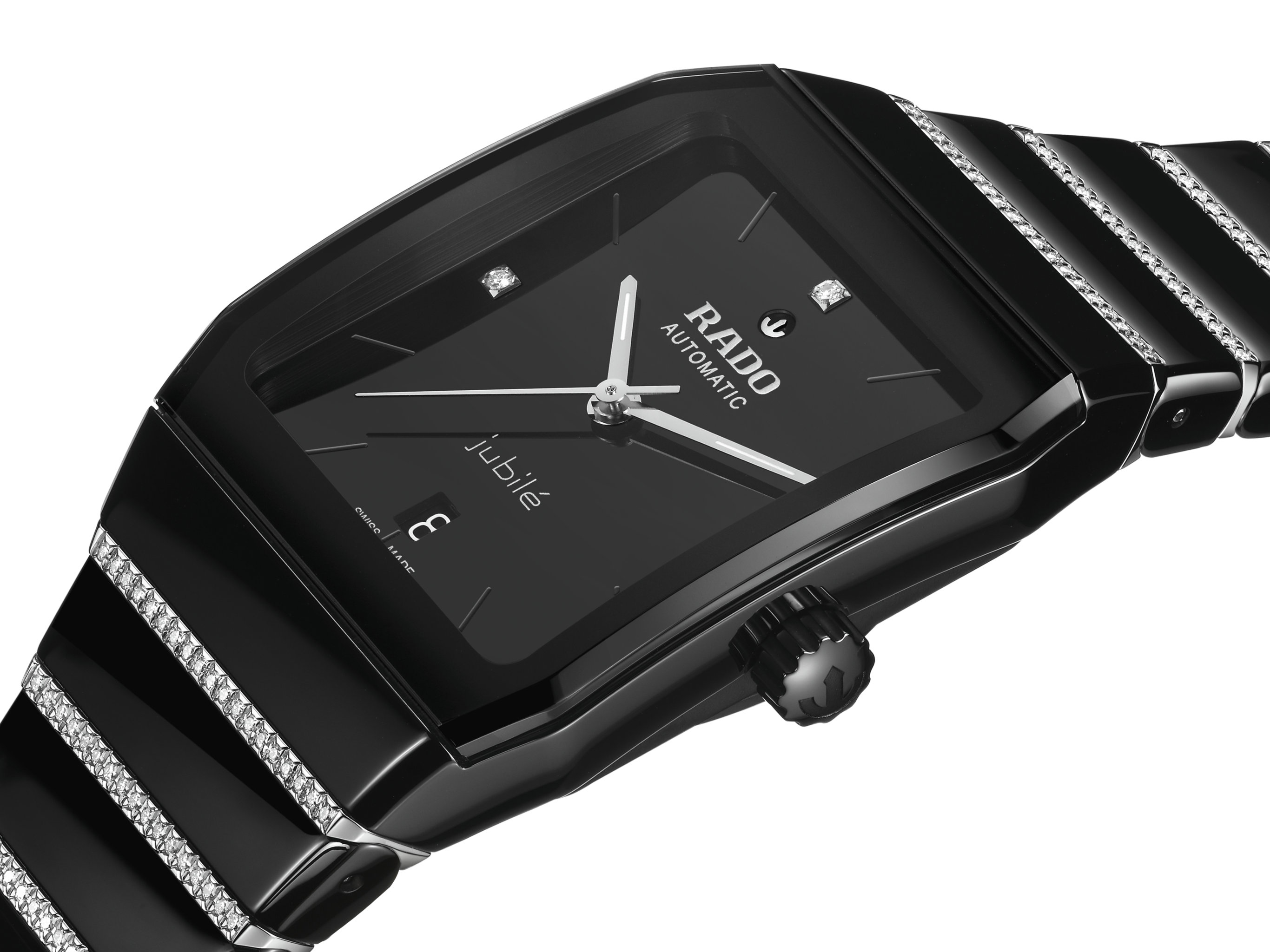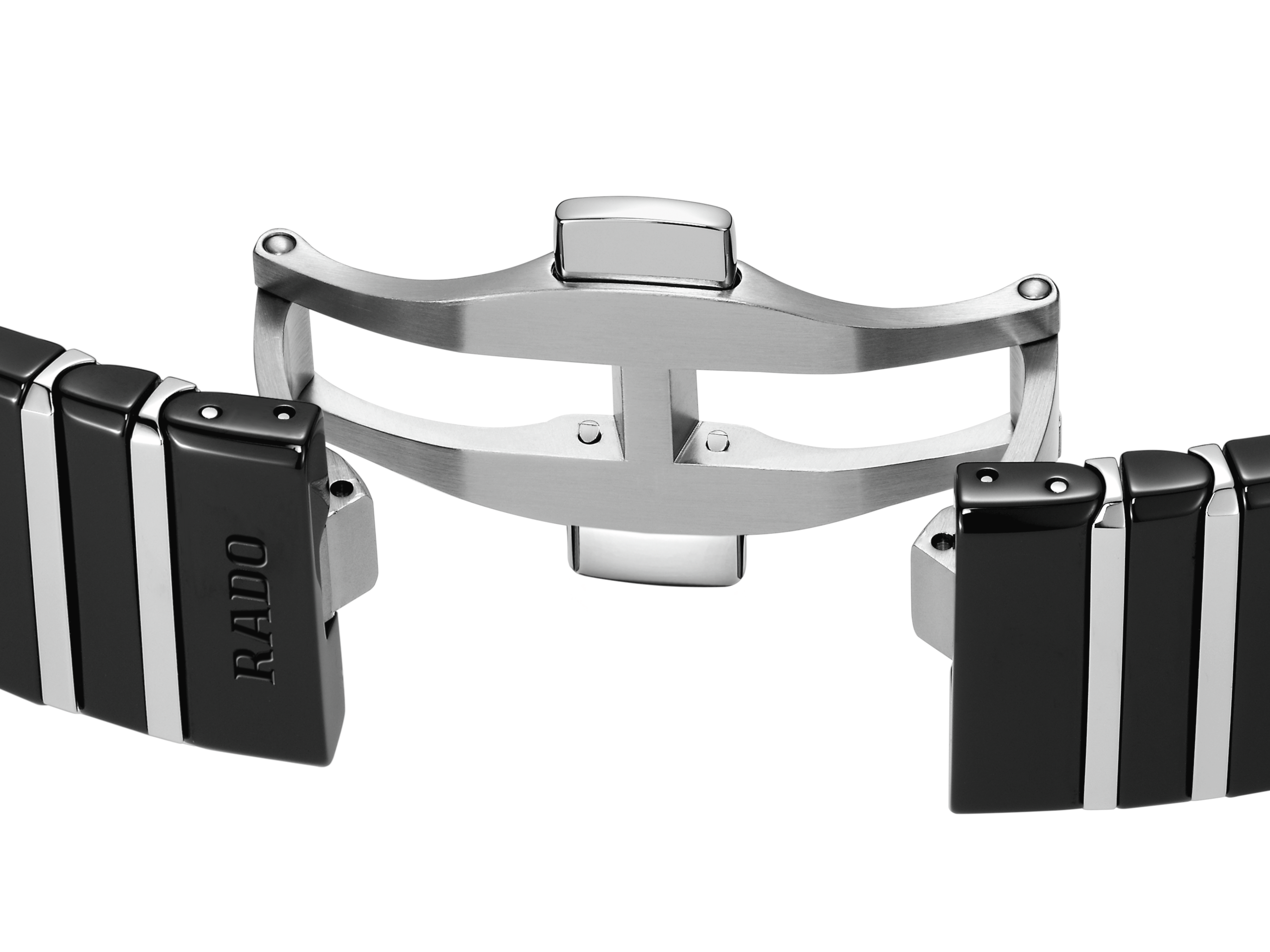自1983年首次亮相以来,Rado瑞士雷达表Anatom拱形系列一直是突破性设计与卓越舒适感的代名词。其标志性特色是圆柱形金属镀层蓝宝石玻璃表镜,双面带有倒角边缘,无缝延伸至高科技陶瓷表链,形成平滑而连贯的轮廓,将表壳与表链融为一体,展现出统一且和谐的设计。表链由抛光黑色高科技陶瓷链节和抛光精钢中间链节细致打造,镶嵌162颗全切割威塞尔顿钻石,并以拉丝精钢三折式表扣精心固定。 在这块独特的玻璃之下,呈现出黑色的漆面表盘,表盘上印有哑光黑色时标。3颗全切割威塞尔顿钻石及覆有白色Super-LumiNova®夜光涂层的铑色指针,与深邃的表盘色彩形成鲜明对比。表盘12点钟位置上饰有经典的可摆动锚型标志,对应着6点钟位置低调的日期窗口。 透过蓝宝石玻璃底盖,可尽情欣赏镶有21颗宝石的R766型自动机械机芯的律动之美。机芯经五个方位精密调节,搭载Nivachron™防磁游丝,提供高精准度和强劲的72小时动力储存,彰显Rado瑞士雷达表对完美品质的追求。