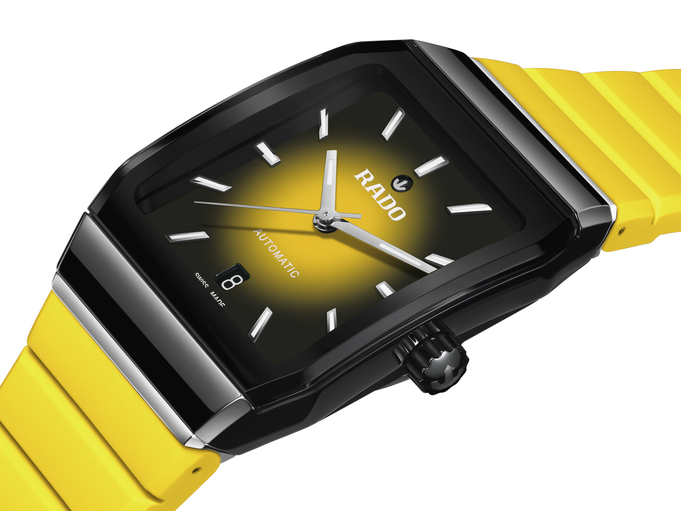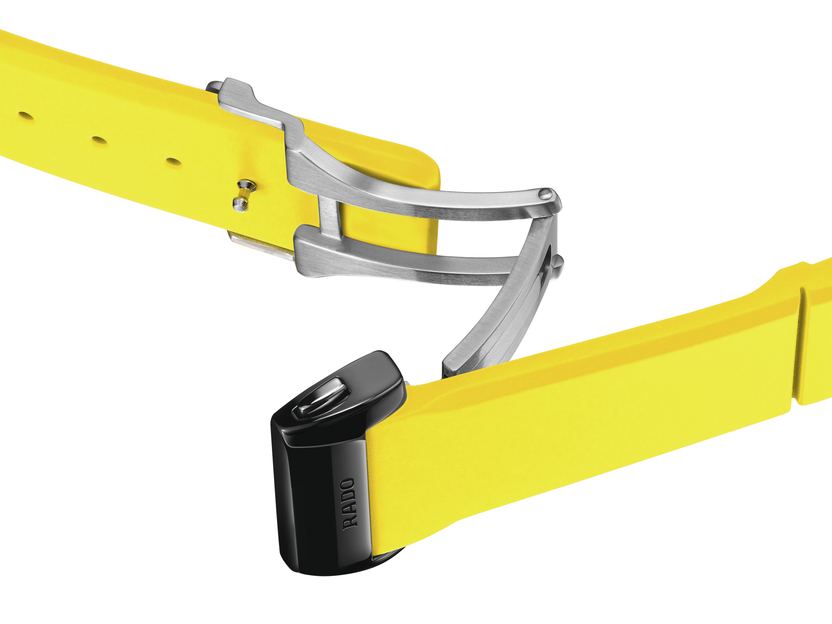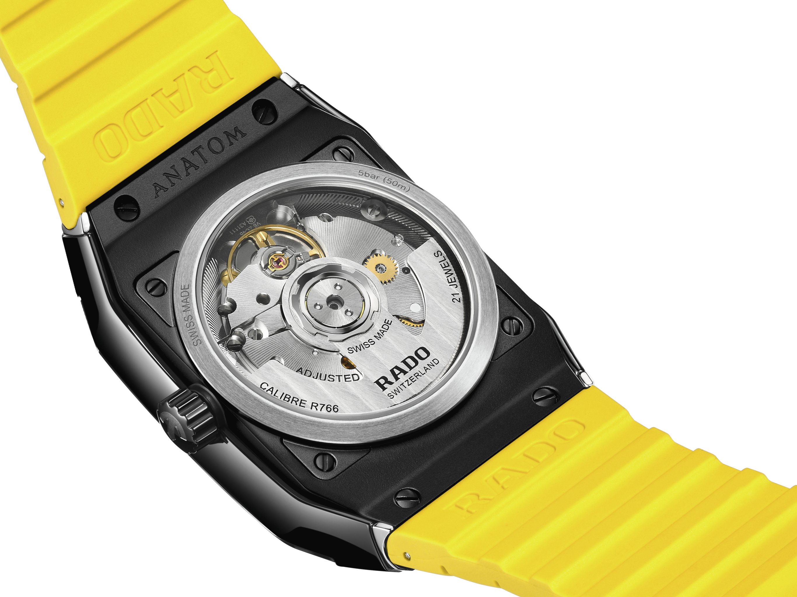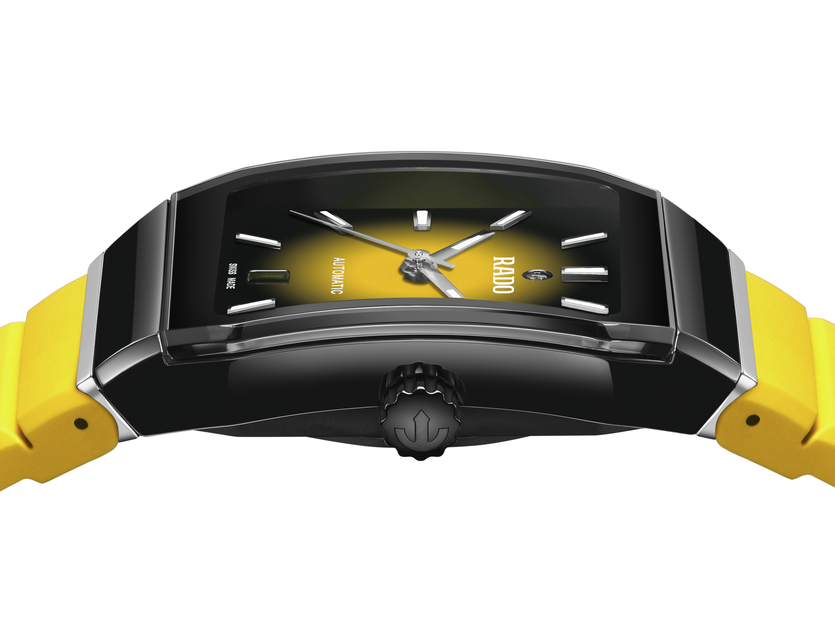 自1983年首次亮相以来,Rado瑞士雷达表Anatom拱形系列一直是突破性设计与卓越舒适的代名词。其标志性特征在于圆柱形金属镀层蓝宝石水晶表镜——两侧对称斜面切割,倒角线条无缝流泻至抛光高科技陶瓷表壳,继而延伸至抛光精钢表耳,最终与柠檬黄锥形橡胶表带浑然交融。此一体成型设计由拉丝精钢三折式表扣稳固衔接,搭配抛光高科技陶瓷扣面。 在这块独特的水晶之下,是黑色至柠檬黄渐变表盘。覆有白色Super-LumiNova®夜光涂层的铑色指针和时标,与表盘的深邃色彩形成精致的对比。表盘12点钟位置上饰有经典的可摆动锚型标志,与6点钟位置低调的日期窗口相得益彰。 透过蓝宝石水晶底盖,可尽情欣赏镶有21颗宝石的R766型自动机械机芯在表壳内律动的美感。机芯经五个方位精密调节,搭载Nivachron™游丝,提供高精准度和强劲的72小时动力储存,彰显Rado瑞士雷达表对完美的承诺。