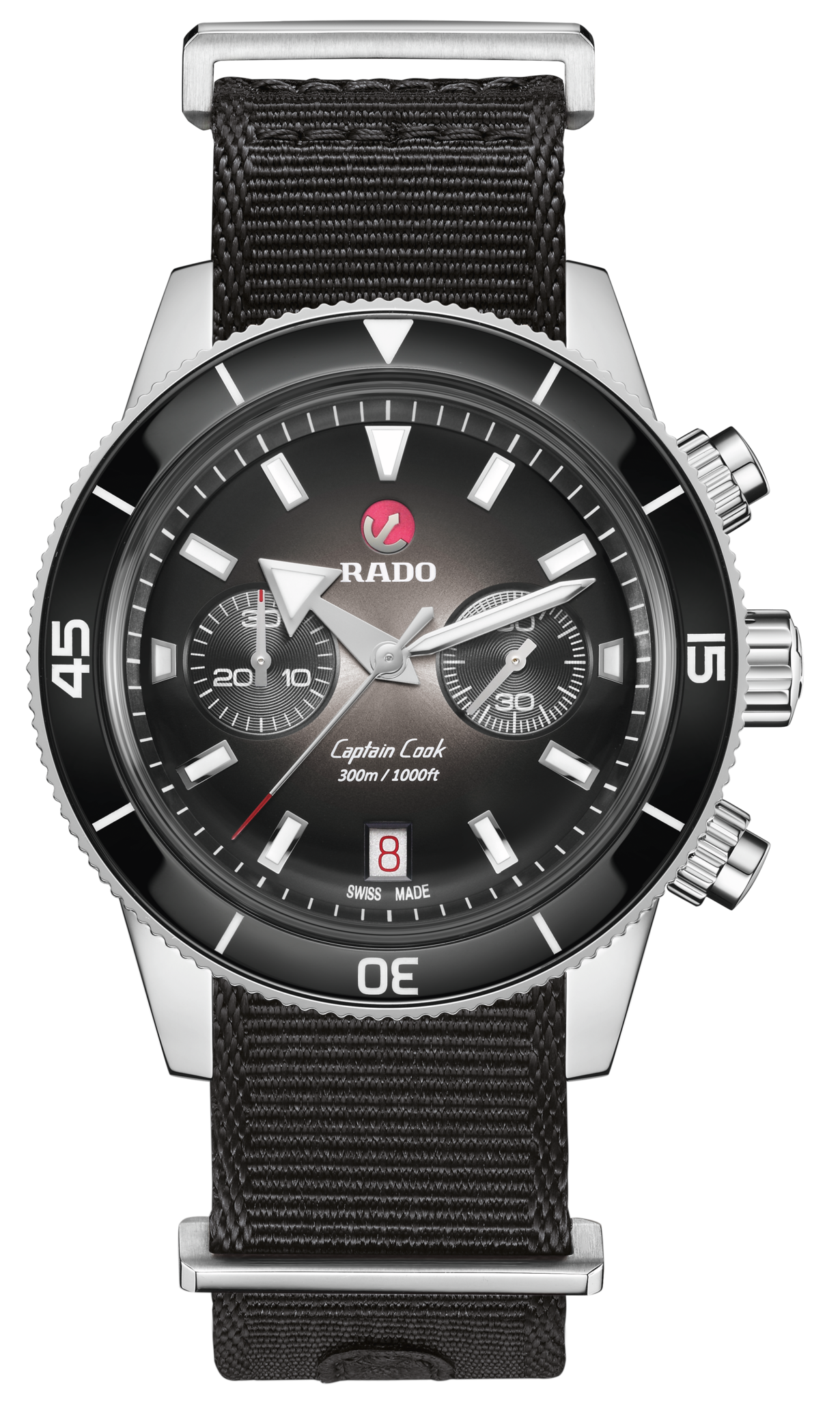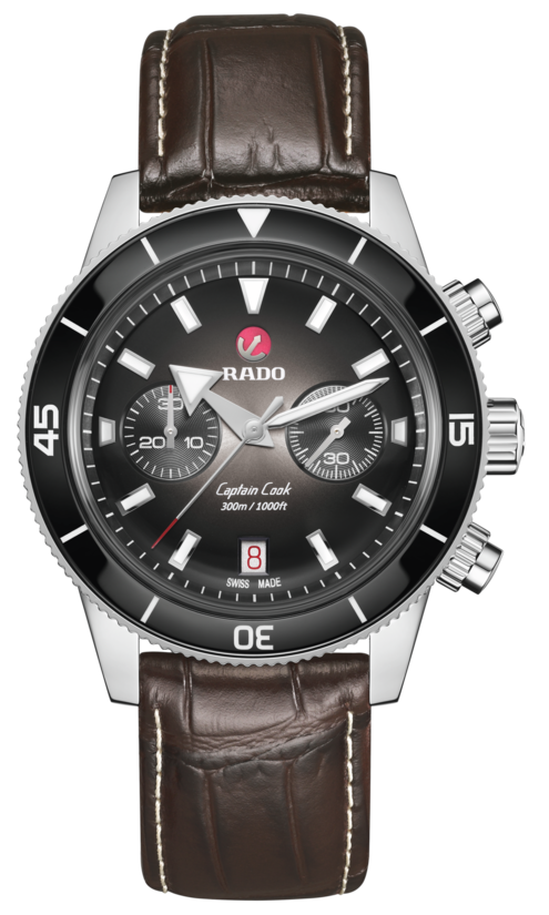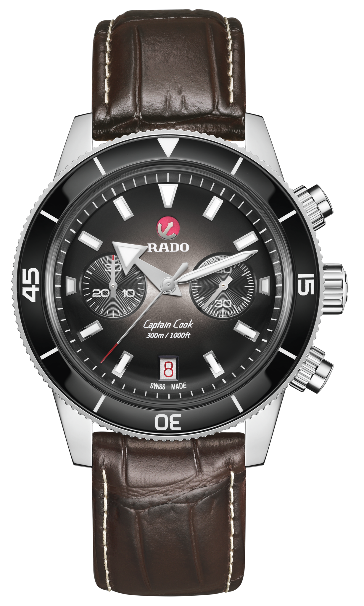 Captain Cook库克船长自动计时腕表拥有迷人且别具特色的盒形玻璃,采用防刮的蓝宝石水晶玻璃表镜,并对两面都进行了防反光处理。43毫米精钢表壳纤薄时尚,表圈上镶嵌抛光黑色高科技陶瓷,与银黑渐变色表盘完美辉映。数字、时标与三角形标志均覆有Super-LumiNova®夜光涂层。腕表内部采用全新更加纤薄的R801型自动机械机芯,搭配37颗宝石、5根指针且可提供最高长达59小时的动力储存,防磁Nivachron™游丝让机芯在3至5个位置上远超标准测试要求,实现更高的精确度。表款配有一条抛光与磨砂精钢表链,另附一条棕色皮革表带,以及一条黑色织物表带。