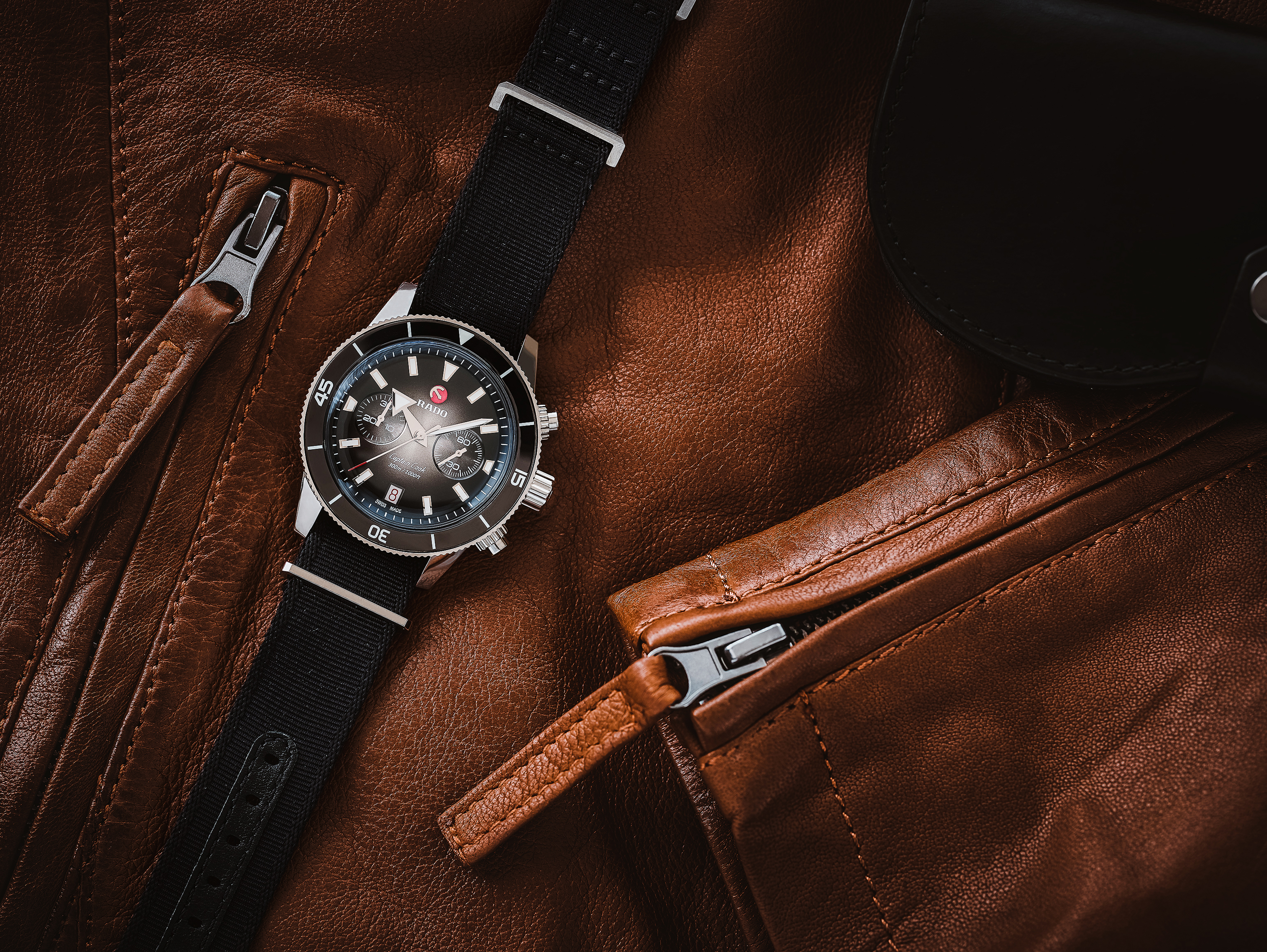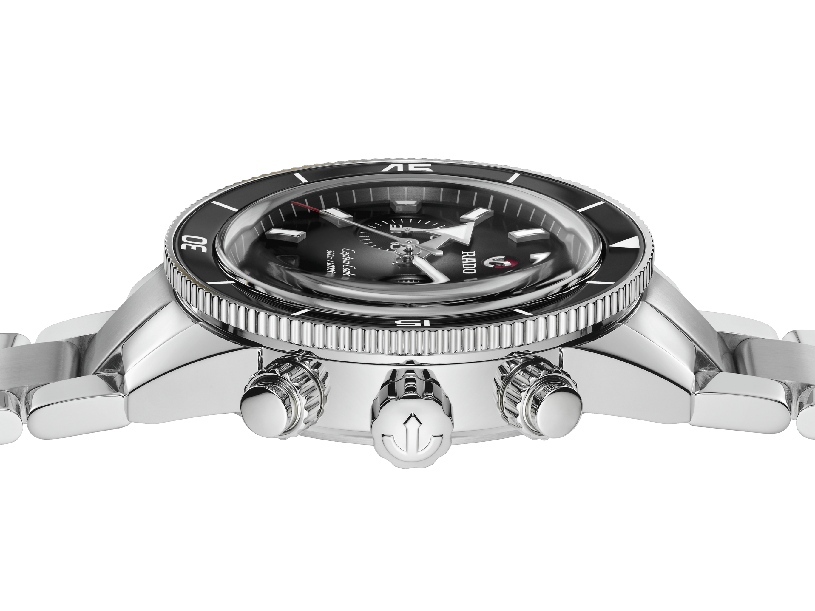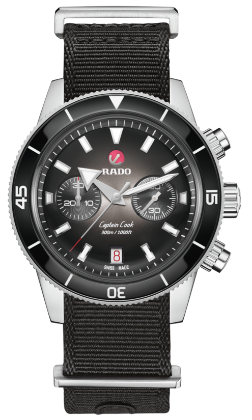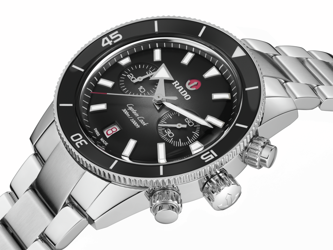 Captain Cook库克船长自动计时腕表拥有迷人且别具特色的盒形玻璃,采用防刮的蓝宝石水晶玻璃表镜,并对两面都进行了防反光处理。43毫米精钢表壳纤薄时尚,表圈上镶嵌抛光黑色高科技陶瓷,与银黑渐变色表盘完美辉映。数字、时标与三角形标志均覆有Super-LumiNova®夜光涂层。腕表内部采用全新更加纤薄的R801型自动机械机芯,搭配37颗宝石、5根指针且可提供最高长达59小时的动力储存,防磁Nivachron™游丝让机芯在3至5个位置上远超标准测试要求,实现更高的精确度。表款配有一条抛光与磨砂精钢表链,另附一条棕色皮革表带,以及一条黑色织物表带。