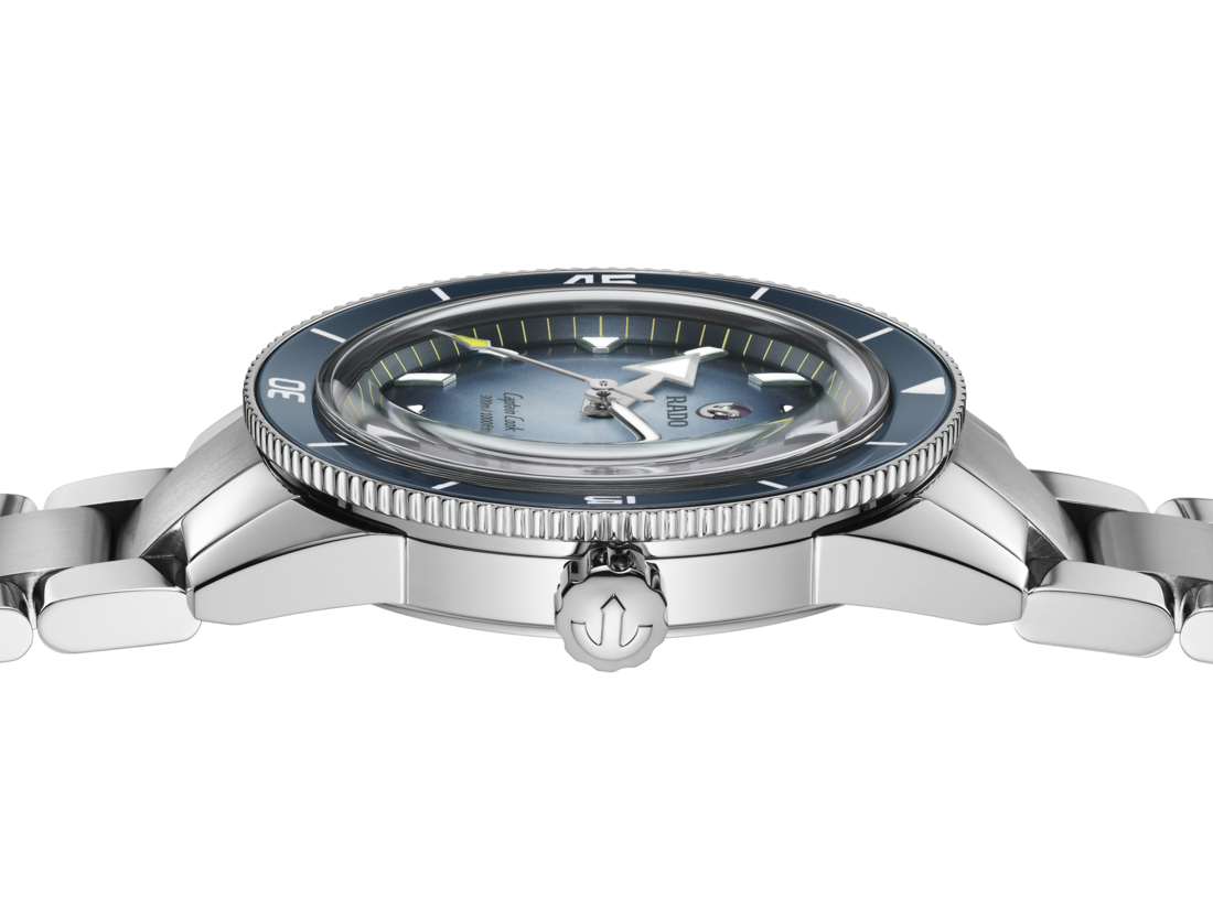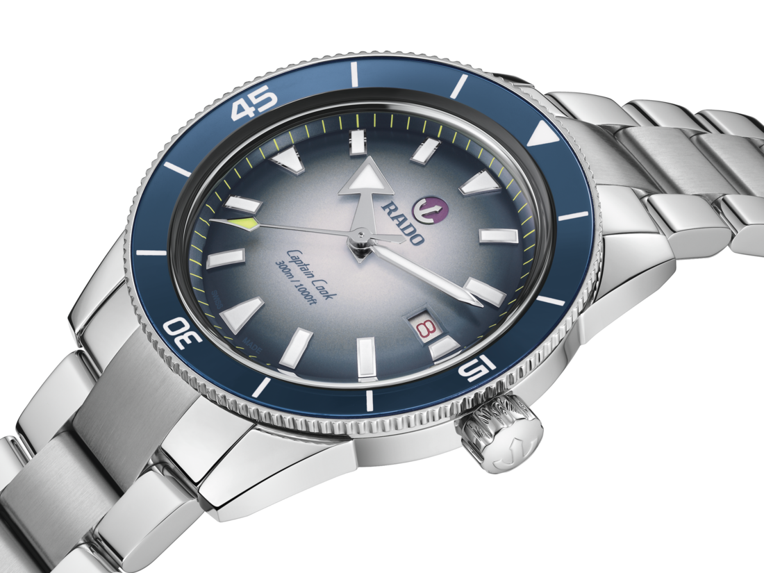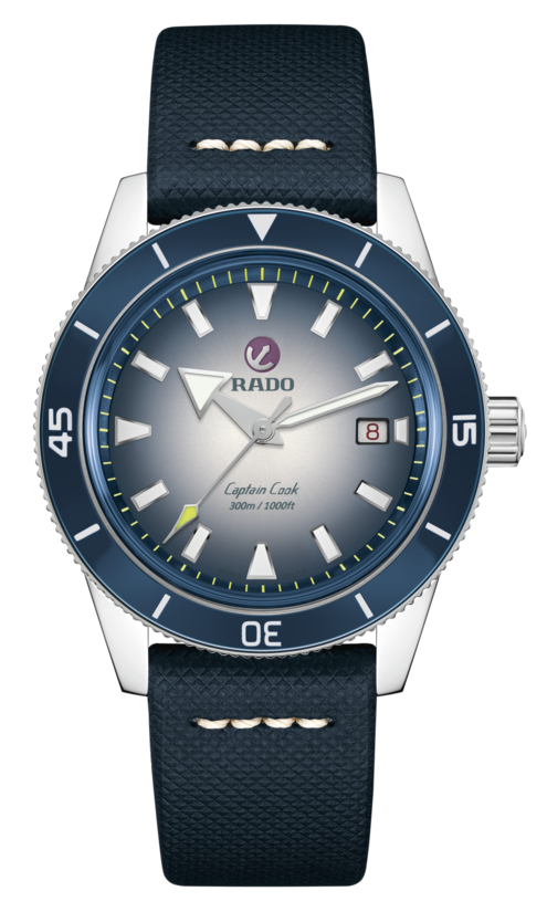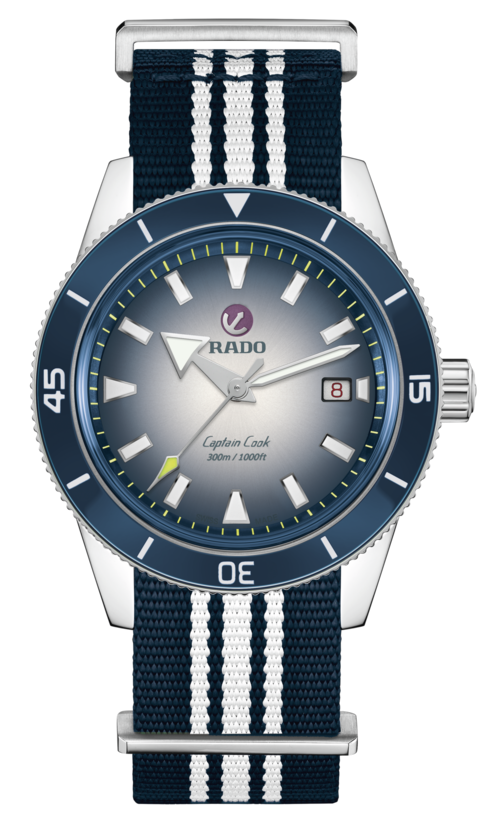 Captain Cook库克船长自动机械腕表采用42毫米抛光精钢表壳和表冠。腕表顶部采用抛光精钢旋转表圈,带有抛光蓝色高科技陶瓷衬片,刻有数字和时标且覆有哑光白色Super-LumiNova®夜光涂层。腕表搭载Rado R763型自动机械机芯,可提供最高长达80小时的动力储存。铑色时针和分针覆有白色Super-LumiNova®夜光涂层,而中央秒针的尖端则选择了黄色的Super-LumiNova®夜光涂层,呼应了网球的颜色,增添了一份俏皮感。Captain Cook库克船长自动机械腕表配备精钢表链和蓝色皮革表袋。腕表可选择搭配经典的蓝色皮革表带或蓝白相间的NATO风格织物表带。