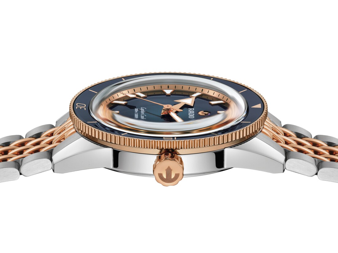 初代Captain Cook库克船长系列腕表问世于1962年,至今仍是当代新作的灵感源泉。复古潜水表外观以色彩俘获人心:精钢表链的玫瑰金色中间链节、玫瑰金色旋转表圈与表冠,为抛光蓝色高科技陶瓷衬片增添璀璨光华。盒形蓝宝石玻璃表镜框饰黑至蔚蓝渐变表盘,玫瑰金色刻度与指针覆有Super-LumiNova夜光涂层。这款对经典原作的迷人诠释,由Rado瑞士雷达表R763型机芯驱动,这枚镶嵌25颗宝石的三针自动机械机芯配备Nivachron防磁游丝,确保卓越可靠性与更高精准度。39毫米直径精钢表壳具备30巴(300米)防水性能,与现有37毫米及42毫米表壳尺寸相辅相成,延续Captain Cook库克船长系列魅力,适配多种腕围。配备米粒状精钢表链,这款当代Captain Cook库克船长系列腕表奏响你的冒险号角。