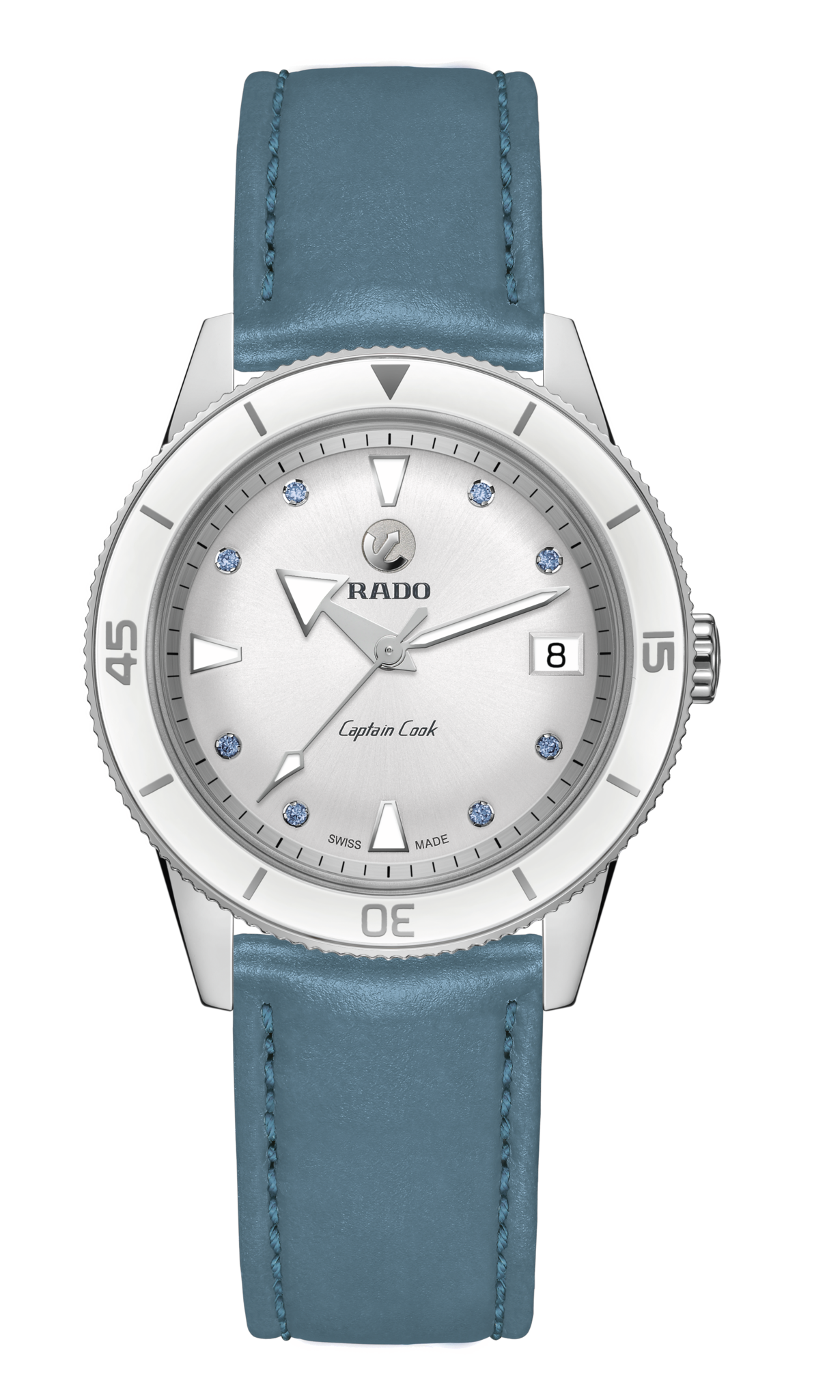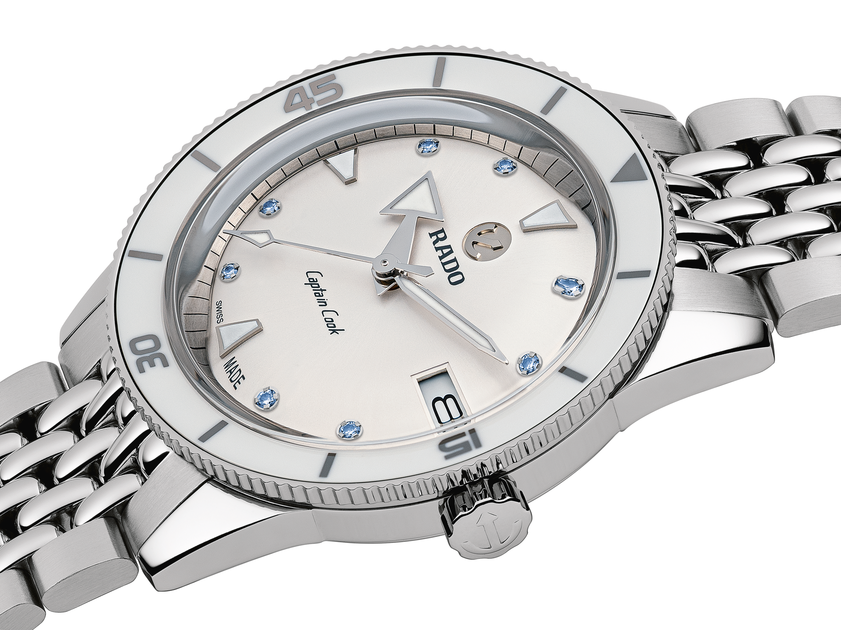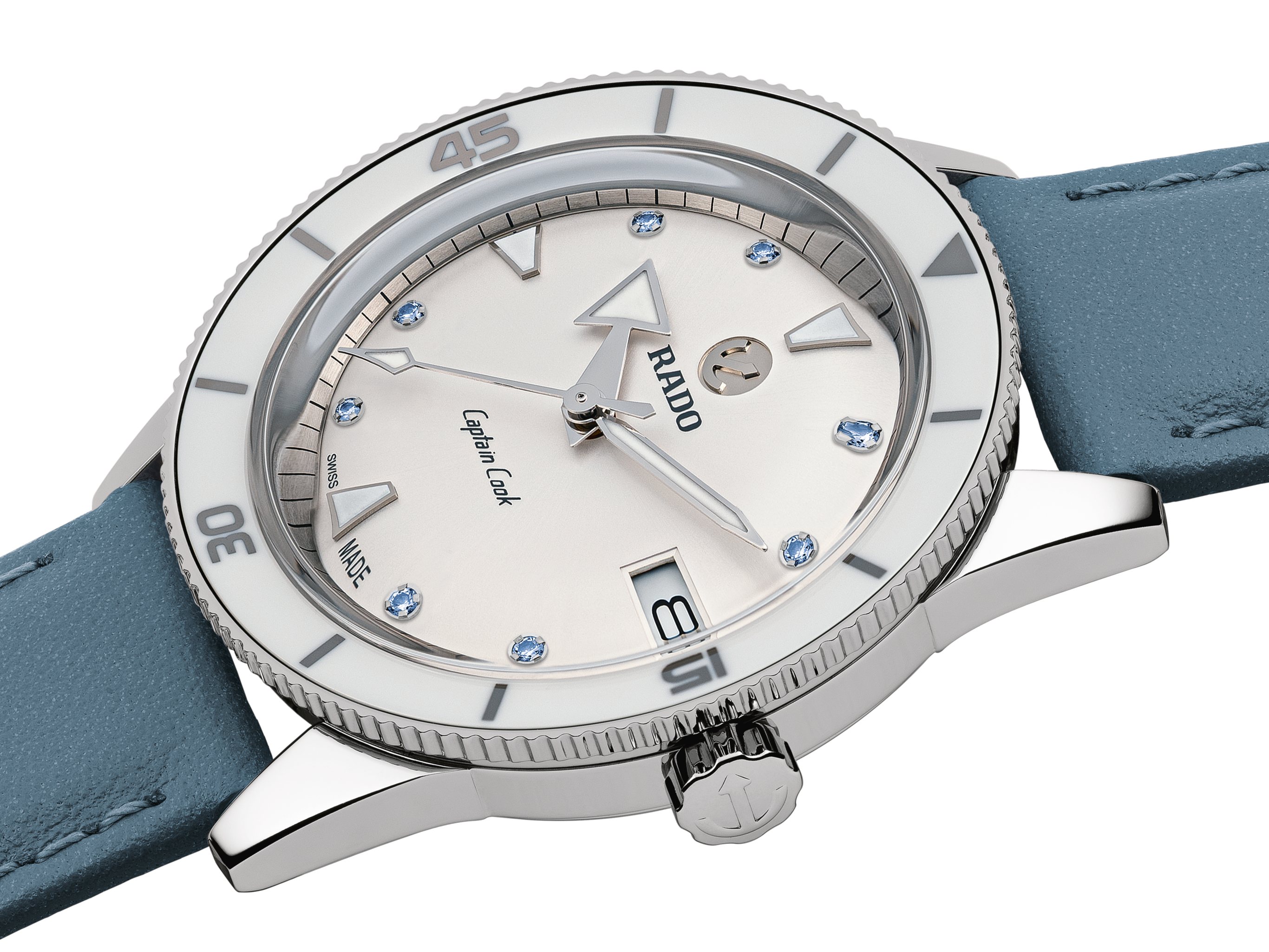全新Rado瑞士雷达表库克船长自动机械腕表是对标志性Rado瑞士雷达表时计的当代诠释。雪白色表盘上镶有八颗冰蓝色蓝宝石时标,表盘周围为白色高科技陶瓷镶嵌表圈。腕表配备三款表带——米粒状精钢表链、浅蓝色Nato表带或带有蓝色缝线的蓝色皮革表带——借助Rado瑞士雷达表表带快速更换(Easy Clip)系统,可以轻松快速地更换表带。