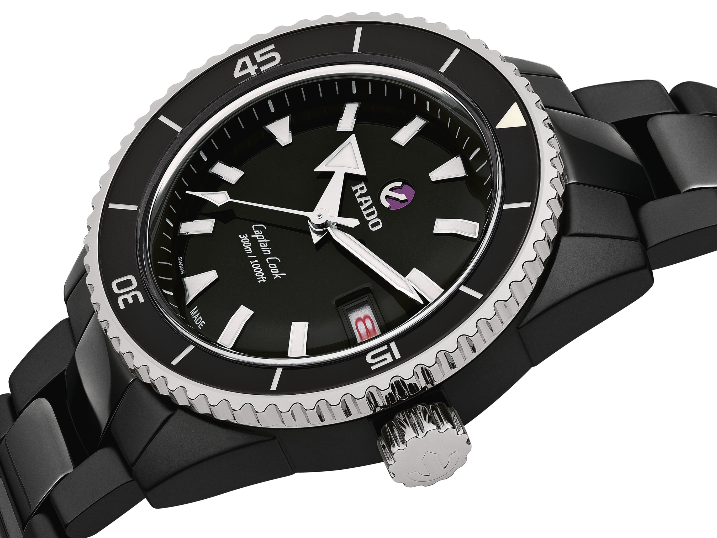 Captain Cook库克船长高科技陶瓷潜水腕表的防水性能经ISO 6425认证,深达300米。指针与刻度覆有Super-LumiNova®夜光涂层,与黑色漆面抛光表盘形成鲜明对比,确保佩戴者能够轻松读取时间。一体成型表壳直径43毫米,由哑光黑色高科技陶瓷制成,旋转表圈则采用抛光硬化精钢材质。腕表搭载Rado R763自动机芯,较标准精准度测试要求超出整整五分,动力储存长达80小时。这一款式搭配抛光黑色高科技陶瓷表链。无论您将去哪儿探索,Captain Cook库克船长高科技陶瓷潜水腕表都将是可靠而坚韧、能始终陪伴同行的伙伴。