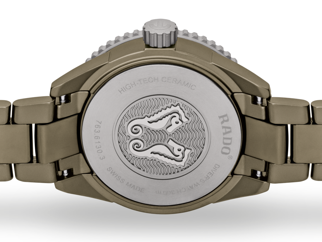 Captain Cook库克船长高科技陶瓷潜水腕表的防水性能经ISO 6425认证,深达300米。指针与刻度覆有Super-LumiNova®夜光涂层,与哑光橄榄绿色表盘形成鲜明对比,确保佩戴者能够轻松读取时间。一体成型表壳直径43毫米,由哑光橄榄绿色高科技陶瓷制成,旋转表圈则采用抛光硬化精钢材质。腕表搭载Rado R763自动机芯,较标准精准度测试要求超出整整五分,动力储存长达80小时。这一款式搭配哑光橄榄绿色高科技陶瓷表链。无论您将去哪儿探索,Captain Cook库克船长高科技陶瓷潜水腕表都将是可靠而坚韧、能始终陪伴同行的伙伴。