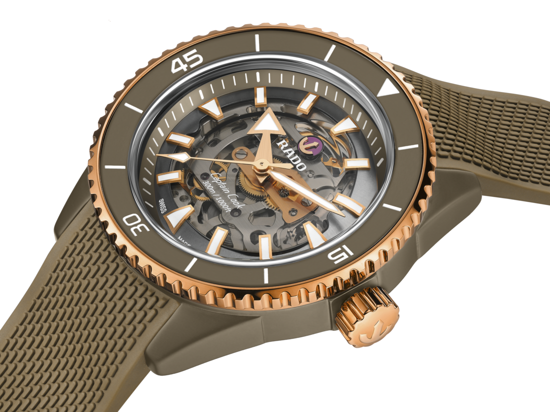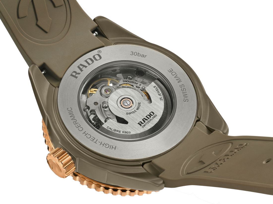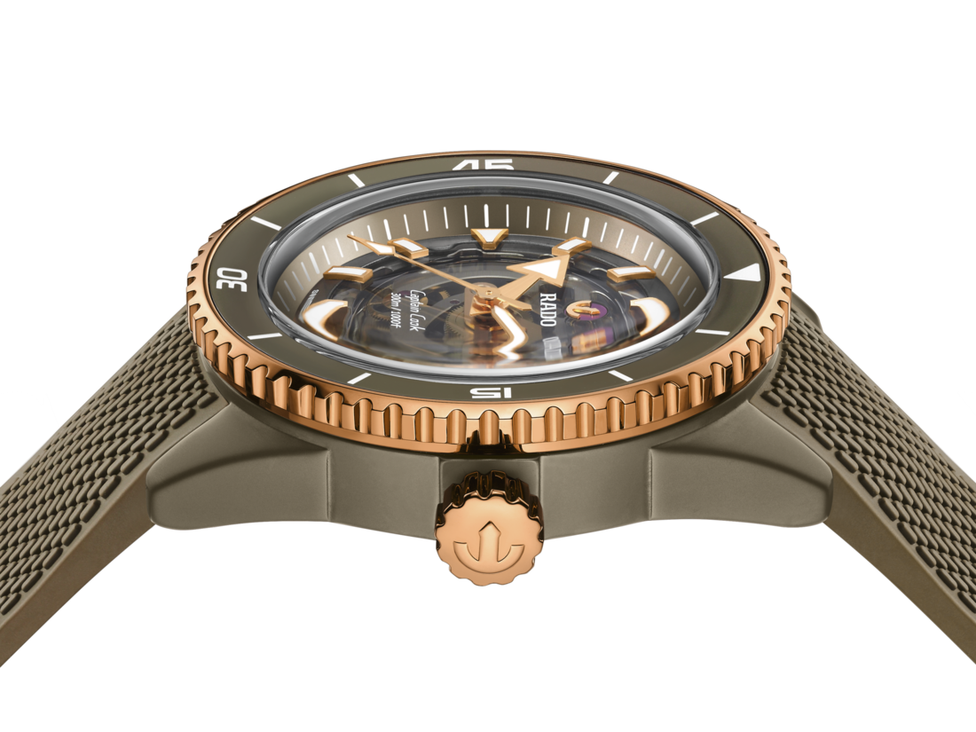 Captain Cook库克船长高科技陶瓷镂空腕表搭载创新的R808机芯,拥有鲜明的特色、精湛的技术和巧妙的几何形状,让爱表人士可以清楚鉴赏各个零件的细节。腕表搭载精准可靠的NivachronTM防磁游丝,且在五个方位进行了全面测试,能够提供最高长达80小时的动力储存。精美的哑光橄榄绿高科技陶瓷一体成型表壳,搭配玫瑰金色可旋转表圈,内嵌哑光橄榄绿陶瓷衬片与表壳和表冠相得益彰,营造出和谐的视觉效果。表盘简洁明了,几何刻度和时针/分针/秒针均为玫瑰金色,并覆有白色Super-LumiNova®夜光涂层,在昏暗的环境下亦能确保可读性。新款Captain Cook库克船长腕表搭配橄榄色橡胶表带和高科技陶瓷扣面,展现出其运动风格的一面。