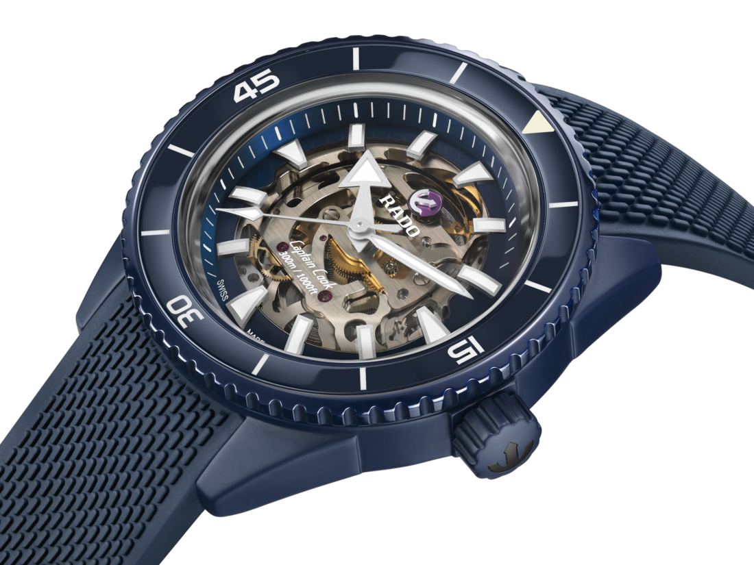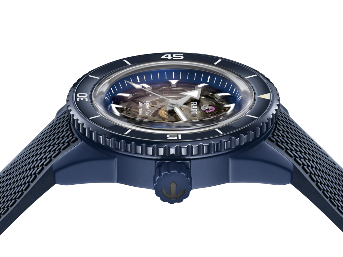 Captain Cook库克船长高科技陶瓷镂空腕表搭载创新的R808机芯,拥有鲜明的特色、精湛的技术和巧妙的几何形状,让爱表人士可以清楚鉴赏各个零件的细节。腕表搭载高度可靠的防磁NivachronTM游丝,且进行了五方位全面调教,提供长达80小时的动力储存。精美的哑光海军蓝高科技陶瓷一体成型表壳,搭配抛光海军蓝高科技陶瓷可旋转表圈,内嵌海军蓝陶瓷衬片与表壳和表冠相得益彰,营造出和谐的视觉效果。表盘清晰简洁,配有宽大的几何设计刻度和铑色时/分/秒针,并覆有白色Super-LumiNova®夜光涂层,确保在低光源条件下依然能够清晰读时。新款Captain Cook库克船长腕表搭配海军蓝橡胶表带和高科技陶瓷表扣盖,展现出活力动感的一面。