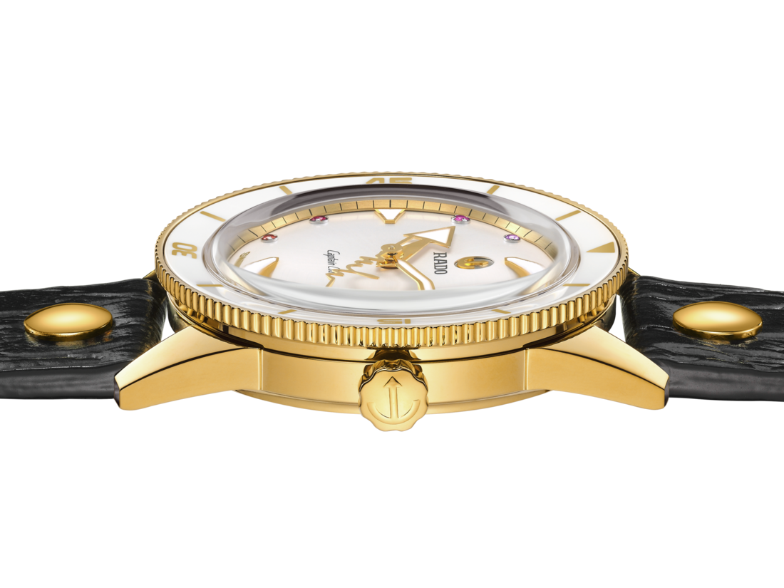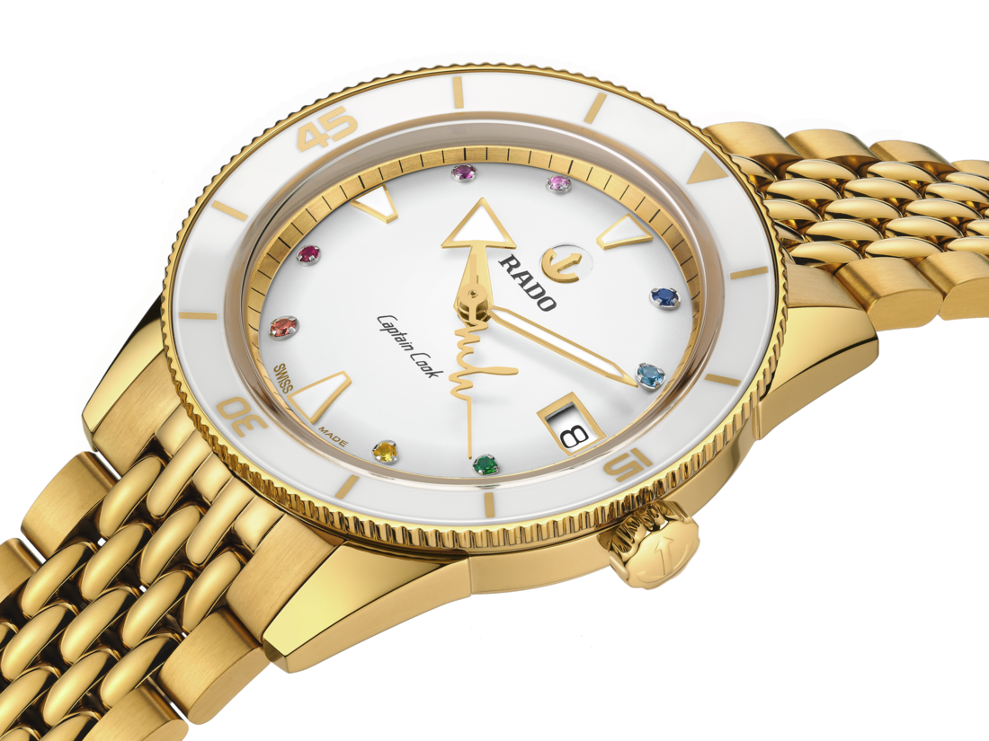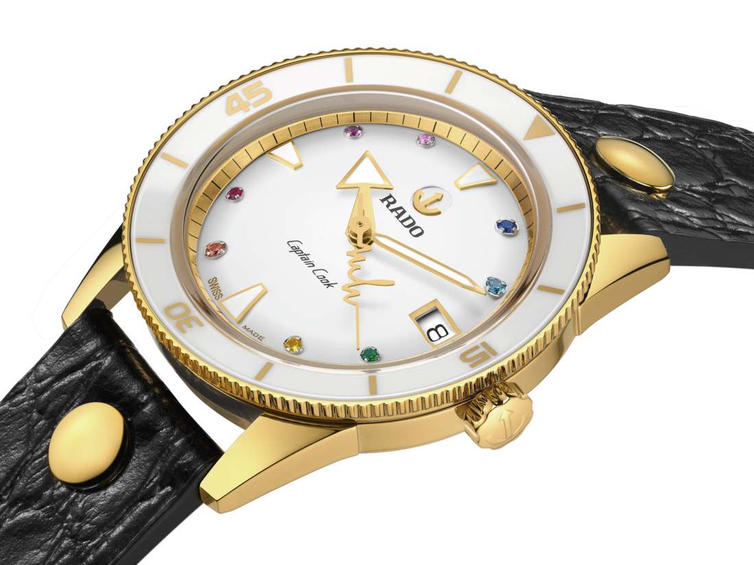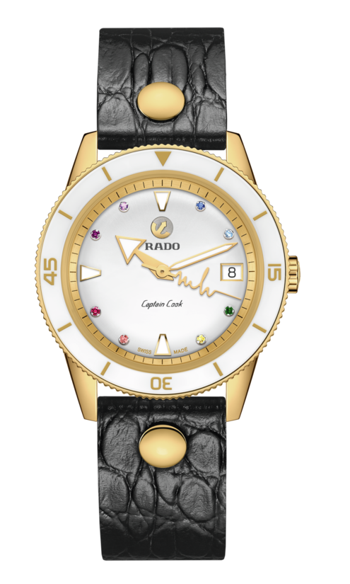 Rado瑞士雷达表Captain Cook库克船长系列设计师合作款腕表 「金虹库克」,已经是品牌与玛丽娜 霍尔曼塞德携手推出的第二款特别版合作腕表。这位屡获大奖的奥地利时装设计师,在演艺圈享有盛名,曾为众多名人设计过服装。如今这款与众不同的女士腕表,采用黄金色的表壳和风格装饰,搭配柔美的白色高科技陶瓷表圈,以及镶嵌了八颗彩虹石的表盘。黄金色秒针拥有玛丽娜独有的心跳标志形状。 这款37毫米的腕表配备两条皮革表带,其中一条在双倍长度且印制鳄鱼纹压花的小牛皮表带上,运用了设计师经典表扣。腕表配有品牌黑色表袋,以供收纳。