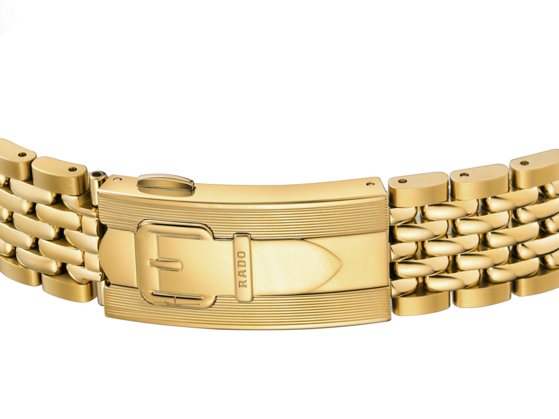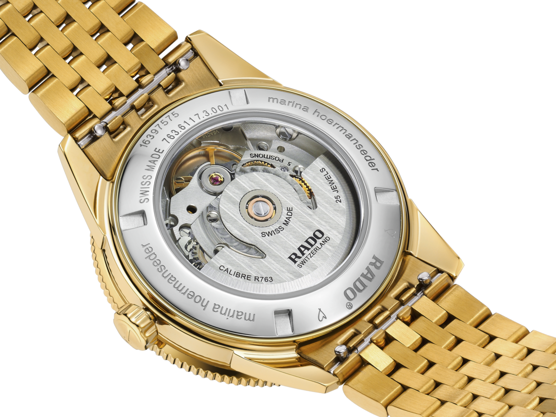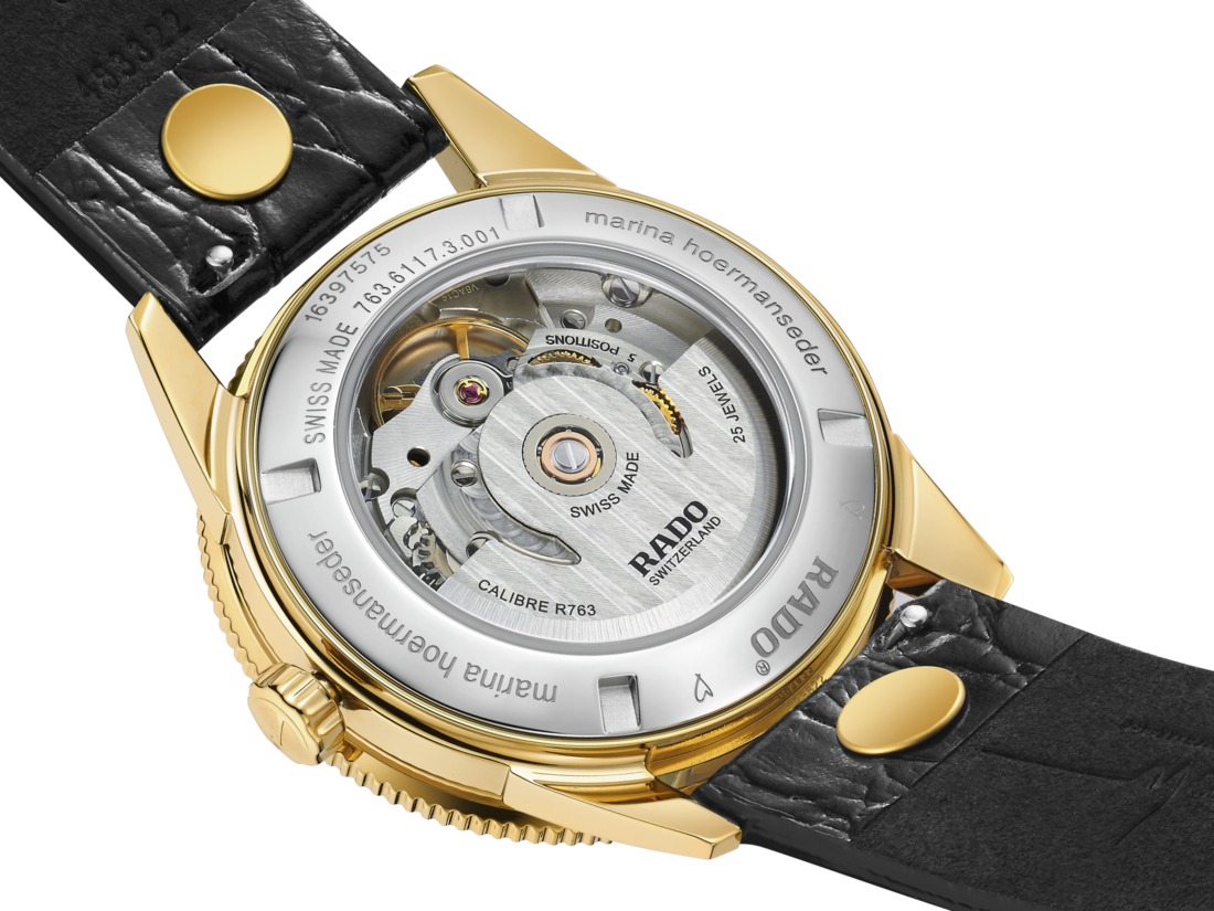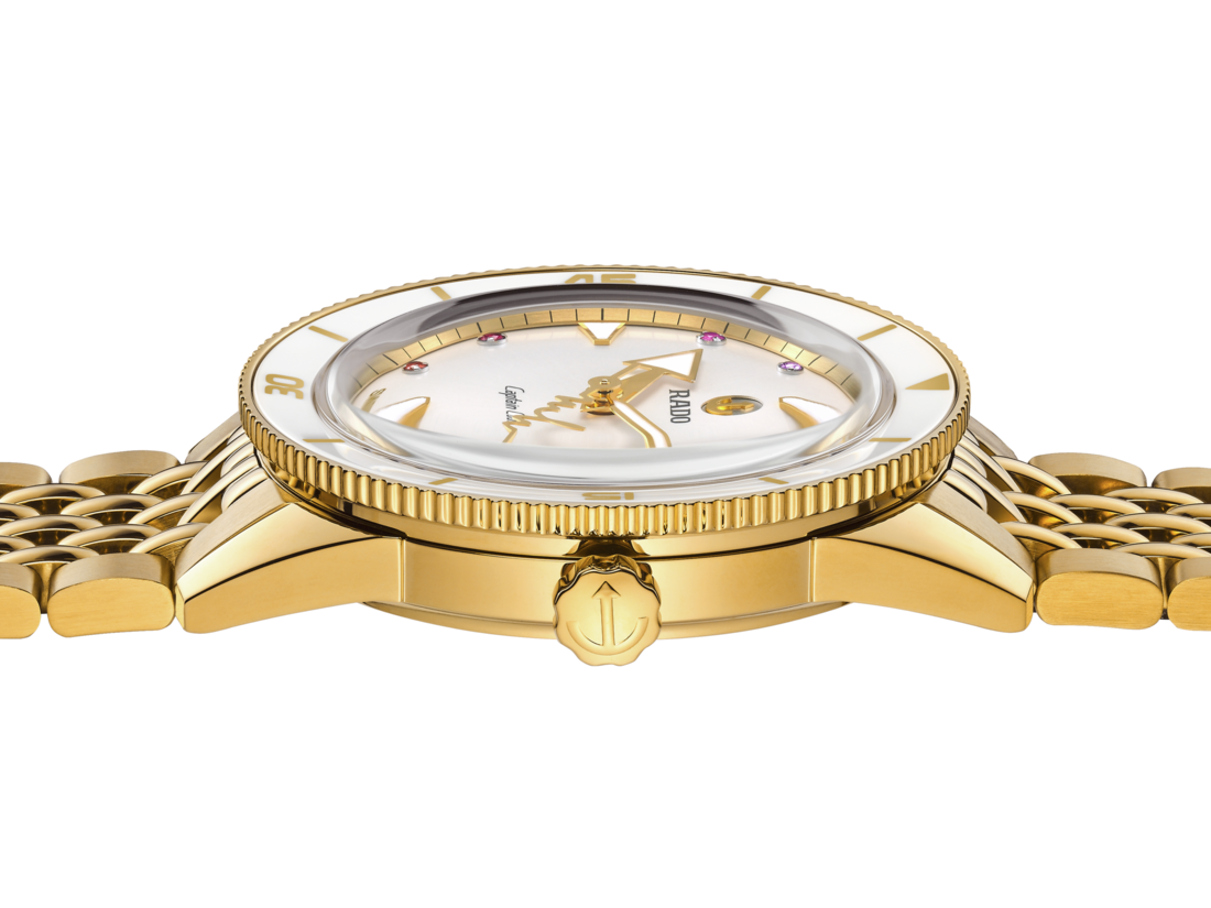 Rado瑞士雷达表Captain Cook库克船长系列设计师合作款腕表 「金虹库克」,已经是品牌与玛丽娜 霍尔曼塞德携手推出的第二款特别版合作腕表。这位屡获大奖的奥地利时装设计师,在演艺圈享有盛名,曾为众多名人设计过服装。如今这款与众不同的女士腕表,采用黄金色的表壳和风格装饰,搭配柔美的白色高科技陶瓷表圈,以及镶嵌了八颗彩虹石的表盘。黄金色秒针拥有玛丽娜独有的心跳标志形状。 这款37毫米的腕表配备两条皮革表带,其中一条在双倍长度且印制鳄鱼纹压花的小牛皮表带上,运用了设计师经典表扣。腕表配有品牌黑色表袋,以供收纳。