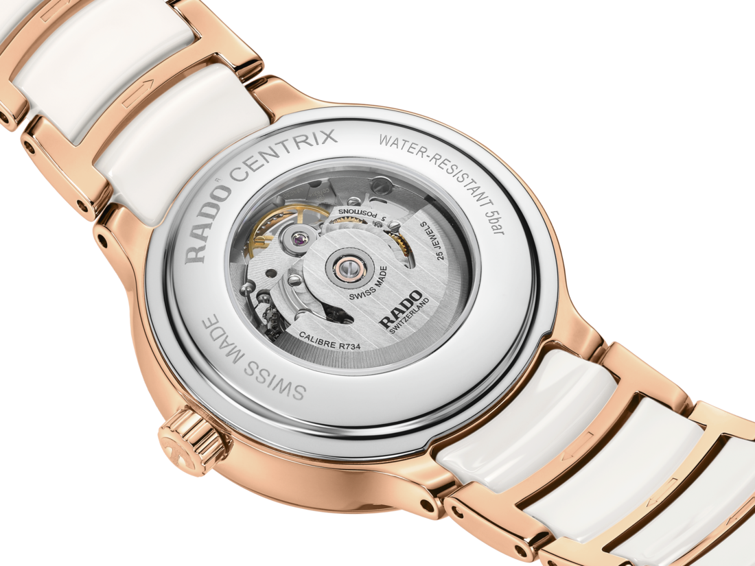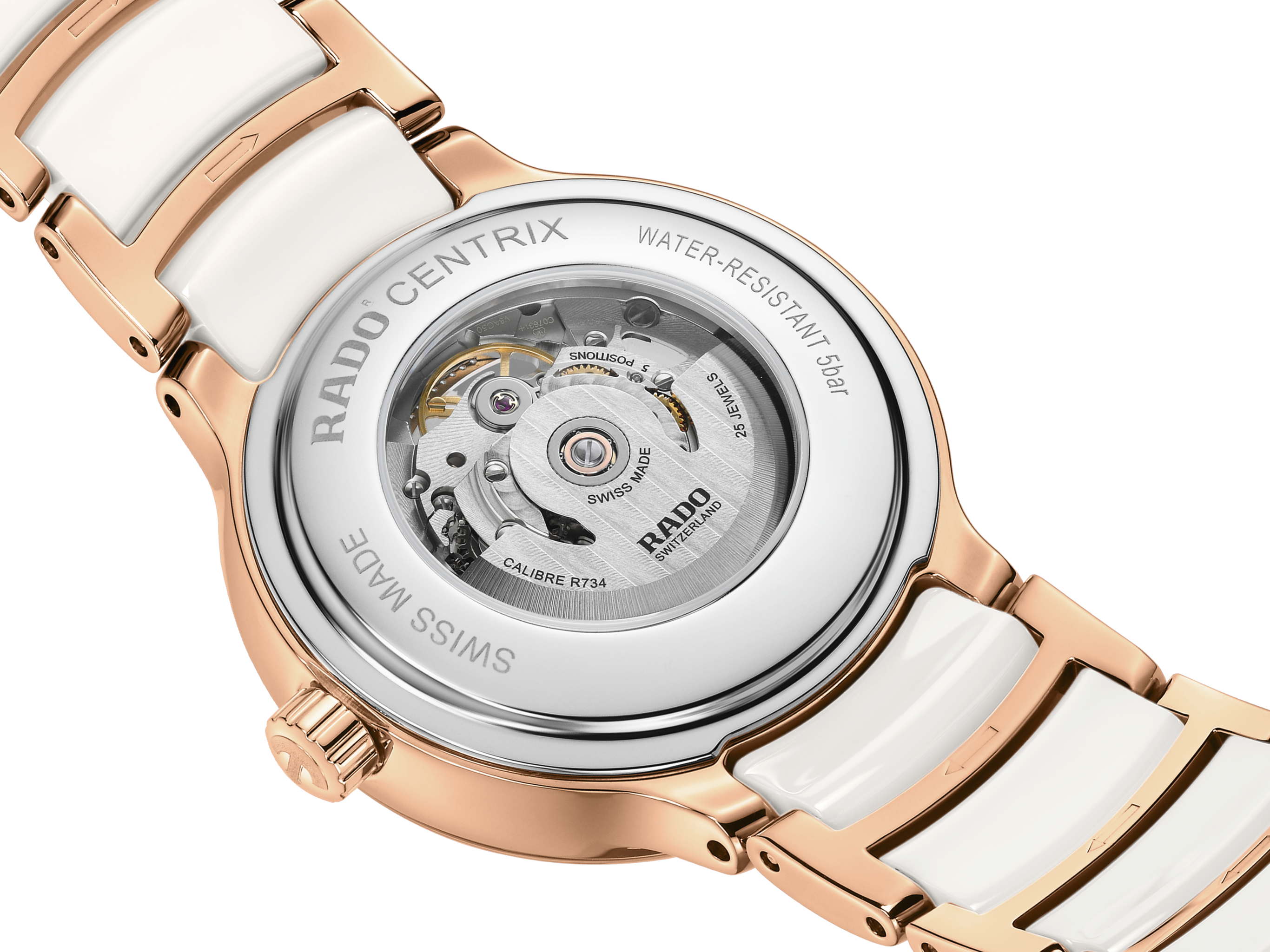戴上Centrix晶萃系列开芯腕表,切身感受艺术与设计的美妙融合。当星座在天上书写故事的同时,也为恋人搭起了一座座相会的桥梁。表盘的窗口,令人同时联想到黎明和黄昏,美轮美奂地烘托出 R734 型自动机械机芯,拥有最高长达 80 小时的动力储存,搭载 Nivachron™防磁游丝。精心制作的零件表面上,还饰有优雅深邃的波纹阳光“ondulé soleil”图案。这款标志性的腕表在表耳和表链处都经过调整,表链由玫瑰金色PVD镀层精钢和白色高科技陶瓷中间链节制成,令这款经典时计的整体外观更加美妙。白色珍珠母贝表盘镶嵌着12颗钻石,印有玫瑰金色“jubilé”标志,与指针巧妙搭配。腕表防水深度高达50米。
