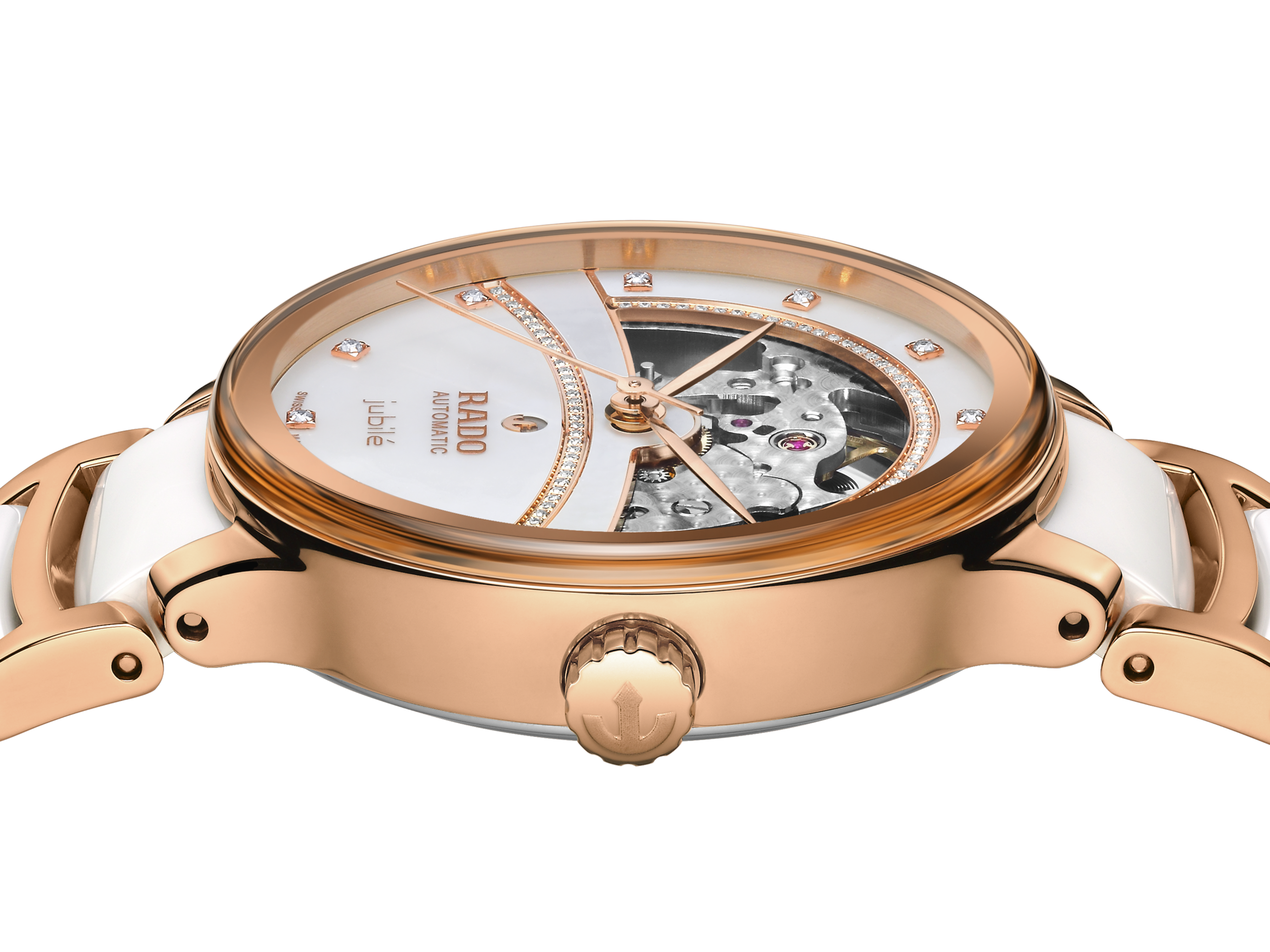 戴上Centrix晶萃系列开芯腕表,切身感受艺术与设计的美妙融合。表盘的窗口,令人同时联想到黎明和黄昏,美轮美奂地烘托出 R734 型自动机械机芯,拥有最高长达 80 小时的动力储存,搭载 Nivachron™防磁游丝。精心制作的零件表面上,还饰有优雅深邃的波纹阳光“ondulé soleil”图案。这款标志性的腕表在表耳和表链处都经过调整,表链由玫瑰金色PVD镀层精钢和白色高科技陶瓷中间链节制成,令这款经典时计的整体外观更加美妙。白色珍珠母贝表盘镶嵌着12颗钻石,印有玫瑰金色“jubilé”标志,与指针巧妙搭配。“Super Jubilé”的表款则在表桥的下拱处,增加了一条璀璨迷人的钻石流线,精致又细腻,将美妙的爱情宣言娓娓道来。腕表防水深度高达50米。