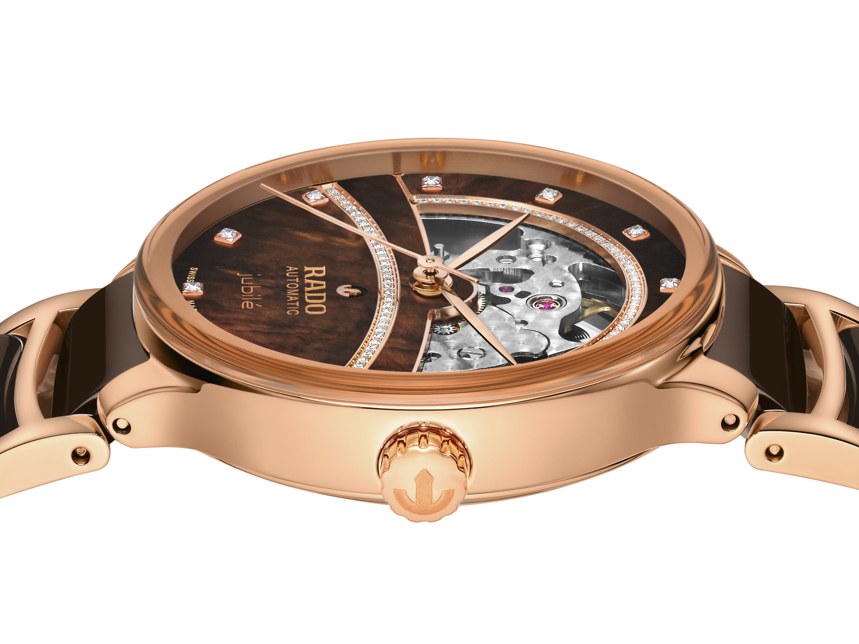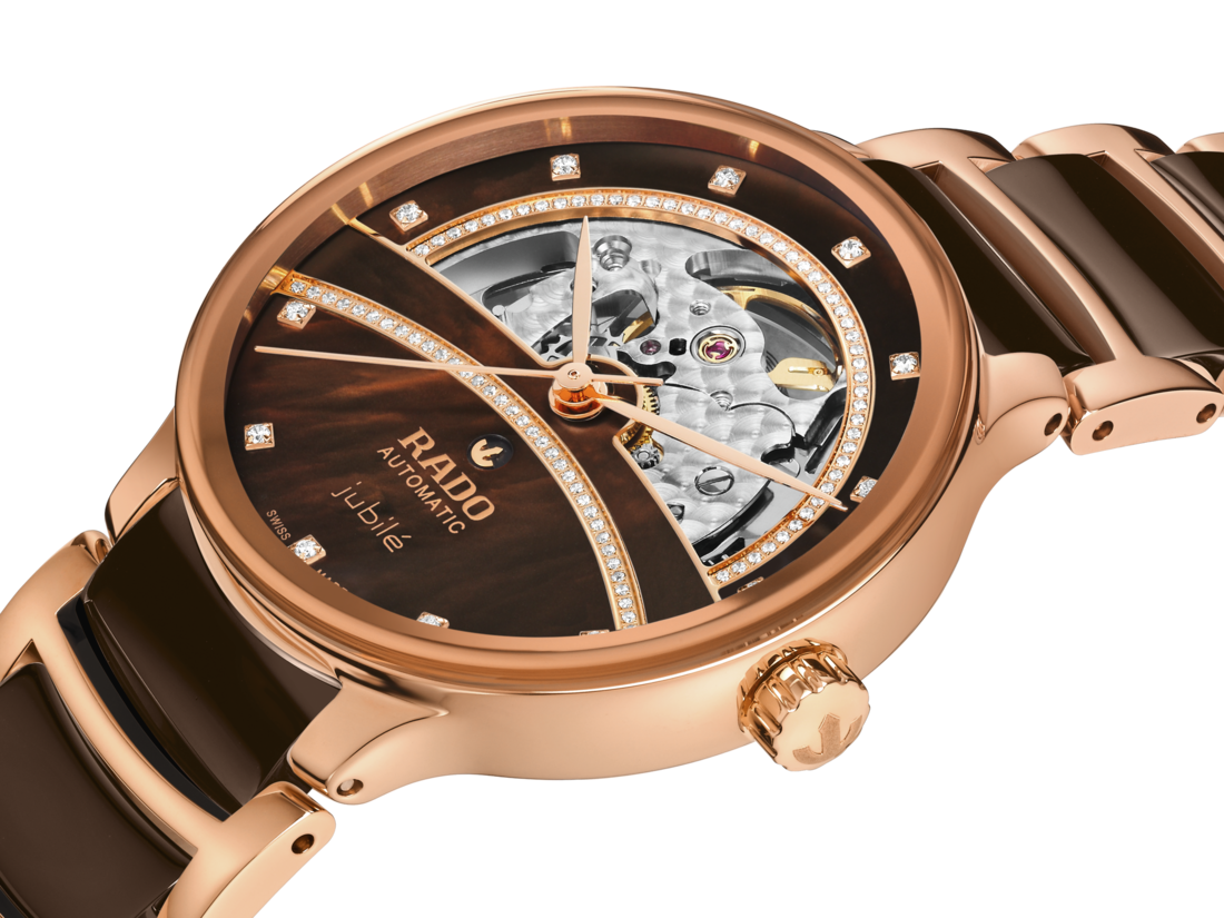 戴上Centrix晶萃系列开芯腕表,切身感受艺术与设计的美妙融合。表盘的窗口,令人同时联想到黎明和黄昏,美轮美奂地烘托出 R734 型自动机械机芯,拥有最高长达 80 小时的动力储存,搭载 Nivachron™防磁游丝。精心制作的零件表面上,还饰有优雅深邃的波纹阳光“ondulé soleil”图案。这款标志性的腕表在表耳和表链处都经过调整,表链由玫瑰金色PVD镀层精钢和棕色高科技陶瓷中间链节制成,令这款经典时计的整体外观更加美妙。深棕色珍珠母贝表盘镶嵌着12颗钻石,印有玫瑰金色“jubilé”标志,与指针巧妙搭配。“Super Jubilé”的表款则在表桥的下拱处,增加了一条璀璨迷人的钻石流线,精致又细腻,将美妙的爱情宣言娓娓道来。 腕表防水深度高达50米。