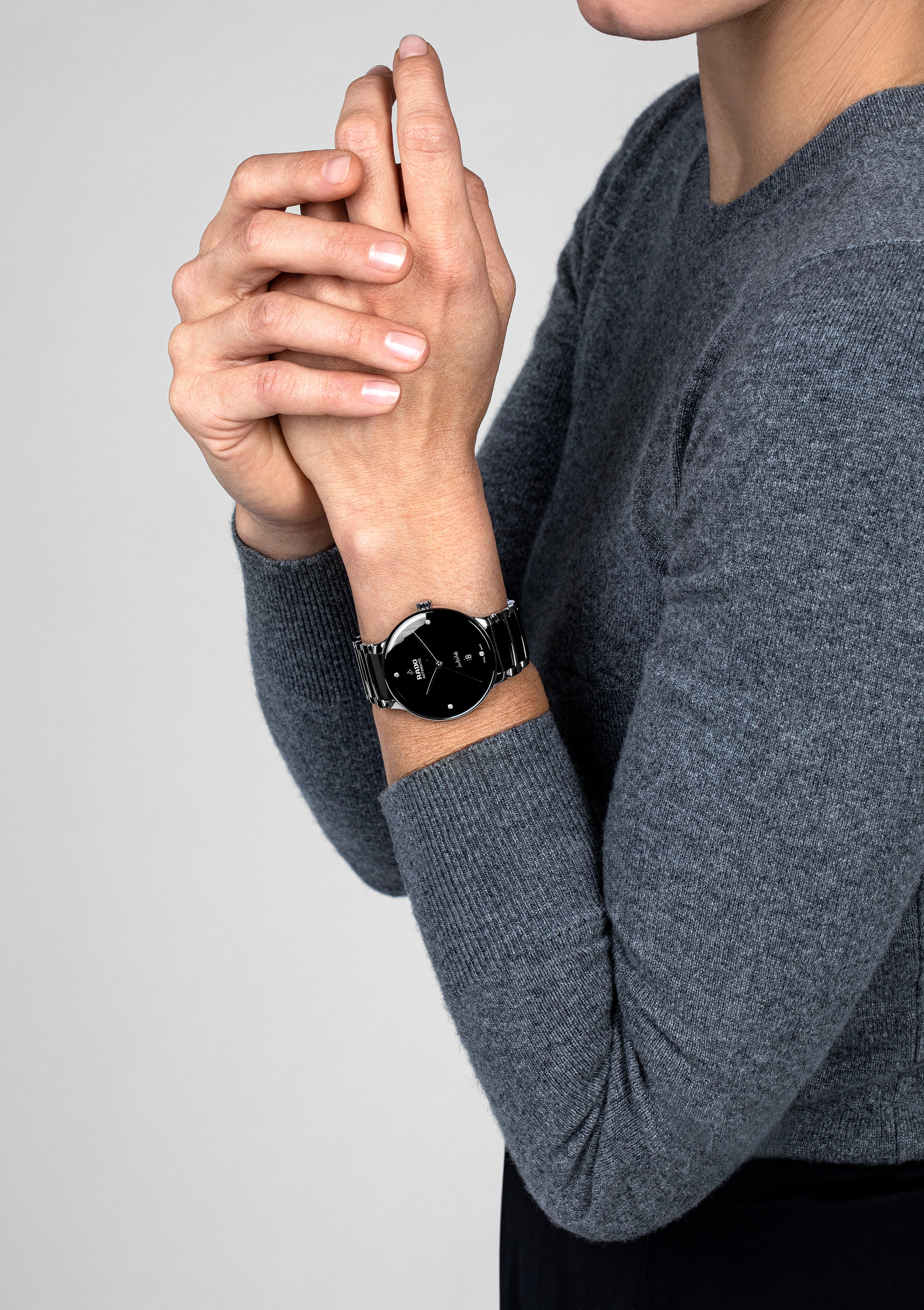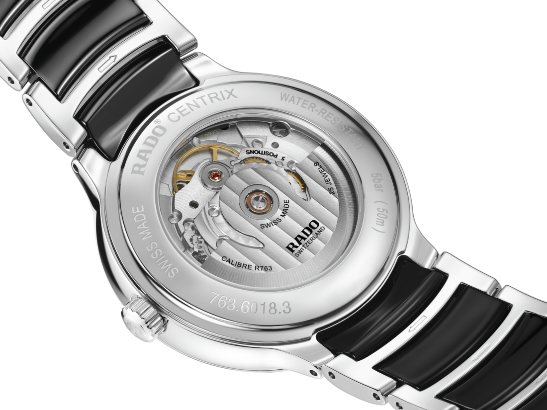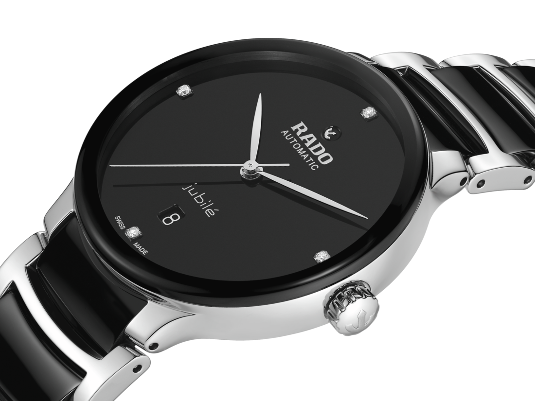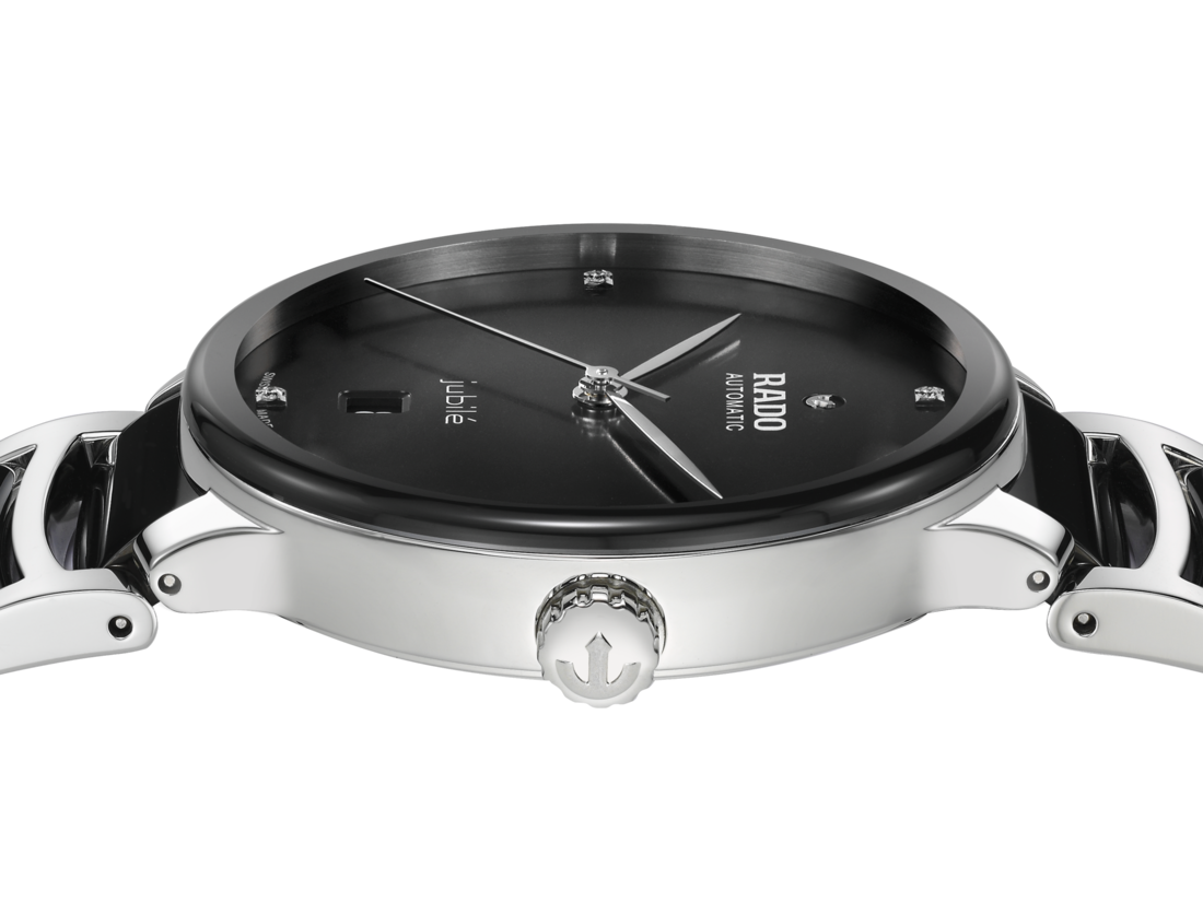 经典Centrix晶萃系列镶钻自动机械腕表不仅在技术上进行调整,亦在美学上予以重新设计。修改后的表款,拥有一个圆形的无边框蓝宝石水晶玻璃表镜,以及一个与弧形水晶边缘浑然天成的弧形表壳。调整后的表耳和搭配黑色高科技陶瓷中央链节的抛光精钢表链,令这款经典时计的整体外观更臻完美。黑色漆面表盘镶嵌着4颗钻石,印有“jubilé”标志,与铑色指针完美搭配。由于搭载Nivachron™防磁游丝,使这款R763型三针机芯在3至5个位置上远超标准测试要求,实现更高的可靠性和精确度。这款腕表防水深度可达50米,并提供80小时的动力储存。
