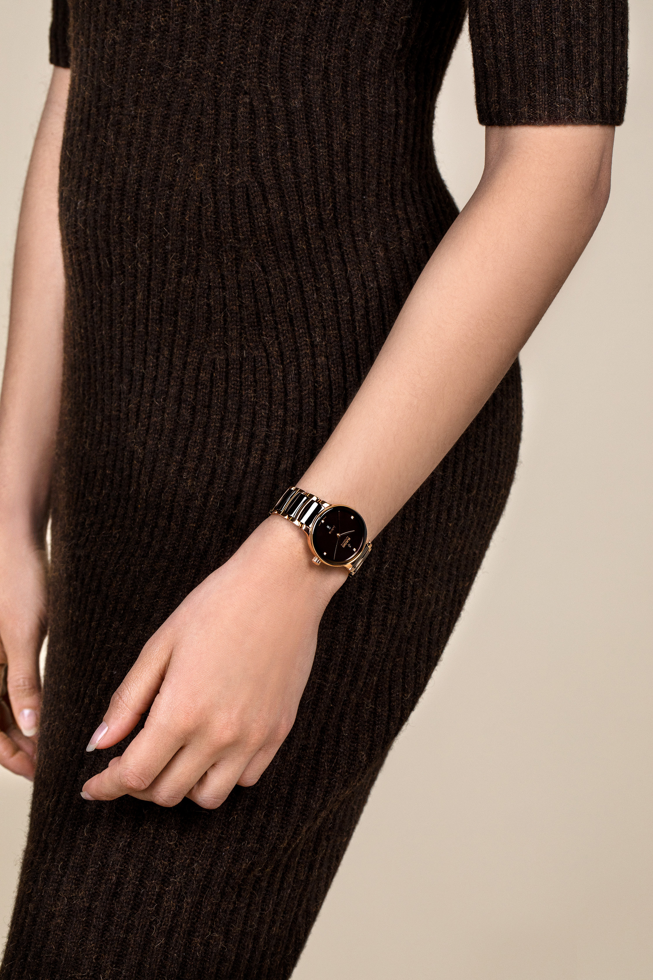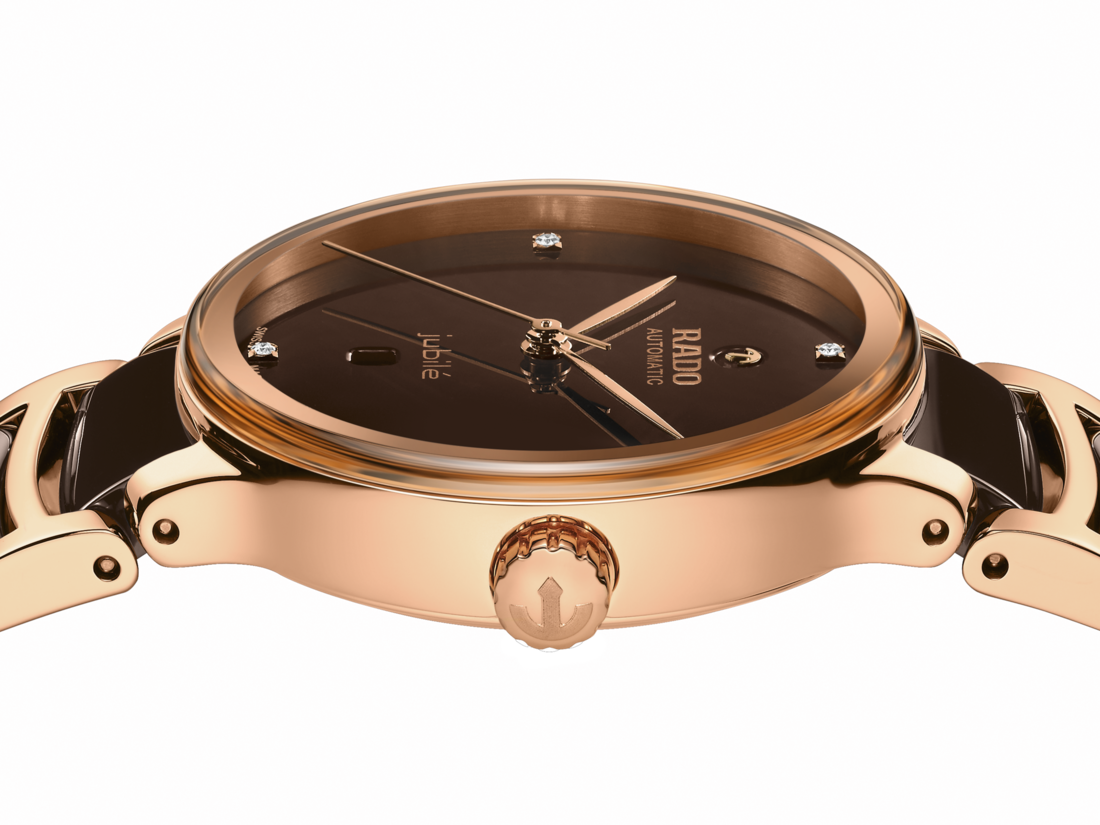 经典Centrix晶萃系列镶钻自动机械腕表不仅在技术上进行调整,亦在美学上予以重新设计。修改后的表款,拥有一个圆形的无边框蓝宝石水晶玻璃表镜,以及一个与弧形水晶边缘浑然天成的弧形表壳。调整后的表耳和搭配棕色高科技陶瓷中央链节的抛光玫瑰金PVD涂层精钢表链,令这款经典时计的整体外观更臻完美。棕色漆面表盘镶嵌着4颗钻石,印有“jubilé”标志,与玫瑰金色指针完美搭配。由于搭载Nivachron™防磁游丝,使这款R582型三针机芯在3至5个位置上远超标准测试要求,实现更高的可靠性和精确度。这款腕表防水深度可达50米,并提供48小时的动力储存。