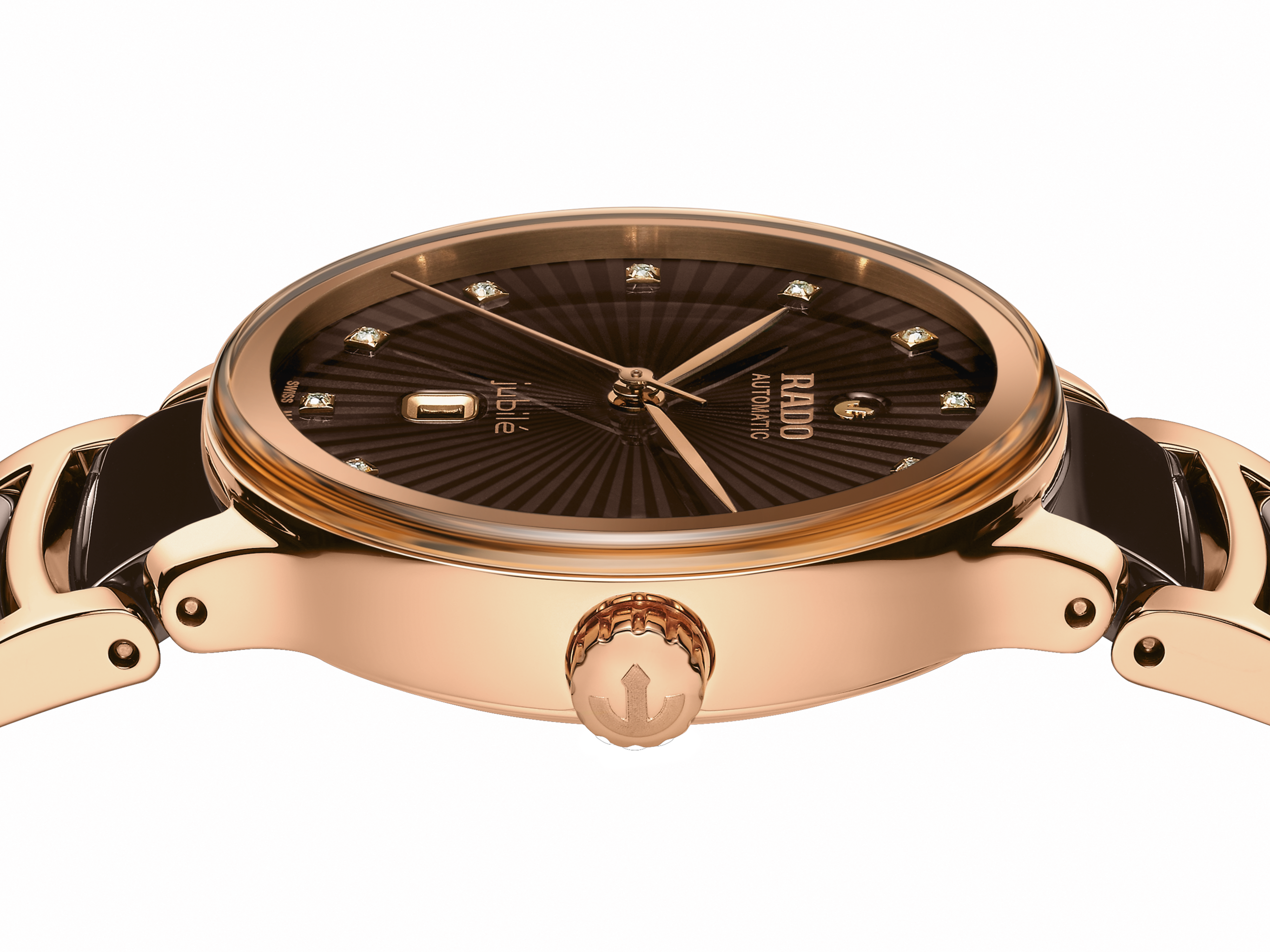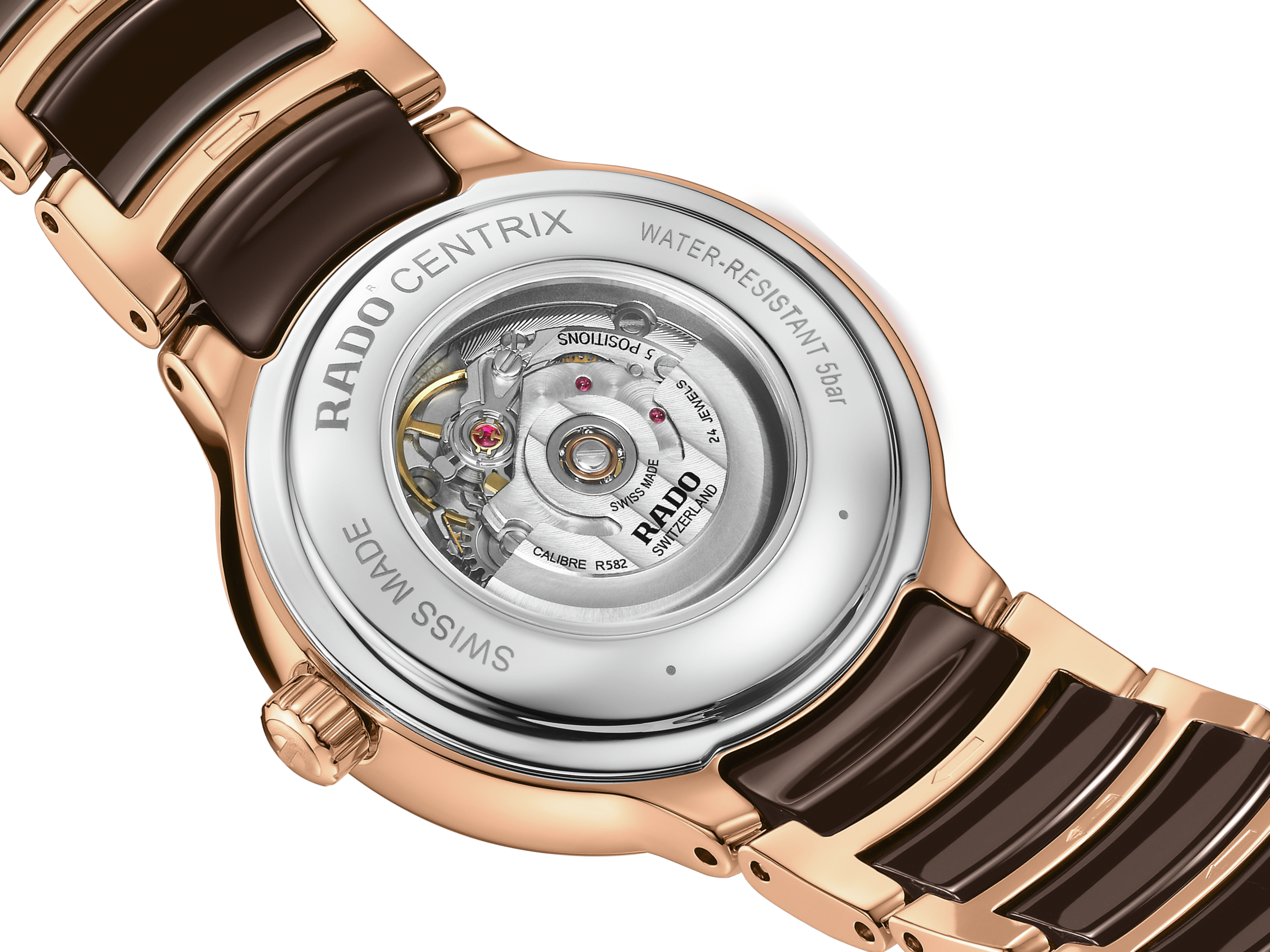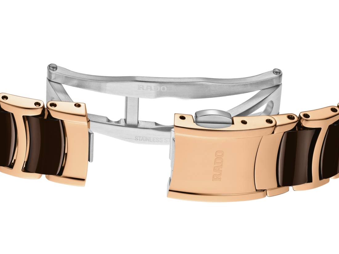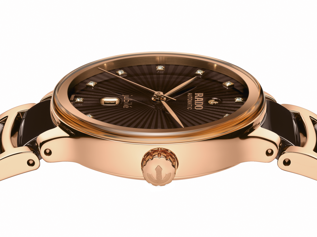 经典Centrix晶萃系列镶钻自动机械腕表不仅在技术上进行调整,亦在美学上予以重新设计。修改后的表款,拥有一个圆形的无边框蓝宝石水晶玻璃表镜,以及一个与弧形水晶边缘浑然天成的弧形表壳。调整后的表耳和搭配棕色高科技陶瓷中央链节的抛光玫瑰金PVD涂层精钢表链,令这款经典时计的整体外观更臻完美。表盘通过压印成型并以漆面填充,为棕色刻面表盘创造出华丽的3D效果。由于搭载Nivachron™防磁游丝,使这款R582型三针机芯在3至5个位置上远超标准测试要求,实现更高的可靠性和精确度。这款腕表防水深度可达50米,并提供48小时的动力储存。