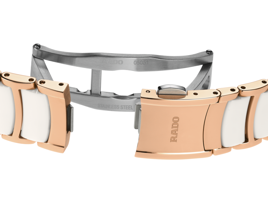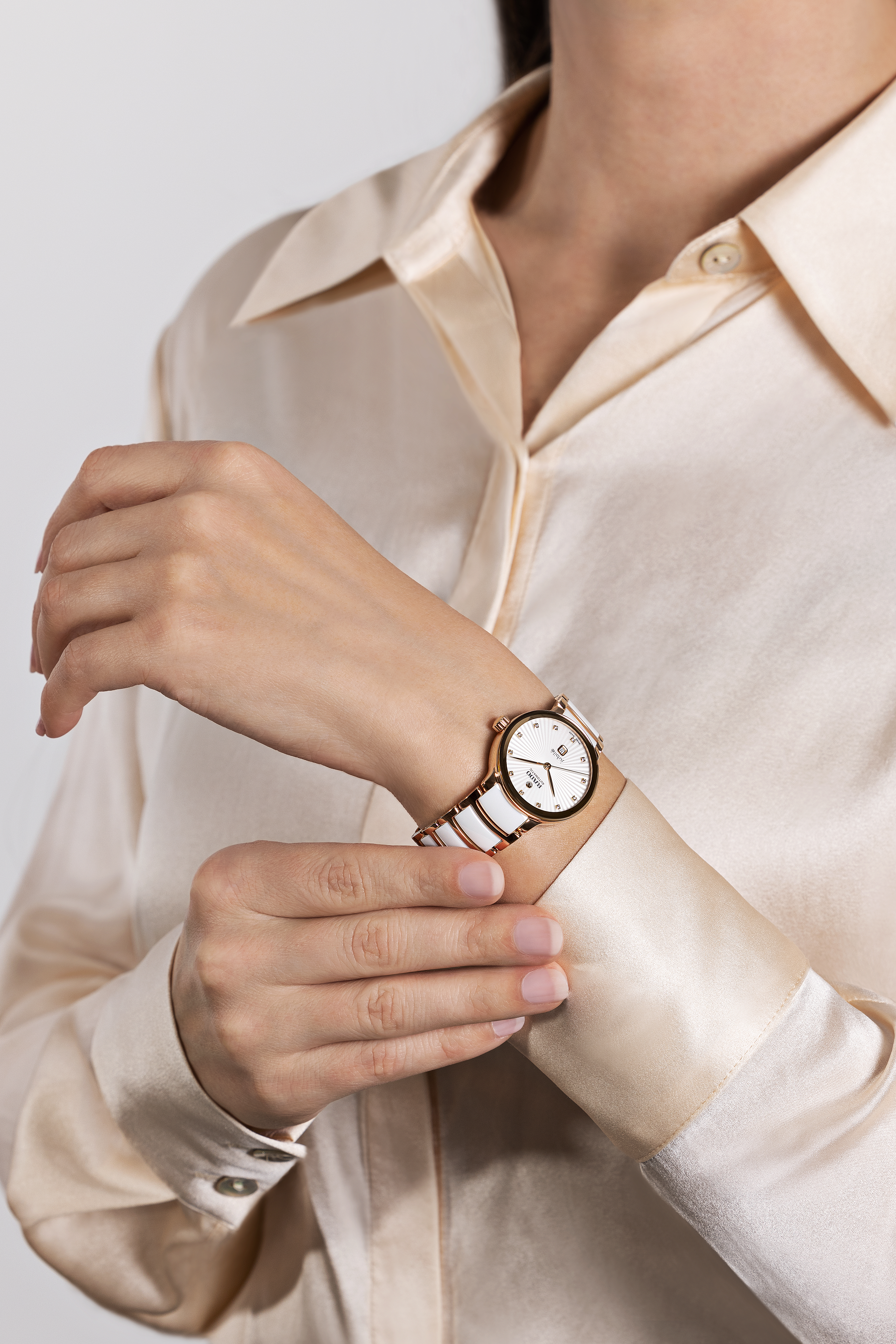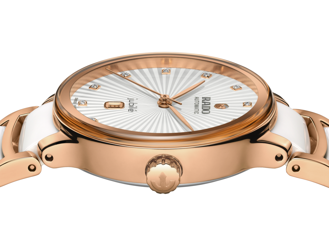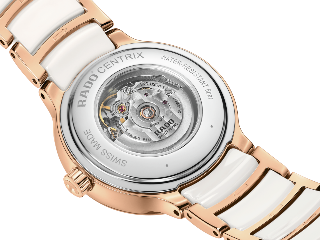 经典Centrix晶萃系列镶钻自动机械腕表不仅在技术上进行调整,亦在美学上予以重新设计。修改后的表款,拥有一个圆形的无边框蓝宝石水晶玻璃表镜,以及一个与弧形水晶边缘浑然天成的弧形表壳。调整后的表耳和搭配白色高科技陶瓷中央链节的抛光玫瑰金PVD涂层精钢表链,令这款经典时计的整体外观更臻完美。表盘通过压印成型并以漆面填充,为银色刻面表盘创造出华丽的3D效果。由于搭载Nivachron™防磁游丝,使这款R582型三针机芯在3至5个位置上远超标准测试要求,实现更高的可靠性和精确度。这款腕表防水深度可达50米,并提供48小时的动力储存。