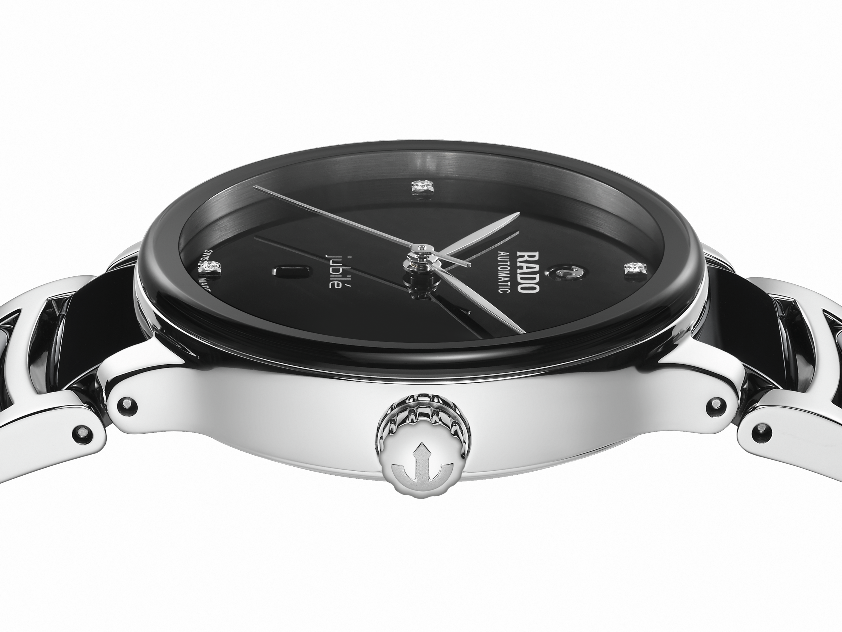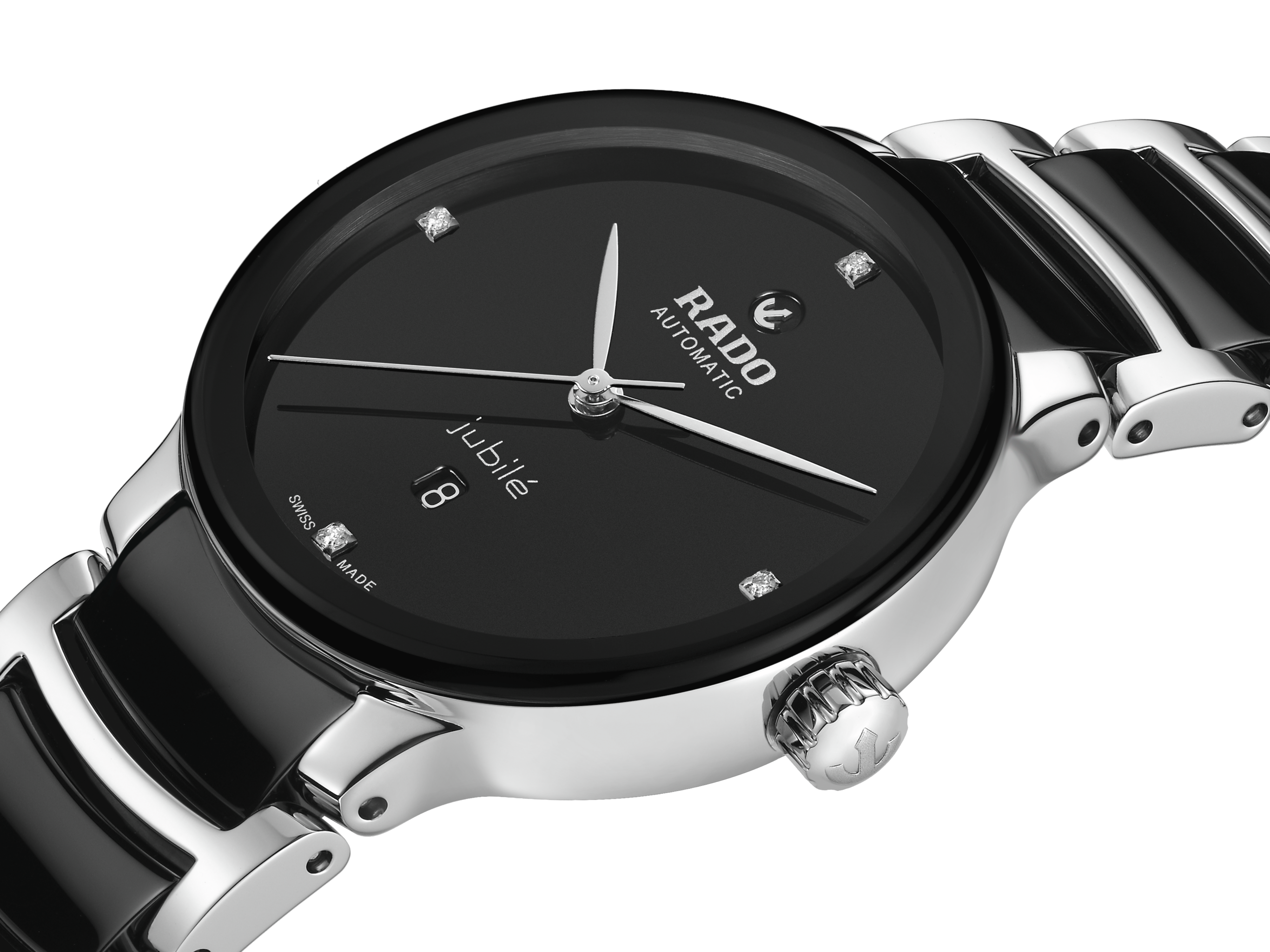 经典Centrix晶萃系列镶钻自动机械腕表不仅在技术上进行调整,亦在美学上予以重新设计。修改后的表款,拥有一个圆形的无边框蓝宝石水晶玻璃表镜,以及一个与弧形水晶边缘浑然天成的弧形表壳。调整后的表耳和搭配黑色高科技陶瓷中央链节的抛光精钢表链,令这款经典时计的整体外观更臻完美。黑色漆面表盘镶嵌着4颗钻石,印有“jubilé”标志,与铑色指针完美搭配。由于搭载Nivachron™防磁游丝,使这款R582型三针机芯在3至5个位置上远超标准测试要求,实现更高的可靠性和精确度。这款腕表防水深度可达50米,并提供48小时的动力储存。