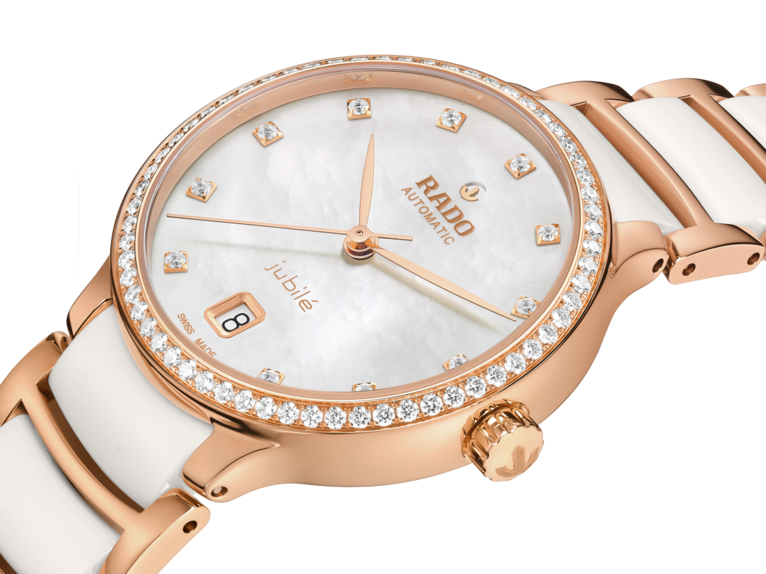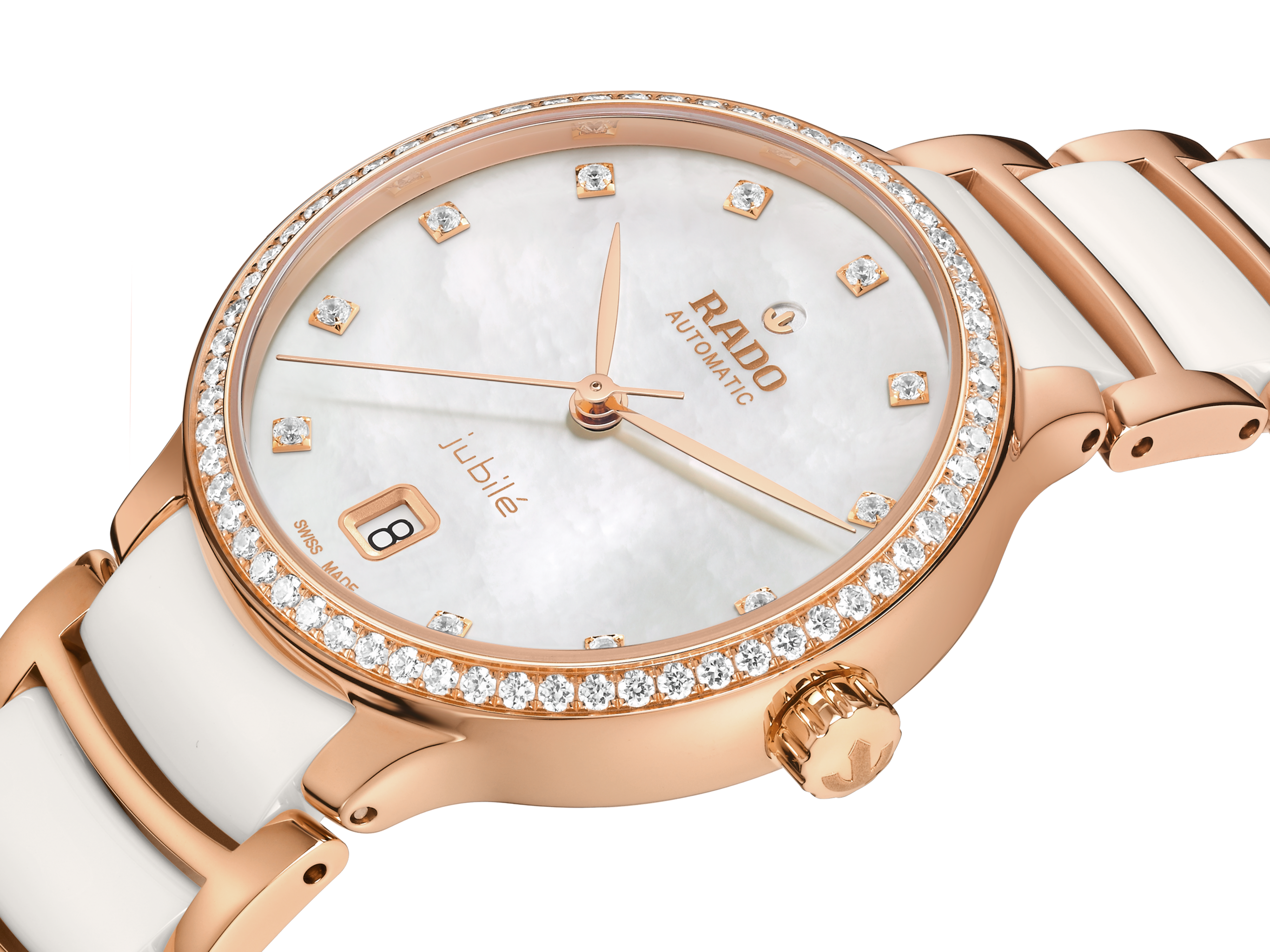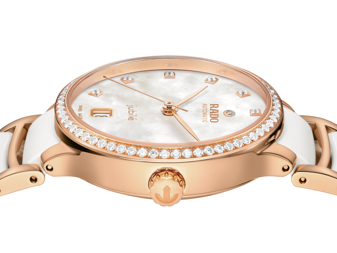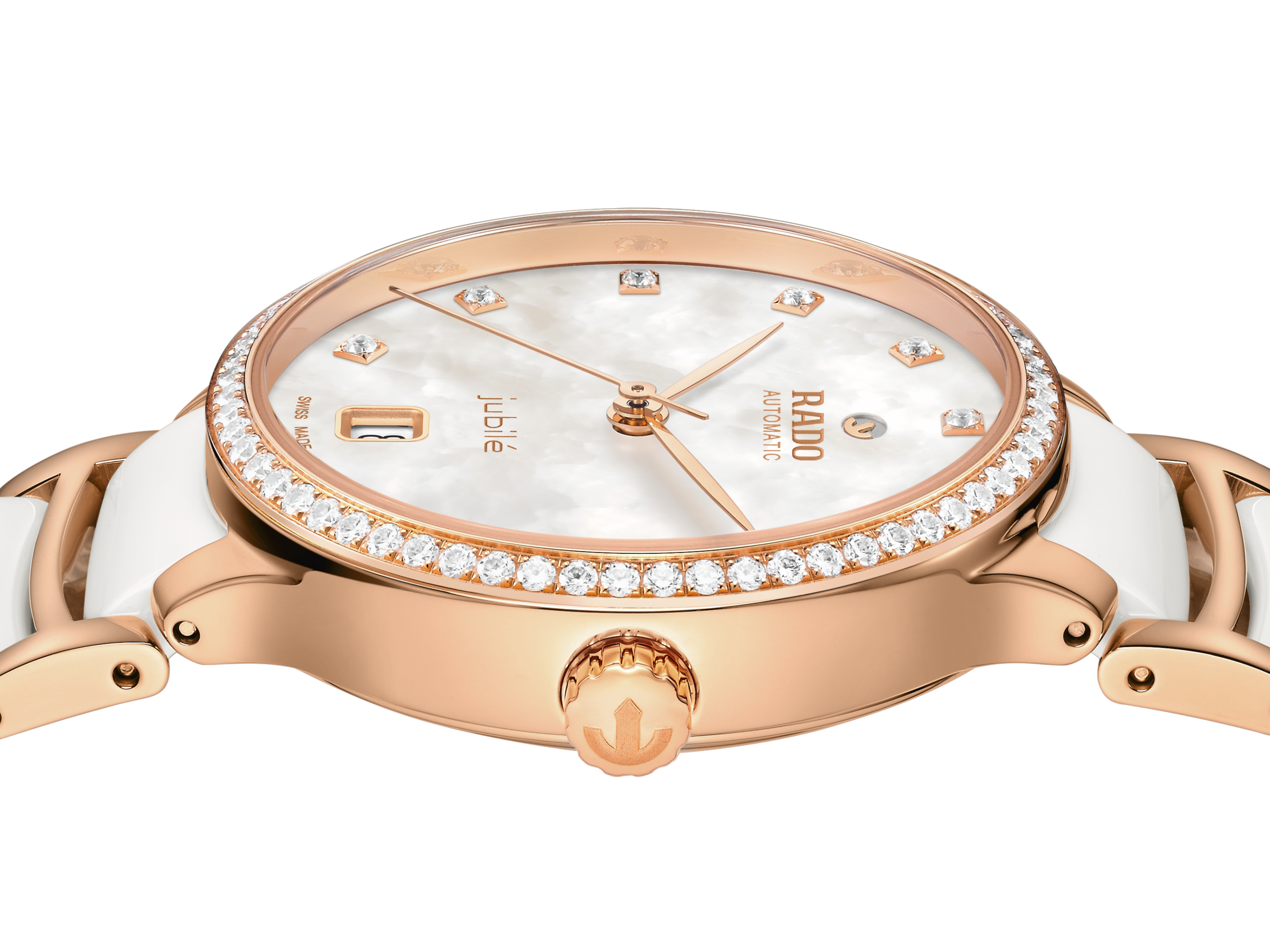 探索Centrix晶萃系列“Super Jubilé”腕表,感受艺术美学与精致设计的和谐交融。35毫米玫瑰金色PVD涂层精钢表壳,玫瑰金色PVD涂层精钢表圈镶嵌60颗净度VS-SI、全切割的威塞尔顿钻石,搭配双面防眩目涂层的弧形蓝宝石水晶表镜,确保读时清晰。透过蓝宝石玻璃底盖,可尽情欣赏腕表之心的律动:R763型自动机芯,经五个方位精密调节,搭载Nivachron™防磁游丝,提供卓越的走时精准度与最高长达80小时的动力储存。 白色珍珠母贝表盘镶嵌11颗净度VS-SI、全切割的威塞尔顿钻石时标,6点钟位置设有日期窗口,尽显典雅之美。这款经典时计采用了精心调整过的表耳,搭配白色高科技陶瓷中央链节的抛光玫瑰金色PVD涂层精钢表链,并以三折式精钢表扣固定。