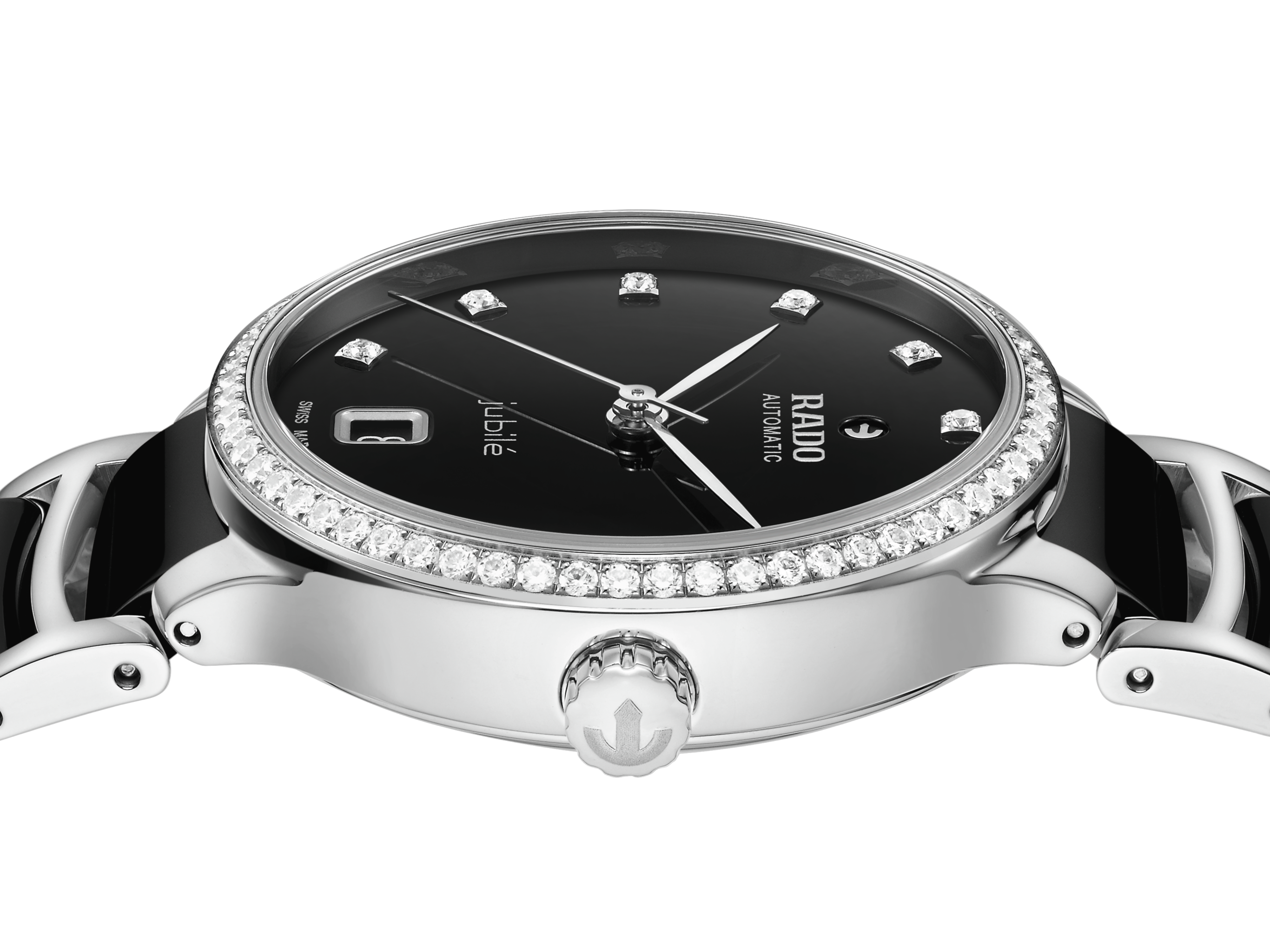 探索Centrix晶萃系列“Super Jubilé”腕表,感受艺术美学与精致设计的和谐交融。35毫米精钢表壳,表圈镶嵌60颗净度VS-SI、全切割的威塞尔顿钻石,搭配双面防眩目涂层的弧形蓝宝石水晶表镜,确保读时清晰。透过蓝宝石玻璃底盖,可尽情欣赏腕表之心的律动:R763型自动机芯,经五个方位精密调节,搭载Nivachron™防磁游丝,提供卓越的走时精准度与最高长达80小时的动力储存。 黑色漆面表盘镶嵌11颗净度VS-SI、全切割的威塞尔顿钻石时标,6点钟位置设有日期窗口,尽显典雅之美。这款经典时计采用精心调整过的表耳,搭配黑色高科技陶瓷中央链节的抛光精钢表链,并以三折式精钢表扣固定。