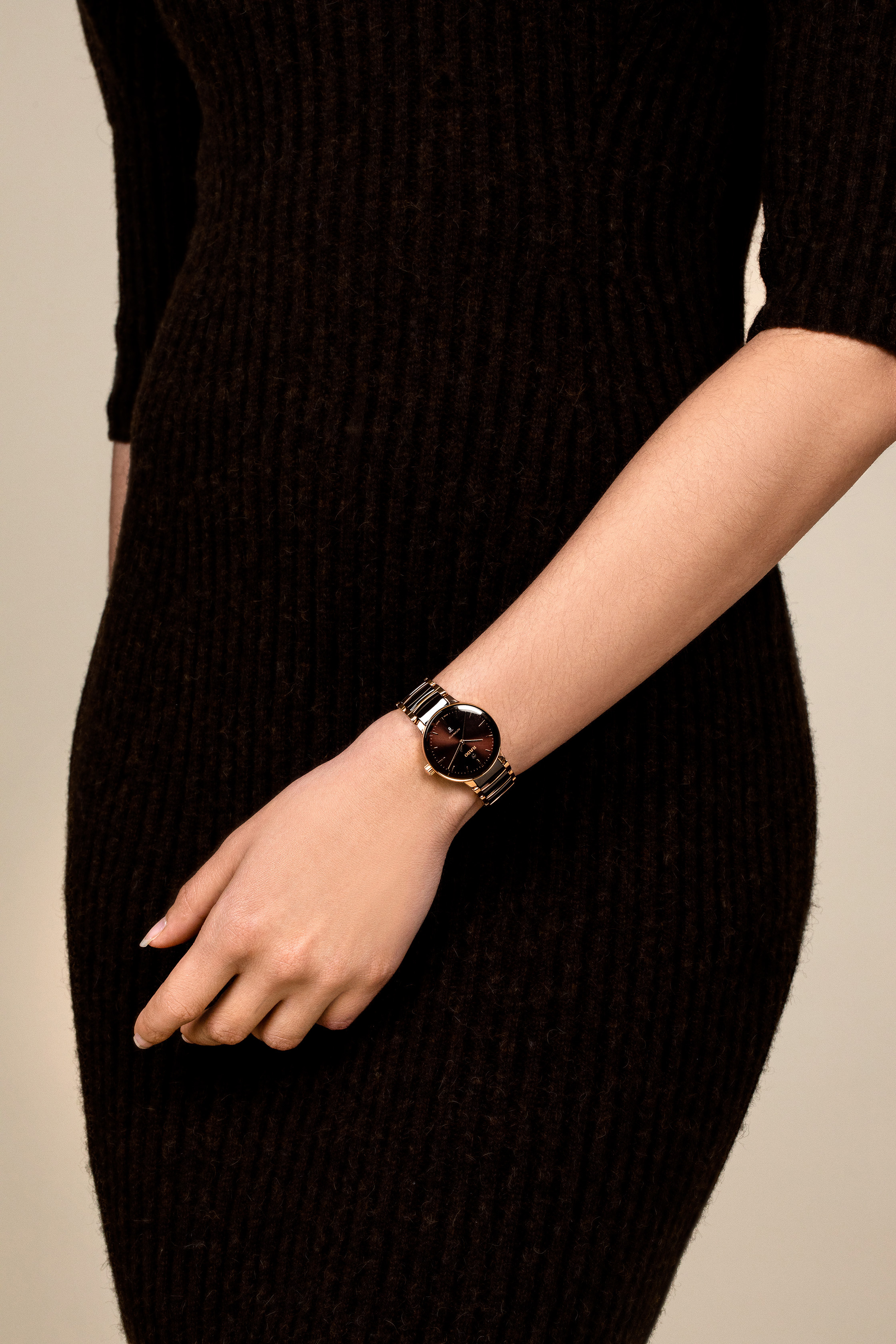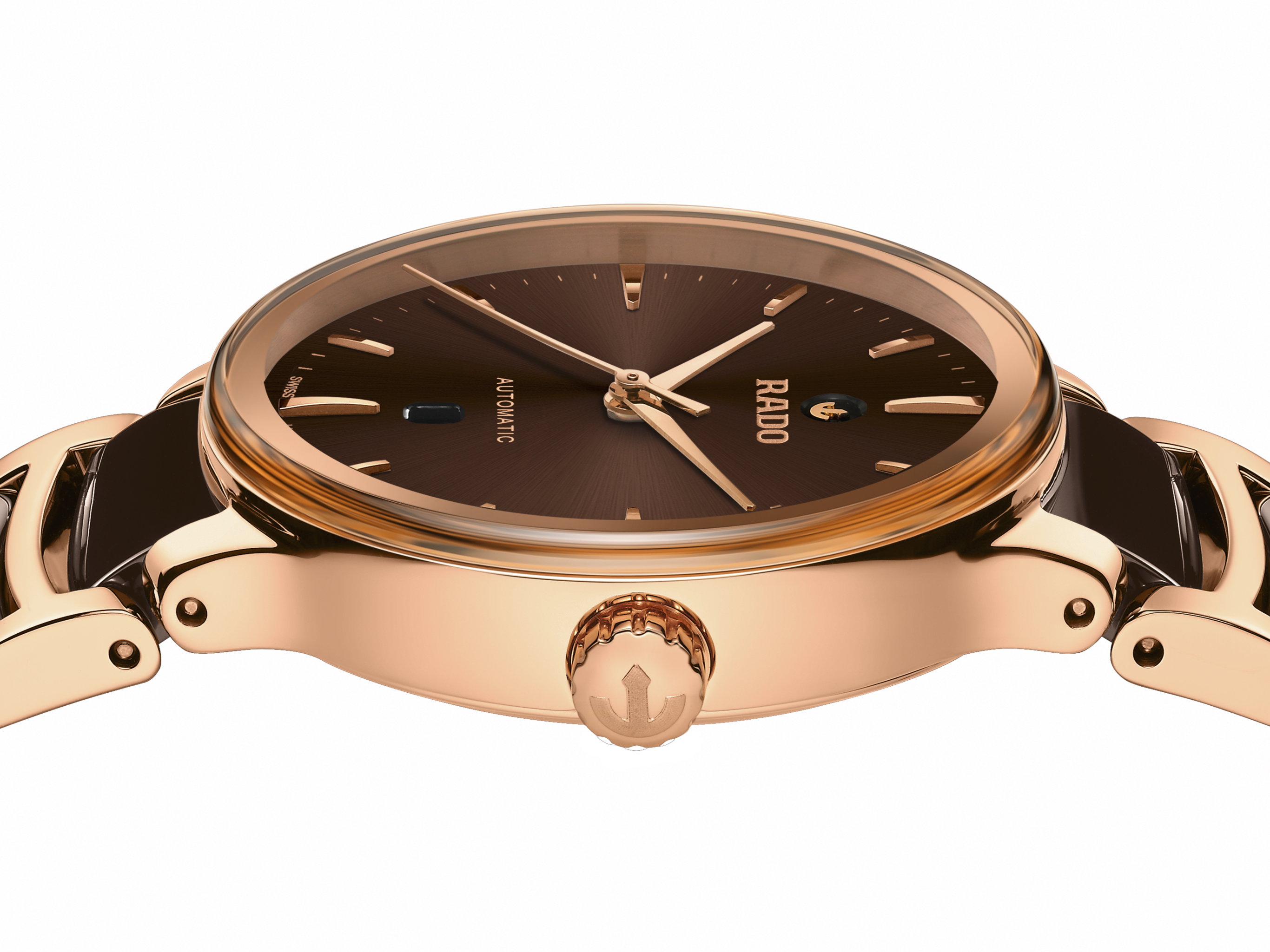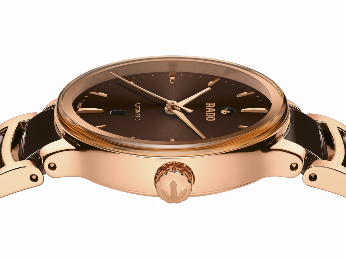 经典Centrix晶萃系列自动机械腕表不仅在技术上进行调整,亦在美学上予以重新设计。修改后的表款,拥有一个圆形的无边框蓝宝石水晶玻璃表镜,以及一个与弧形水晶边缘浑然天成的弧形表壳。调整后的表耳和搭配棕色高科技陶瓷中央链节的抛光玫瑰金PVD涂层精钢表链,令这款经典时计的整体外观更臻完美。棕色的太阳纹表盘搭配玫瑰金时标,与玫瑰金色指针相得益彰。由于搭载Nivachron™防磁游丝,使这款R582型三针机芯在3至5个位置上远超标准测试要求,实现更高的可靠性和精确度。这款腕表防水深度可达50米,并提供48小时的动力储存。