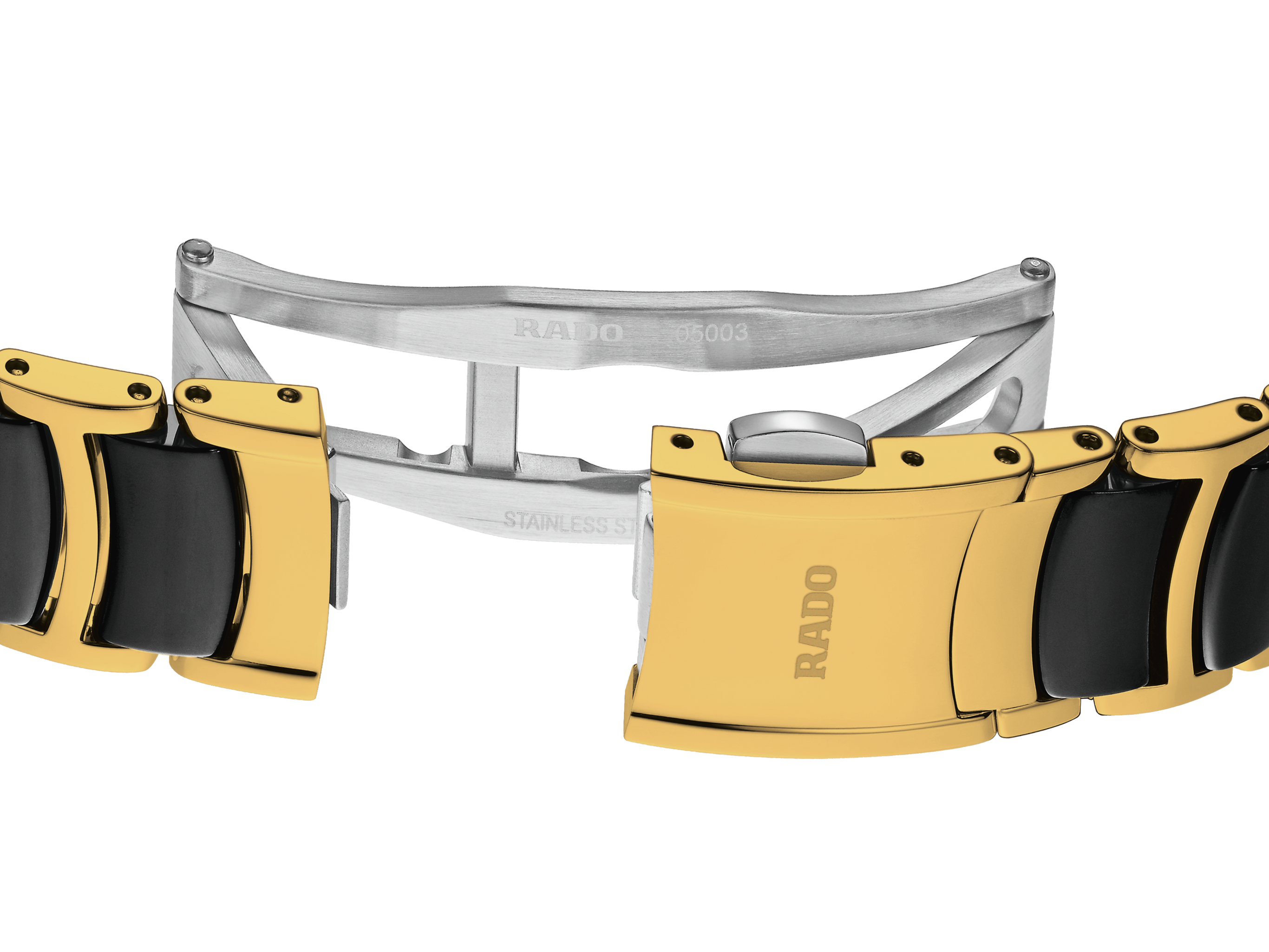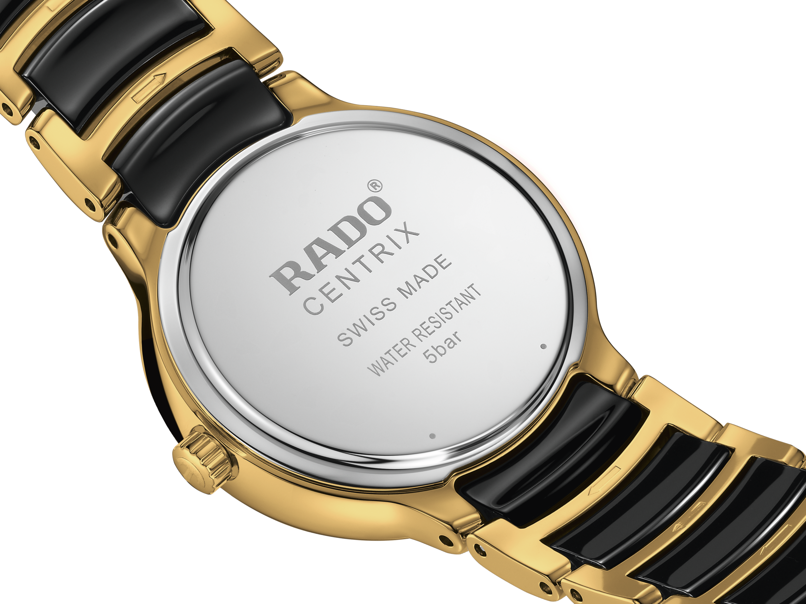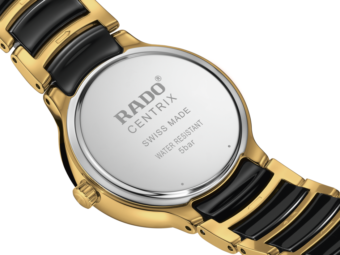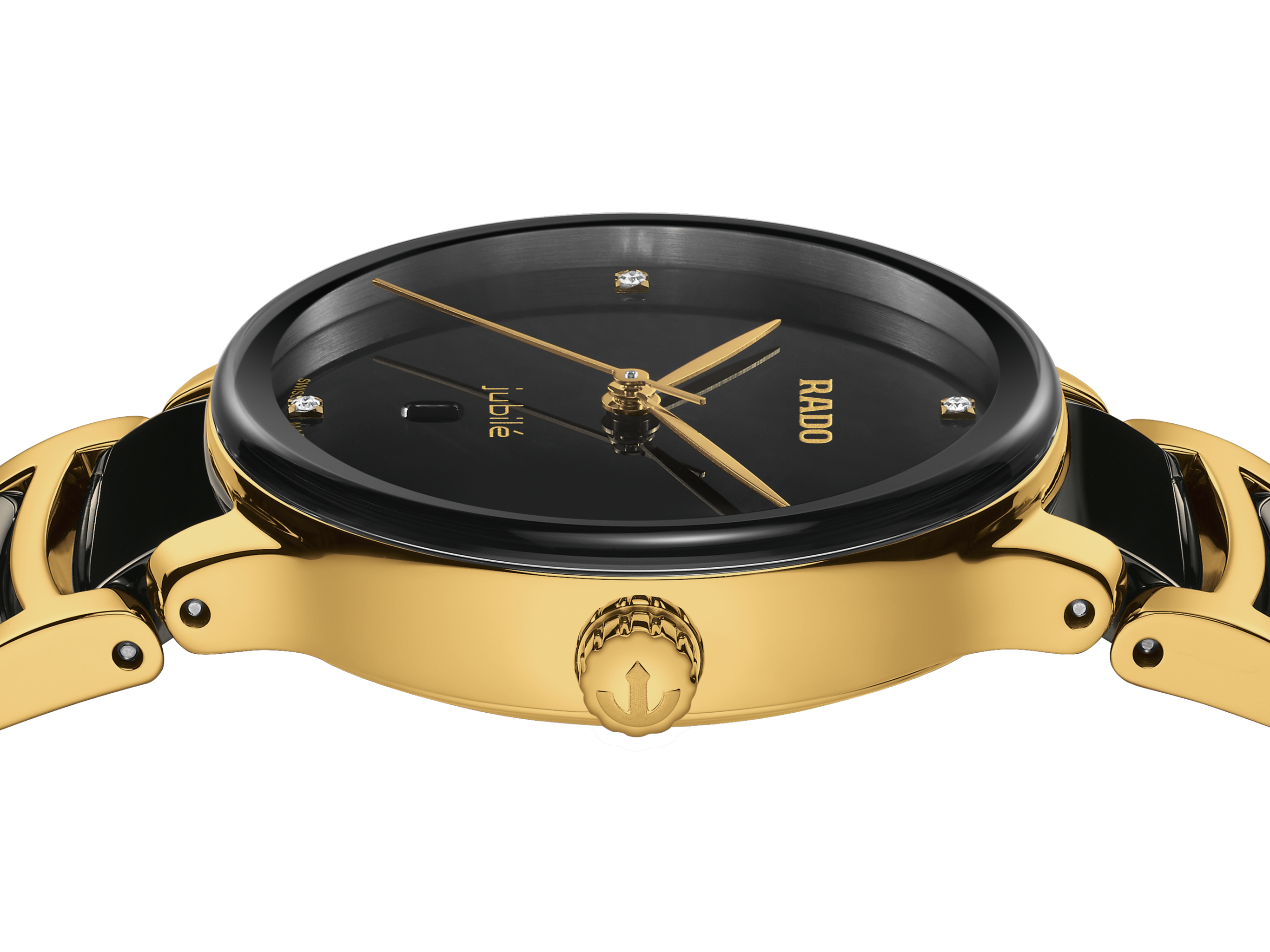 经典Centrix晶萃系列镶钻石英腕表不仅在技术上进行了调整,亦在美学上予以重新设计。调整后的表款,拥有一个圆形的无边框蓝宝石玻璃表镜,以及一个与弧形玻璃边缘浑然一体的表壳。调整后的表耳和搭配黑色高科技陶瓷中间链节的抛光黄金色PVD涂层精钢表链,令这款经典时计的整体外观更加完美。黑色漆面表盘镶嵌着4颗钻石,印有“jubilé”标志,与黄金色指针完美搭配。运用PreciDrive精准走时和HeavyDrive防震技术的R079型石英机芯,让腕表具有更加优异的精度和抗震性。腕表防水性能达50米。