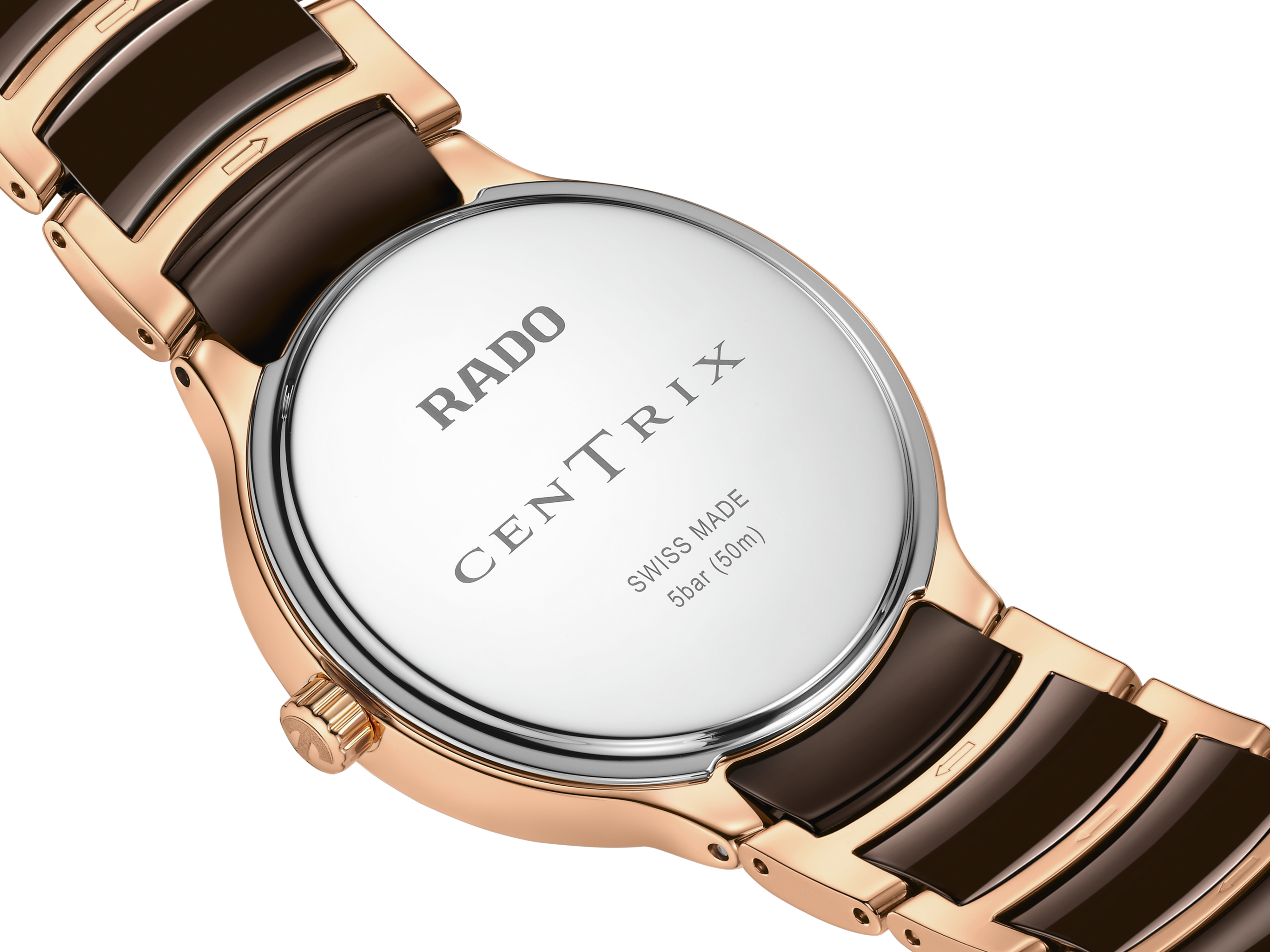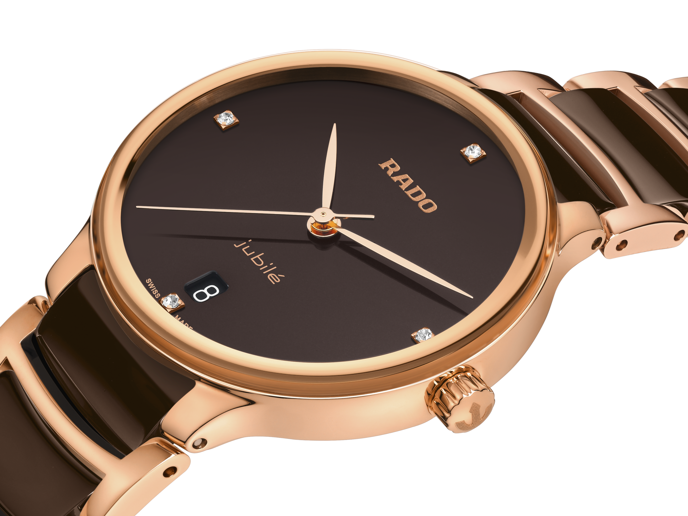 经典的Centrix晶萃系列镶钻腕表不仅在制表工艺上进行创新,亦重新赋予了美学设计。新的表款,拥有圆形无边框蓝宝石玻璃表镜,弧形表壳与弧形表镜边缘融为一体。调整后的表耳,以及抛光玫瑰金色PVD涂层精钢表链搭配棕色高科技陶瓷中间链节,令这款经典时计的整体造型更为美观。棕色漆面表盘镶嵌4颗钻石,印有“jubilé”标志,与玫瑰金色指针相得益彰。运用PreciDrive精准走时和HeavyDrive防震技术的R073型石英机芯,让腕表具有更加优异的精度和抗震性。腕表防水性可达50米。