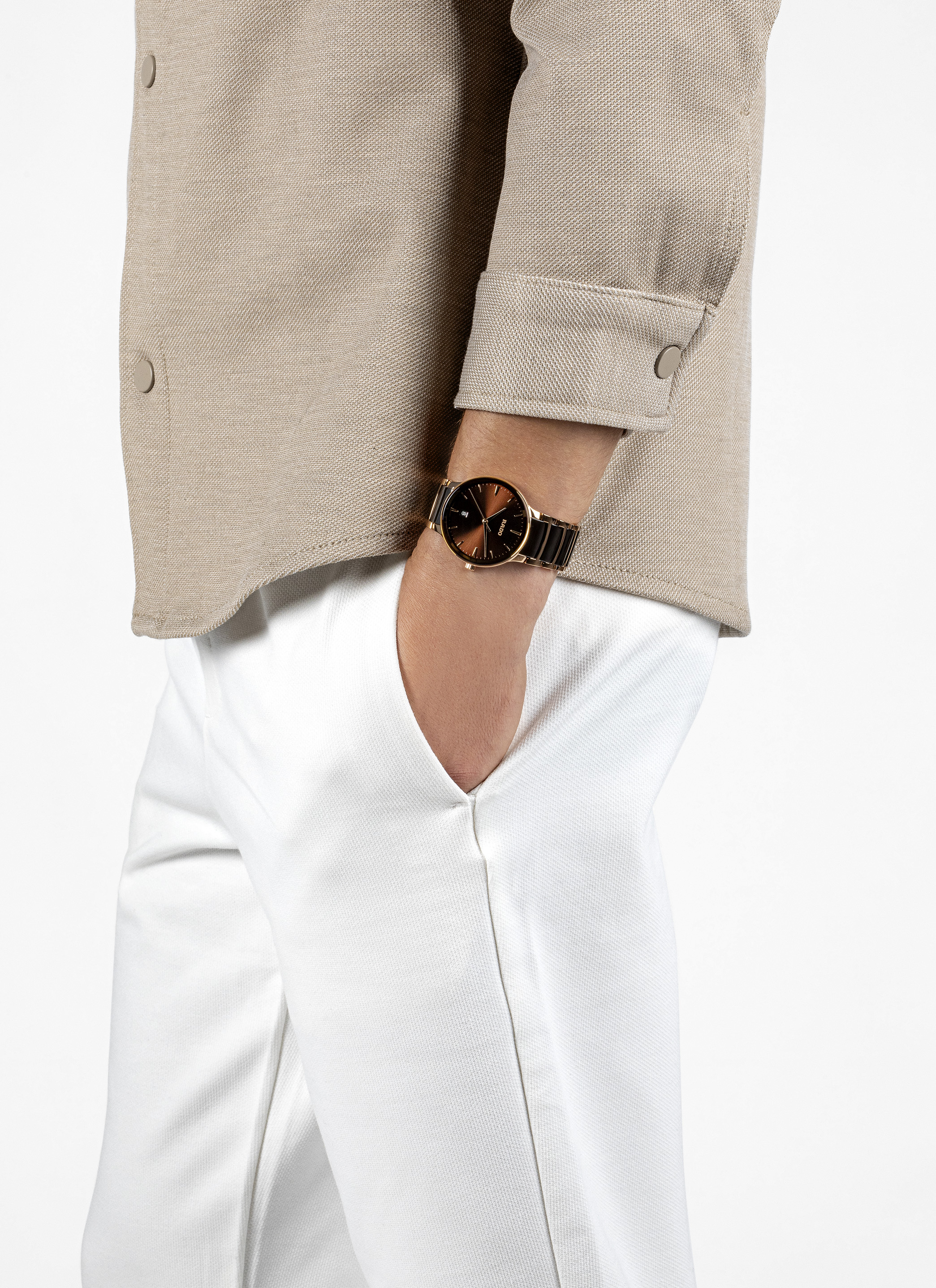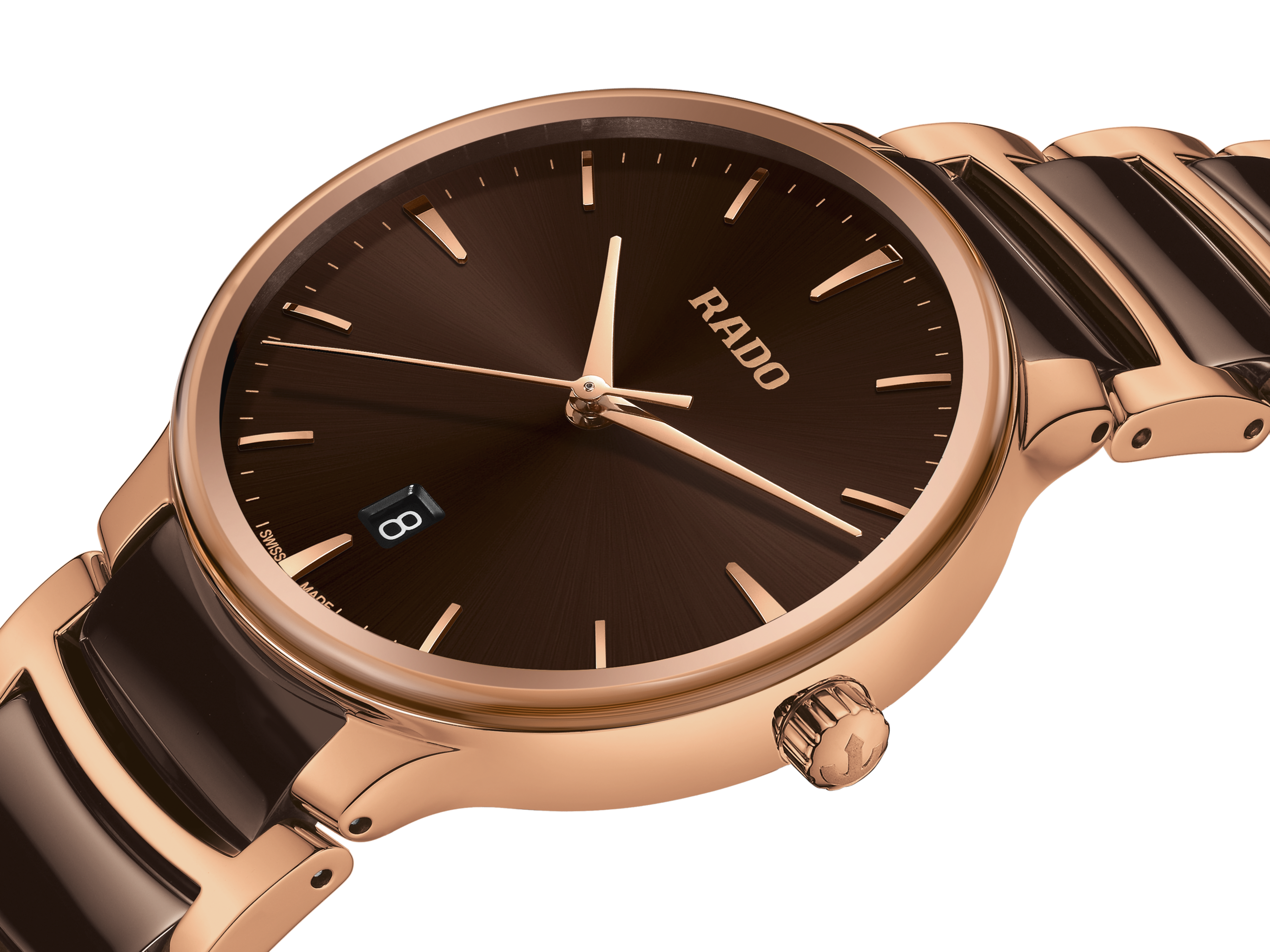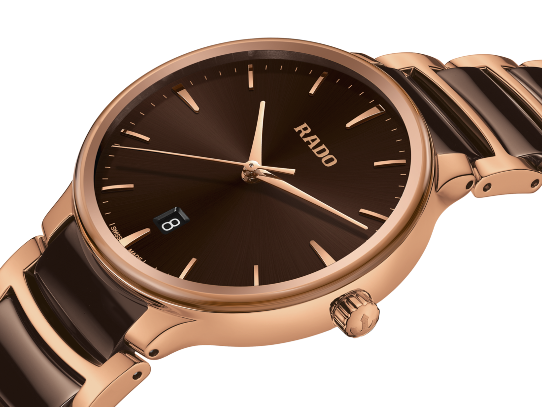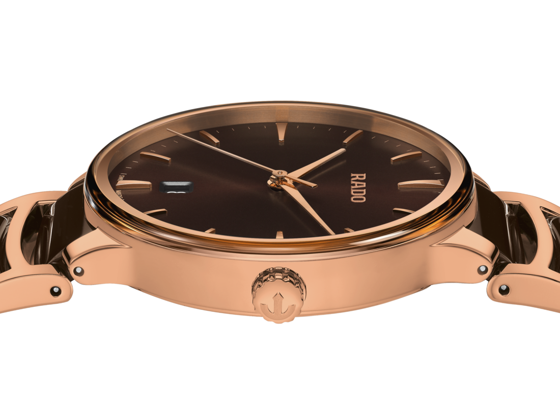 经典Centrix晶萃系列石英腕表不仅在技术上进行了调整,亦在美学上予以重新设计。调整后的表款,拥有一个圆形的无边框蓝宝石玻璃表镜,以及一个与弧形玻璃边缘浑然天成的表壳。调整后的表耳和搭配棕色高科技陶瓷中间链节的抛光玫瑰金色PVD涂层精钢表链,令这款经典时计的整体外观更加完美。棕色的太阳纹表盘搭配玫瑰金色时标,与玫瑰金色指针相得益彰。运用PreciDrive精准走时和HeavyDrive防震技术的R073型石英机芯,让腕表具有更加优异的精度和抗震性。腕表防水性能达50米。