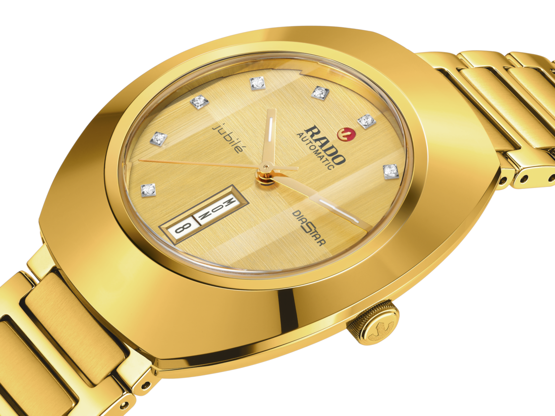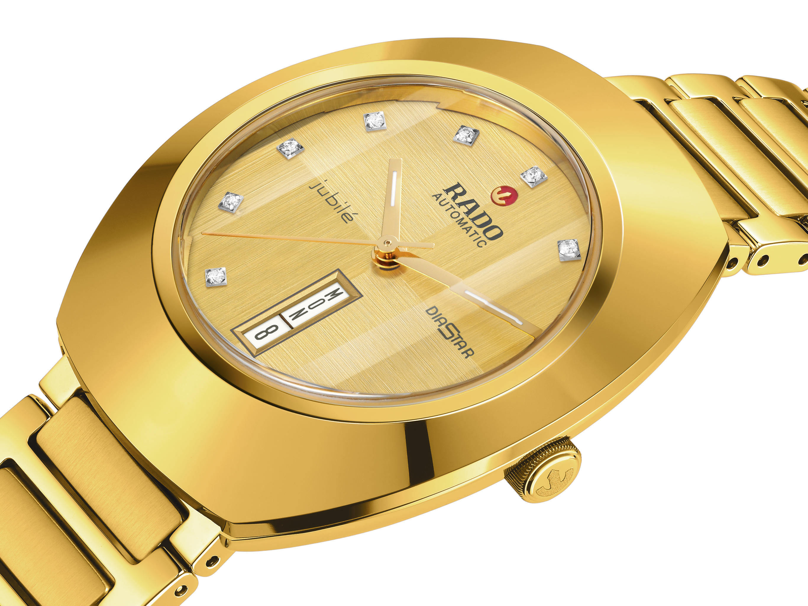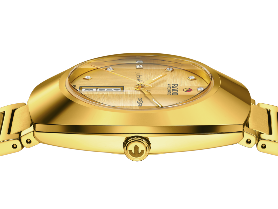 与众不同的DiaStar钻星系列创始型腕表,直径38毫米,防水深度可达100米。这枚美丽的腕表以平行条纹切面的蓝宝石水晶玻璃表镜为底,采用超亮黄金色Ceramos™碳化钛金属陶瓷纹饰,搭配抛光处理过的角度和细节点缀,镶嵌在互相搭配的黄金色PVD涂层精钢表壳上。腕表配备金色拉丝表盘,可双向旋转、具有白色Super-LumiNova®夜光涂层的黄金色指针,以及白色日期及日期显示,表盘镶嵌着11颗足瓣切割钻石,印有深灰色“jubilé”标志。搭载Rado瑞士雷达表R764型自动机械机芯,具备80小时动力储存和防磁Nivachron™摆轮游丝。表链由黄金色PVD涂层抛光与拉丝精钢制成。