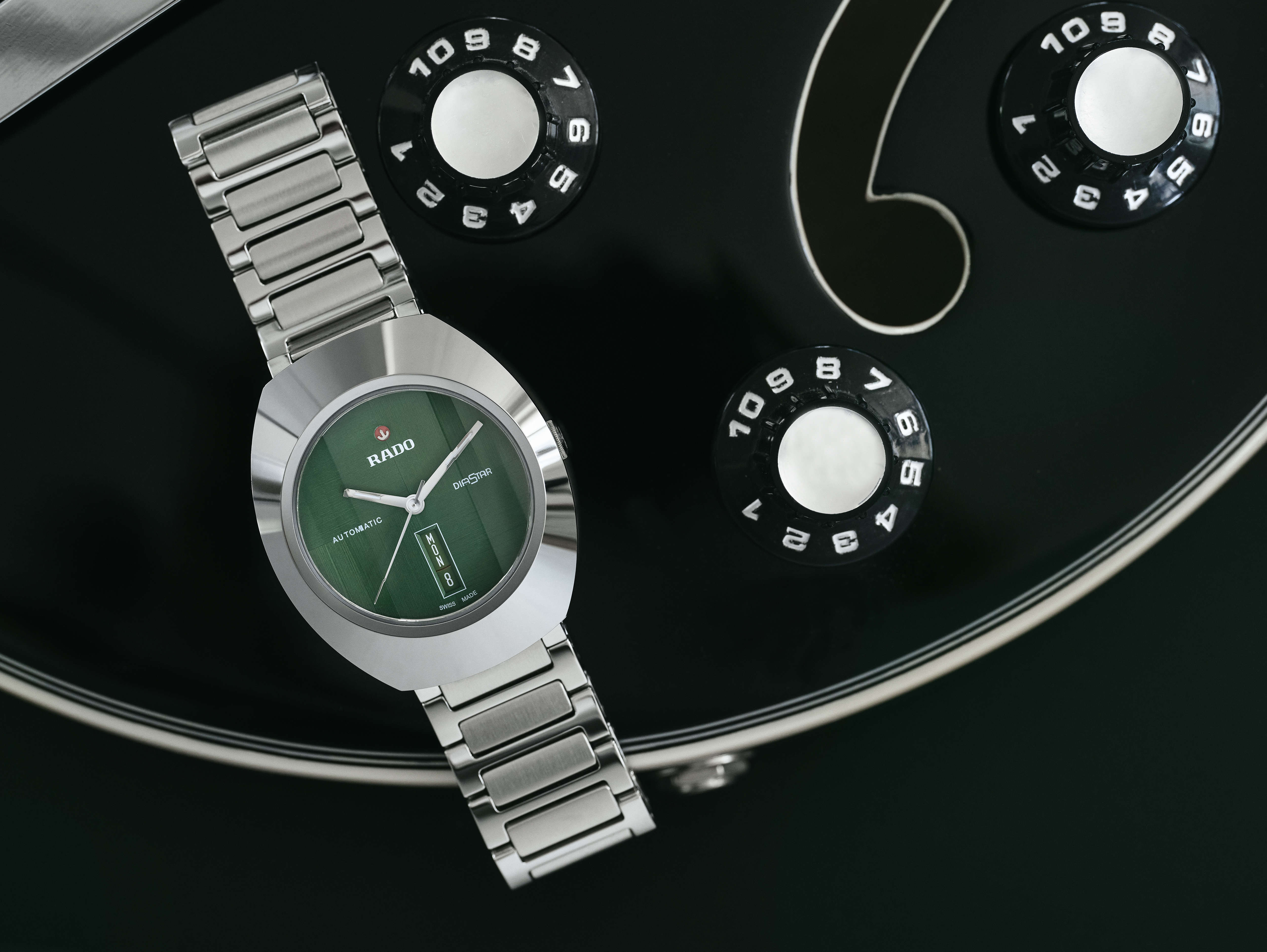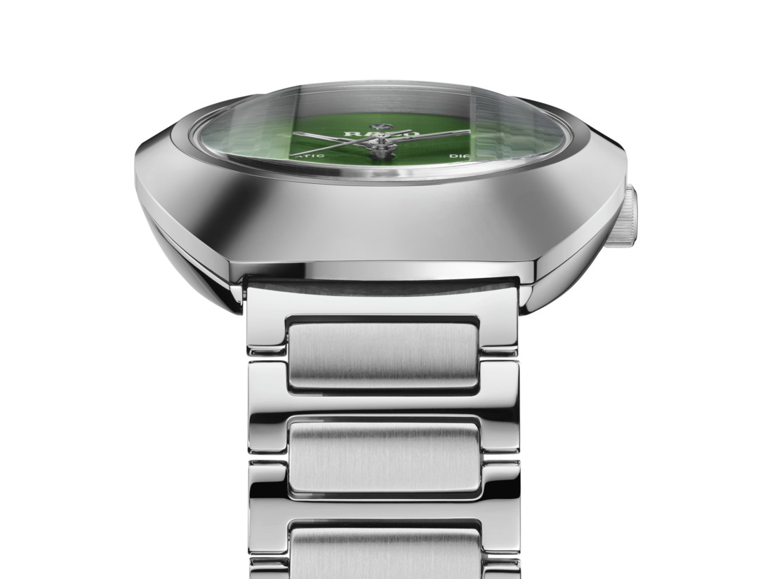 与众不同的DiaStar钻星系列创始型腕表,直径38毫米,防水深度可达100米。这枚美丽的腕表以平行条纹切面的蓝宝石水晶玻璃表镜为底,采用超亮碳化钛金属陶瓷纹饰,搭配抛光处理过的角度和细节点缀,镶嵌在互相搭配的单色精钢表壳上。腕表配备绿色拉丝表盘,可双向旋转、具有白色Super-LumiNova®夜光涂层的铑色指针,以及与表盘颜色一致的日期显示。腕表内部的Rado瑞士雷达表R764型自动机械机芯,搭载防磁Nivachron™游丝,可提供80小时动力储存。配有经抛光和拉丝处理的精钢表链。