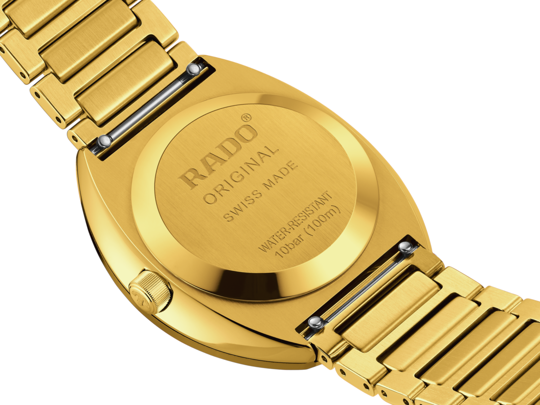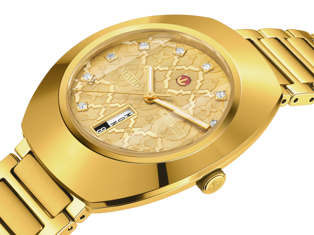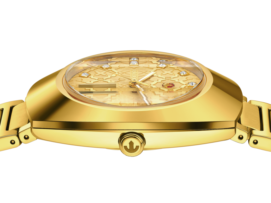 The Rado DiaStar Original is a truly iconic watch from Rado. This version features a 38mm size, yellow gold pvd coated Ceramos™ bezel and faceted sapphire crystal with an antireflective coating. The modern interpretation of the Rado “watch for a lifetime”. Powered by the Rado calibre R764 automatic movement with 80 hours of power reserve, an antimagnetic Nivachron™ hairspring and exceeding standard testing requirements, being tested and adjusted in five positions. Reliability and accuracy are assured. The movement features a day and date display. The dial features a mosaic style pattern, with different shapes given different finishes, each finish on a different level. This multi layered effect giving the watch dial depth and intrigue. Eleven, clear, crystal stones complete the look. A design classic from Rado.