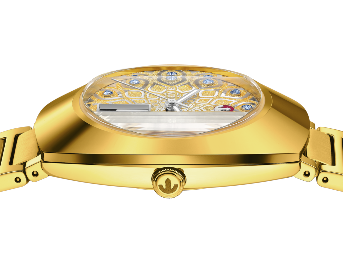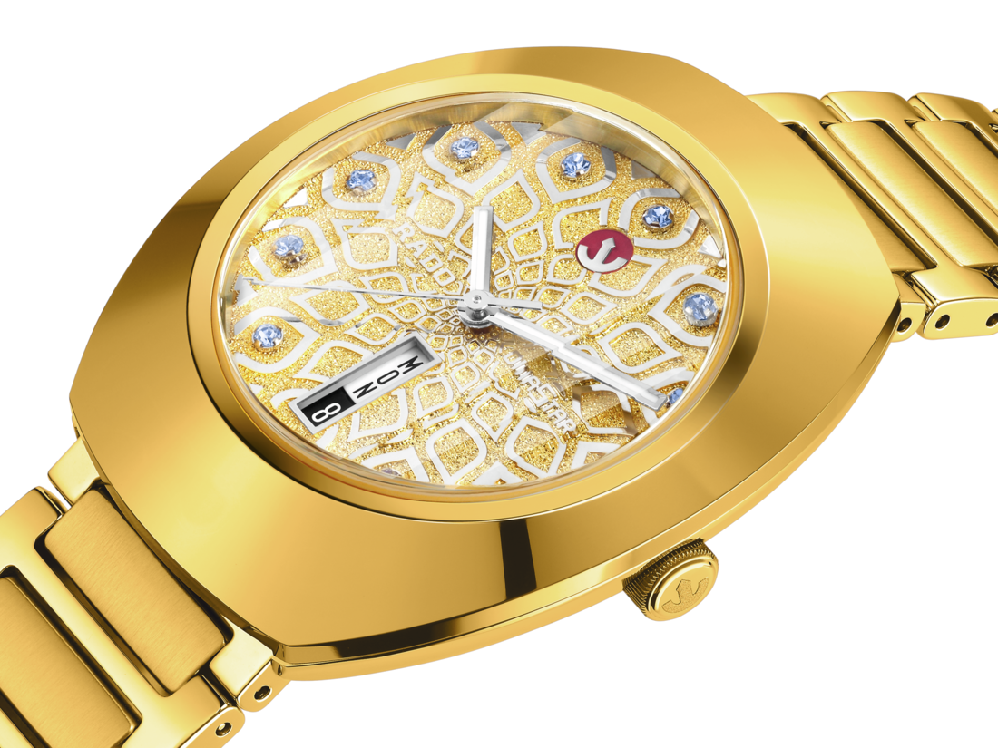 这款独特的DiaStar钻星创始型系列腕表直径38毫米,防水深度可达100米。腕表采用垂直条纹切面的蓝宝石玻璃表镜以及黄金色Ceramos™金属陶瓷纹饰,表圈的棱角和细节均经过抛光处理,搭配黄金色PVD涂层精钢表壳。腕表的铑色指针覆有白色Super-LumiNova®夜光涂层,以及白色星期显示和黑色日期显示。表盘镶嵌11颗淡蓝色立方氧化锆石,铑色图案上有钻石粉末装饰。Rado瑞士雷达表R764型自动机械机芯搭载Nivachron™防磁游丝,具备最高长达80小时动力储存。表链由黄金色PVD涂层抛光与拉丝精钢打造而成。