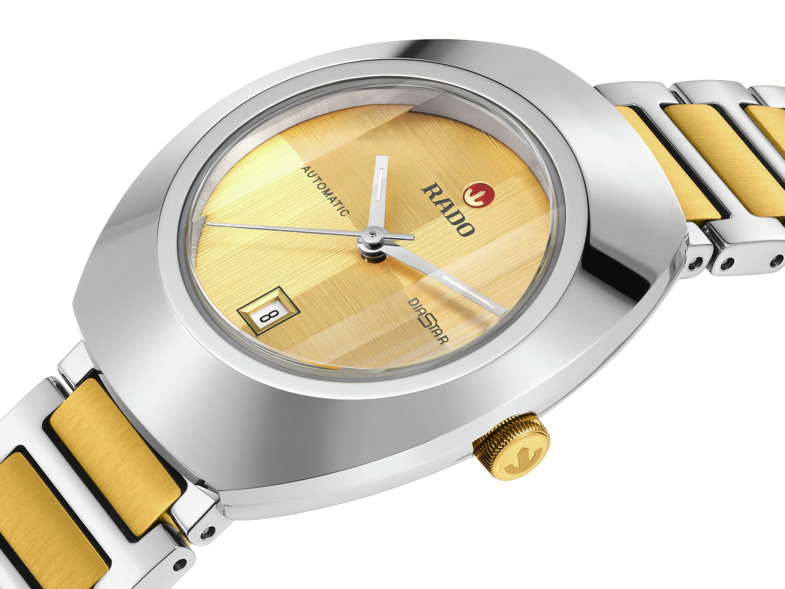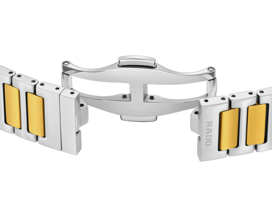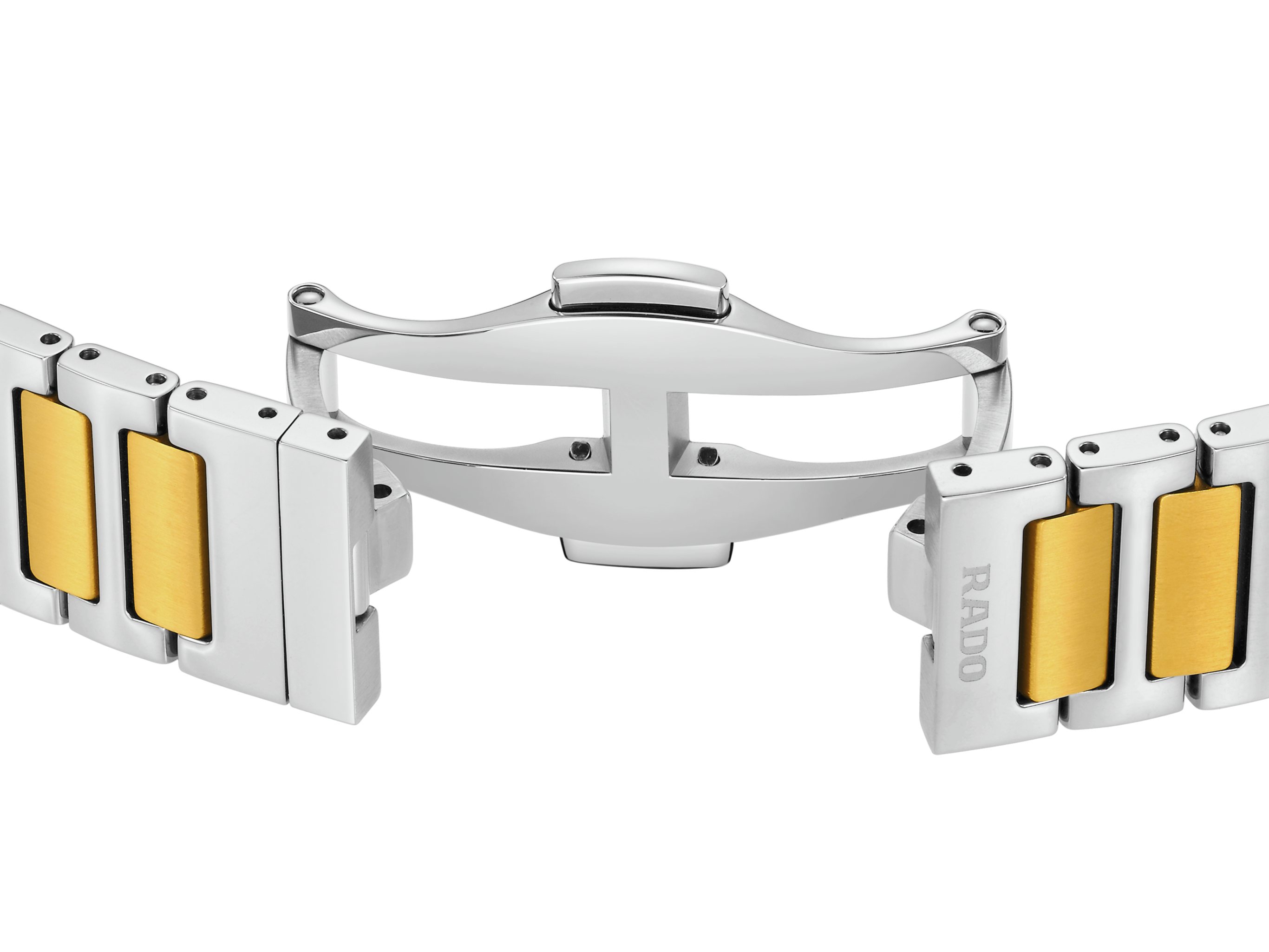 瑞士制表工艺与开创性创意的经典体现。Rado瑞士雷达表DiaStar钻星系列腕表专为敢于探索非凡的品味人士而量身打造。30毫米表壳,镶嵌抛光铂金色Ceramos™碳化金属陶瓷表圈,与抛光精钢中层表壳和谐相融,防水性能高达10巴(100米)。双向拉丝黄色表盘在光影间展现优雅魅力,衬托出经典的金色可摆动锚型标志,并于6点钟位置精准嵌入日期窗。铑色指针覆有白色Super-LumiNova®涂层,确保任何光线条件下的清晰读时。此精致表盘由垂直内侧刻面防反光涂层蓝宝石水晶表镜守护。腕表搭载R586自动机械机芯,经五个方位精调,配备Nivachron™游丝,提供卓越精准度与48小时动力储存。这款经典腕表的整体造型以精钢表链完美收尾,结合抛光链节与拉丝黄金色PVD涂层中部链节,搭配抛光精钢三折式表扣,展现精致细腻的设计美感。