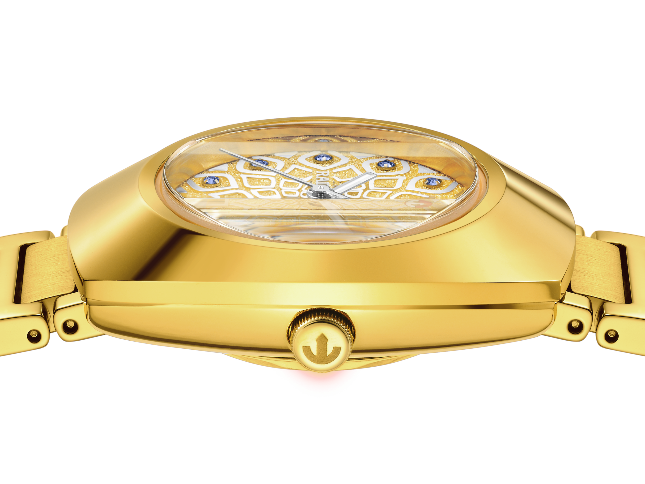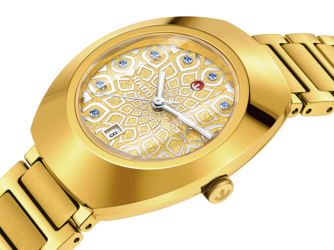 瑞士制表工艺与先锋创新的经典体现。Rado瑞士雷达表DiaStar钻星系列腕表专为敢于探索非凡的品味人士量身打造。30毫米表壳,镶嵌抛光黄金色PVD涂层Ceramos™碳化金属陶瓷表圈,与抛光黄金色PVD涂层精钢中层表壳和谐相融,防水性能高达10巴(100米)。 铑色涟漪纹理表盘铺陈于钻石粉末质感底幕之上,11枚镶嵌于铑色底座的浅蓝色立方氧化锆石,优雅擒获流转光影。标志性铑色可摆动锚型标志,与6点钟方位精工布局的日期视窗,于璀璨光晕中傲然生辉。 铑色指针覆有白色Super-LumiNova®涂层,确保任何光线条件下的清晰读时。 此精致表盘由垂直多切面防眩目涂层蓝宝石玻璃表镜守护。腕表搭载R586自动机械机芯,经五个方位精调,配备Nivachron™防磁游丝,提供卓越精准度与最高长达48小时的动力储存。 这款经典腕表的整体造型以黄金色PVD涂层精钢表链,结合抛光链节与拉丝中部链节,搭配抛光黄金色PVD涂层精钢三折式表扣,展现精致细腻的设计美感。