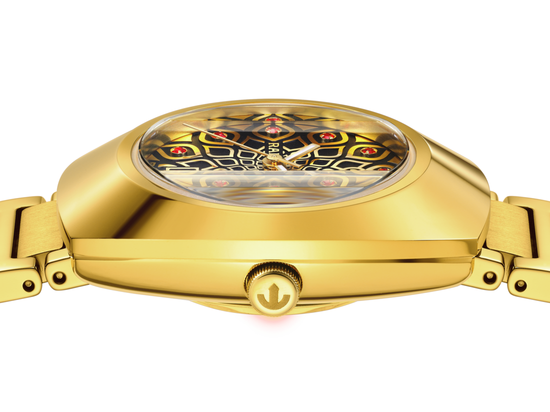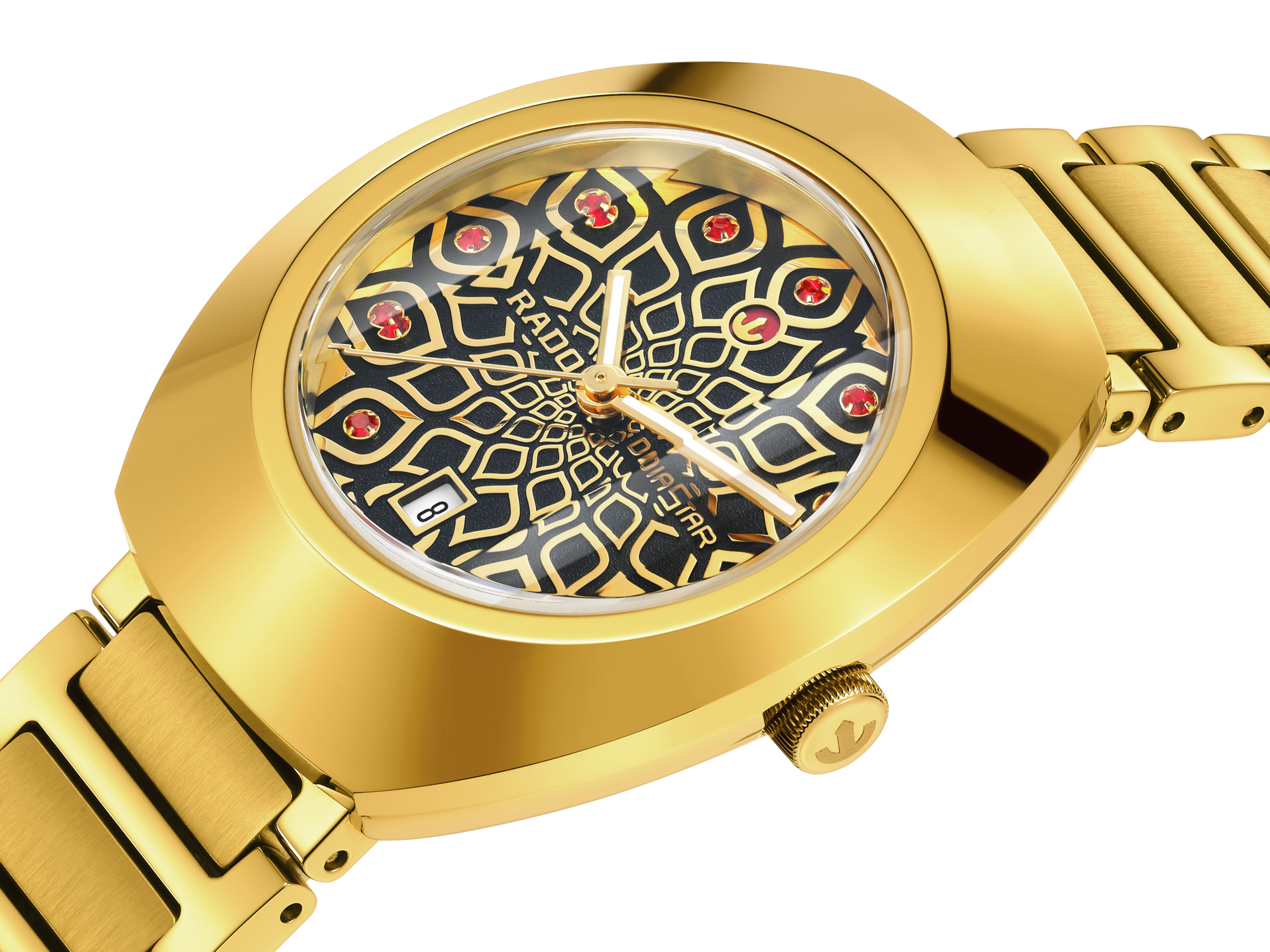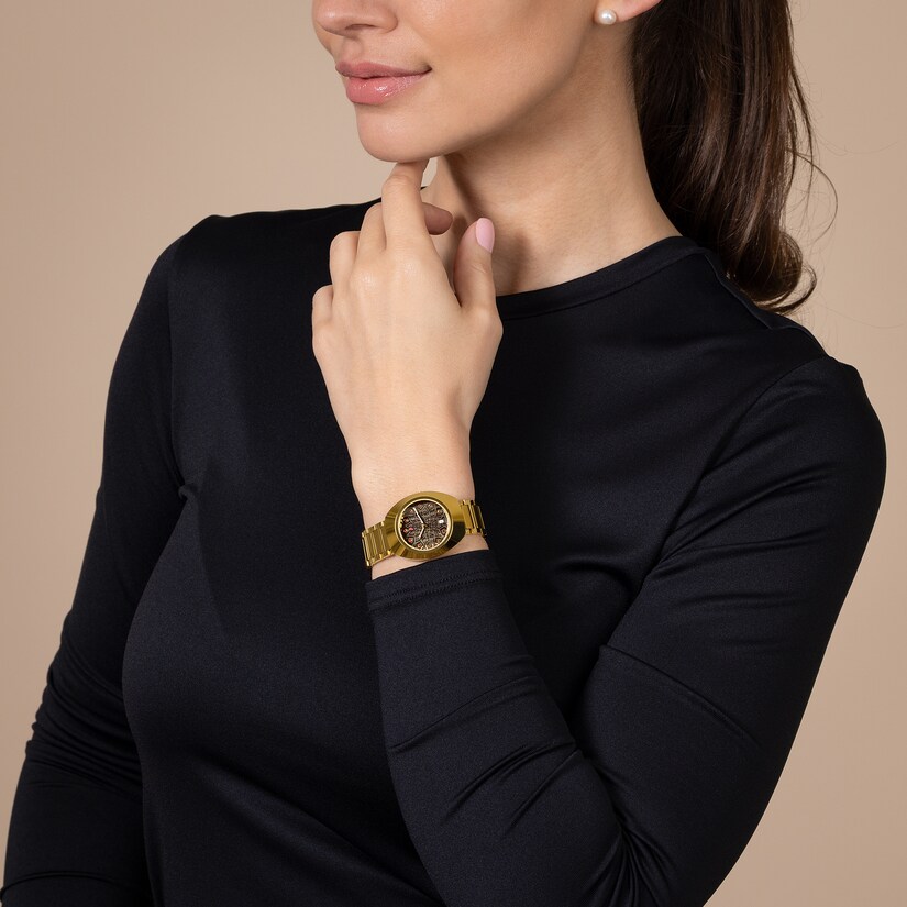 瑞士制表工艺与先锋创新的经典体现。Rado瑞士雷达表DiaStar钻星系列腕表专为敢于探索非凡的品味人士量身打造。30毫米表壳,镶嵌抛光黄金色PVD涂层Ceramos™碳化金属陶瓷表圈,与抛光黄金色PVD涂层精钢中层表壳和谐相融,防水性能高达10巴(100米)。 黄色涟漪纹理表盘铺陈于黑色底幕之上,11枚镶嵌于黄色底座的红色立方氧化锆石,优雅擒获流转光影。标志性铑色可摆动锚型标志,与6点钟方位精工布局的日期视窗,于璀璨光晕中傲然生辉。 黄金色指针覆有白色Super-LumiNova®涂层,确保任何光线条件下的清晰读时。 此精致表盘由垂直多切面防眩目涂层蓝宝石玻璃表镜守护。腕表搭载R586自动机械机芯,经五个方位精调,配备Nivachron™防磁游丝,提供卓越精准度与最高长达48小时的动力储存。 这款经典腕表的整体造型以黄金色PVD涂层精钢表链,结合抛光链节与拉丝中部链节,搭配抛光黄金色PVD涂层精钢三折式表扣,展现精致细腻的设计美感。