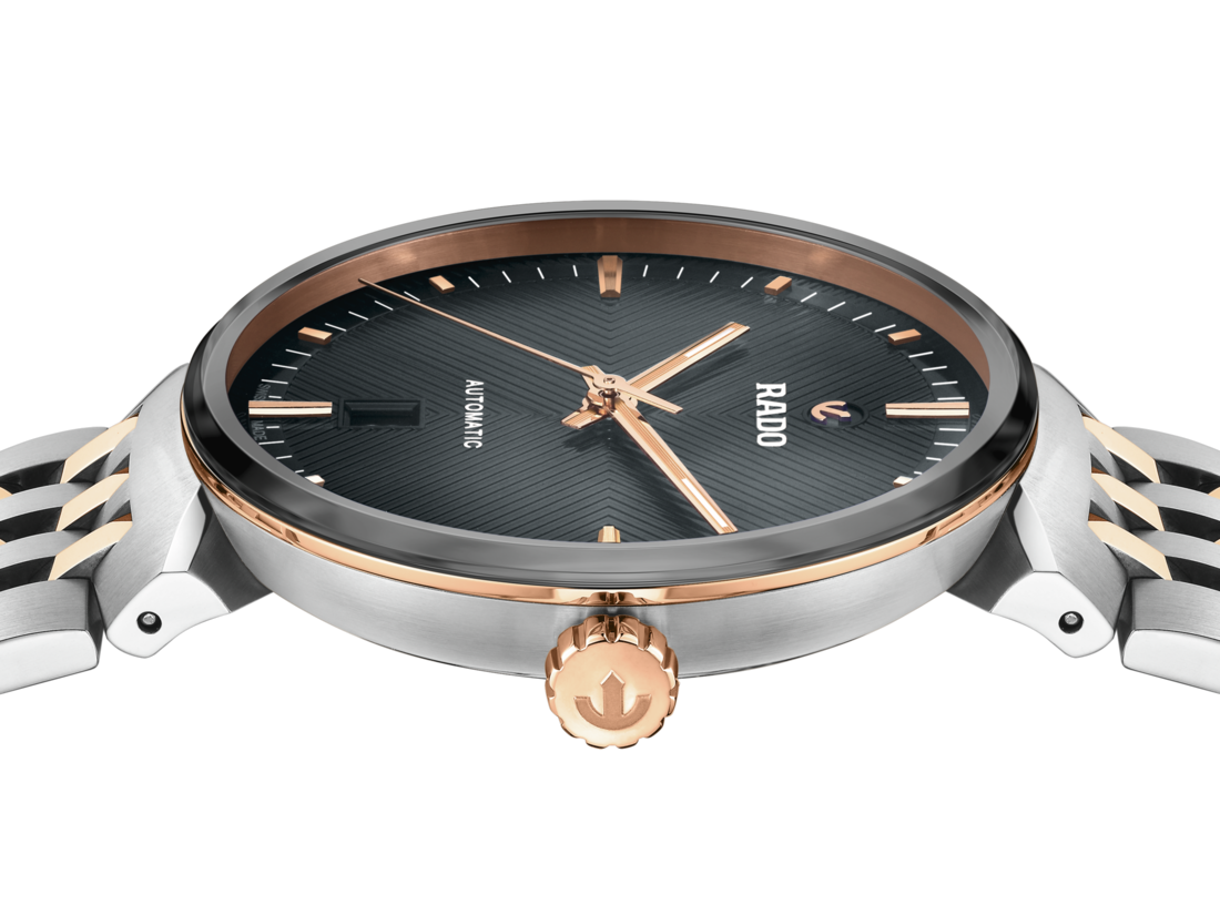 探索精准与典雅相融合的Rado瑞士雷达表Florence佛罗伦萨系列腕表。 39毫米表壳搭配无边框蓝宝石玻璃表镜,金属镀层边缘与精钢表壳彼此呼应。蓝宝石玻璃既可保护表盘,又能作为表圈无缝融入表壳之中,凸显Florence佛罗伦萨系列极具代表性的精致轮廓。 灰色表盘犹如戏剧舞台,精致的压印图案尽显细节感。玫瑰金色时标与其上方的可摆动锚型标志经过拉丝和抛光处理,与灰色背景形成鲜明对比。 表壳搭配双色表链,抛光PVD涂层玫瑰金色精钢链节与拉丝精钢链节交相呼应,以精钢三折式表扣固定。盒形蓝宝石玻璃底盖下方隐藏着Florence佛罗伦萨腕表的灵魂:R763型自动机芯。机芯经过五个方位精密校准,搭载Nivachron™游丝,提供高精准度和最高长达80小时动力储存,彰显Rado瑞士雷达表对高品质的承诺。