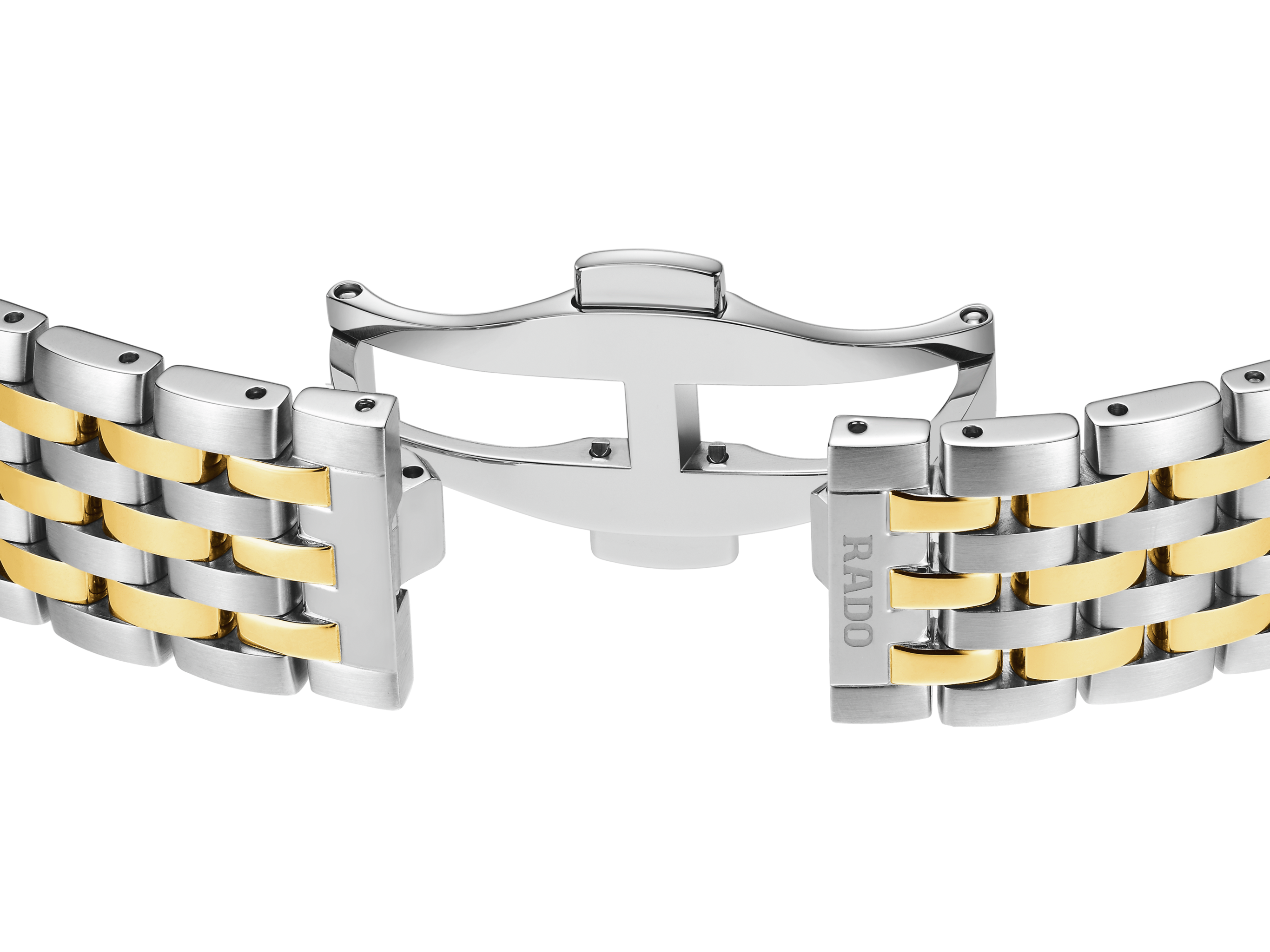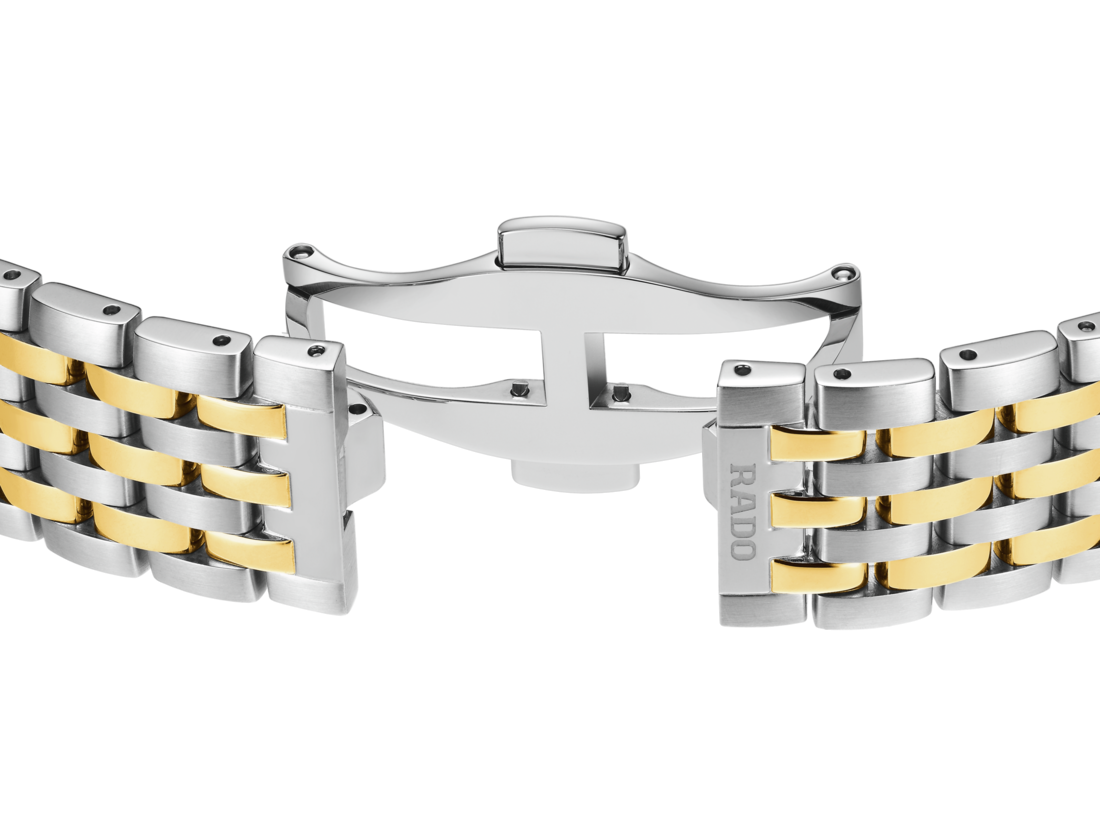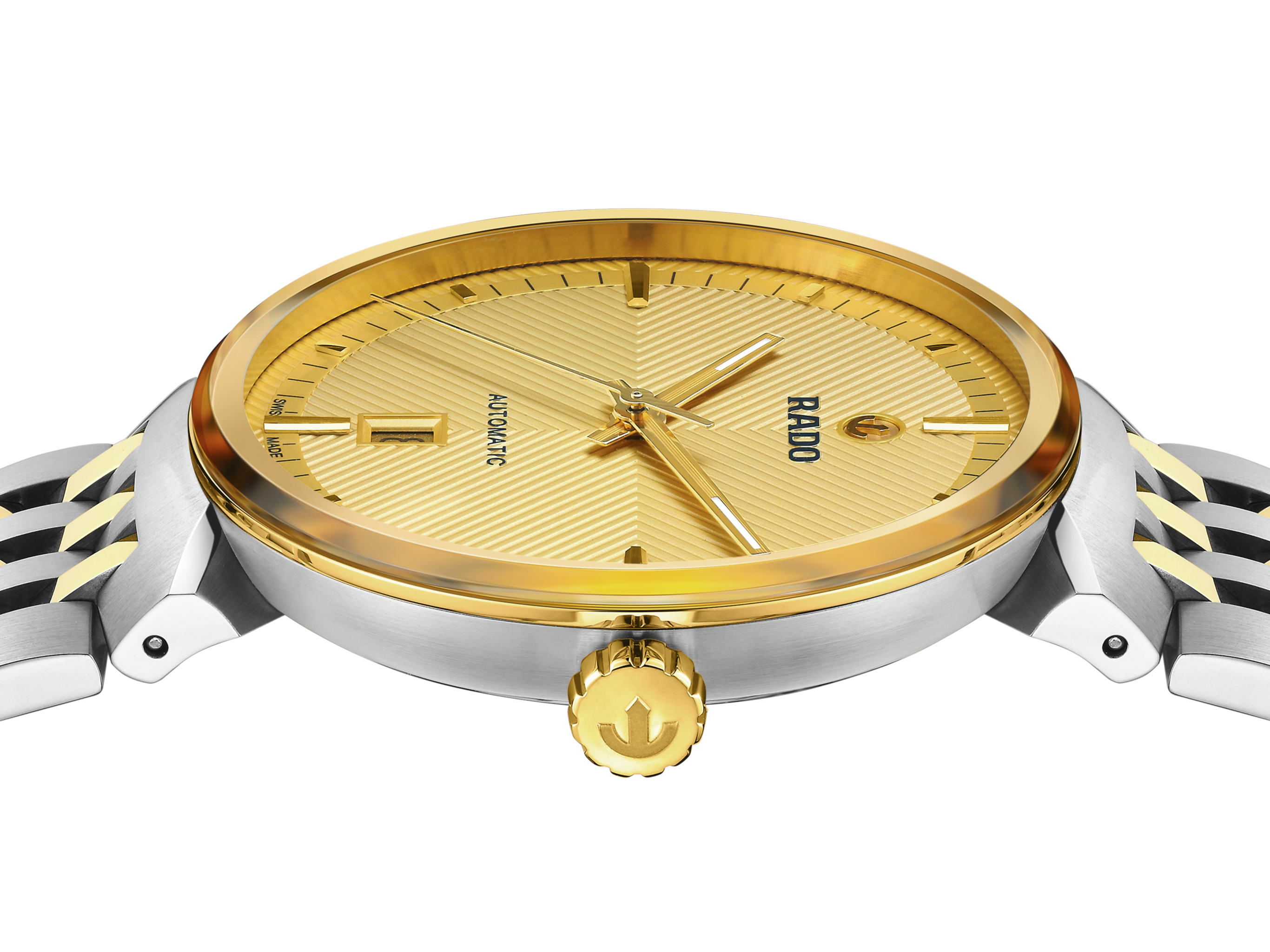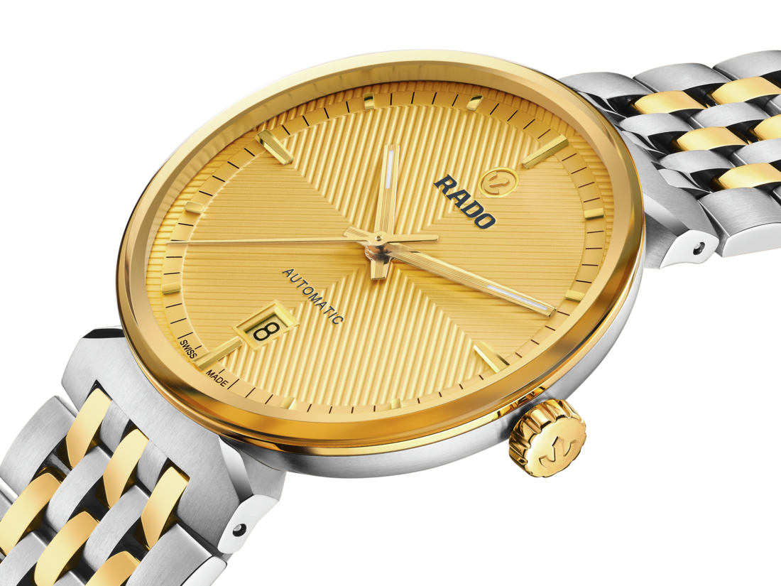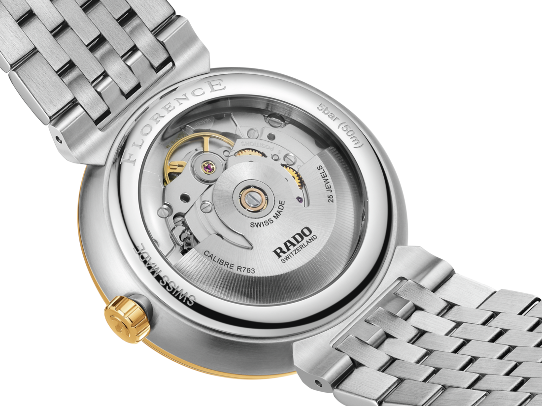 探索精准与典雅相融合的Rado瑞士雷达表Florence佛罗伦萨系列腕表。 39毫米表壳搭配无边框蓝宝石玻璃表镜,金属镀层边缘与黄金色表盘彼此呼应。蓝宝石玻璃既可保护表盘,又能作为表圈无缝融入表壳之中,凸显Florence佛罗伦萨系列极具代表性的精致轮廓。 黄金色表盘犹如戏剧舞台,精致的压印图案尽显细节感。黄金色时标与其上方的可摆动锚型标志经过拉丝和抛光处理,与黄金色背景和谐相融。 表壳搭配双色表链,抛光PVD涂层黄金色精钢链节与拉丝精钢链节交相呼应,以精钢三折式表扣固定。盒形蓝宝石玻璃底盖下方隐藏着Florence佛罗伦萨腕表的灵魂:R763型自动机芯。机芯经过五个方位精密校准,搭载Nivachron™游丝,提供高精准度和最高长达80小时动力储存,彰显Rado瑞士雷达表对高品质的承诺。