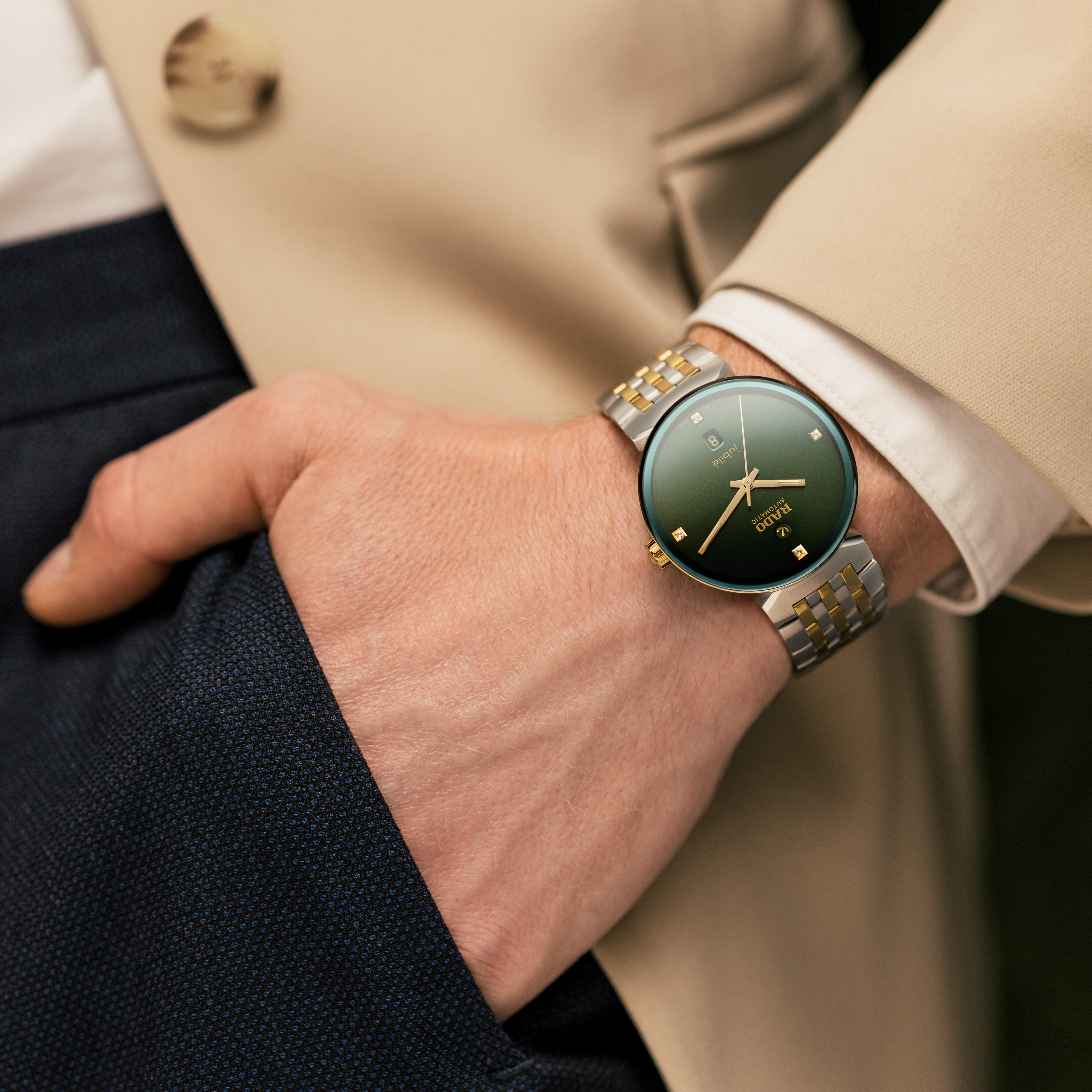 Rado瑞士雷达表Florence佛罗伦萨系列将永恒的文艺复兴艺术与瑞士精度融合,缔造惊艳效果。纤薄轮廓与奢华七排链节表链保证舒适佩戴,金属镀层延展式蓝宝石玻璃表镜确保腕表坚固耐用。暖金色指针覆有白色Super-LumiNova夜光涂层,掠过绿色表盘——3、6、9及12时位镶嵌四颗钻石,并饰以细腻的双向拉丝打磨纹理。6点钟日期显示的绿色金属镀层与绿色背景均与表盘色彩完美契合。盒形蓝宝石玻璃透视底盖令设计师得以保留标志性纤薄轮廓。腕表搭载Rado瑞士雷达表R763型机芯,这是一枚具备80小时动力储存的25石3针自动机芯,配备防磁NivachronTM游丝,走时更精准可靠。本表款的雅致美学将喷砂精钢表壳与抛光表圈底盖巧妙并置,表链的高对比度喷砂与抛光链节与之形成完美呼应。