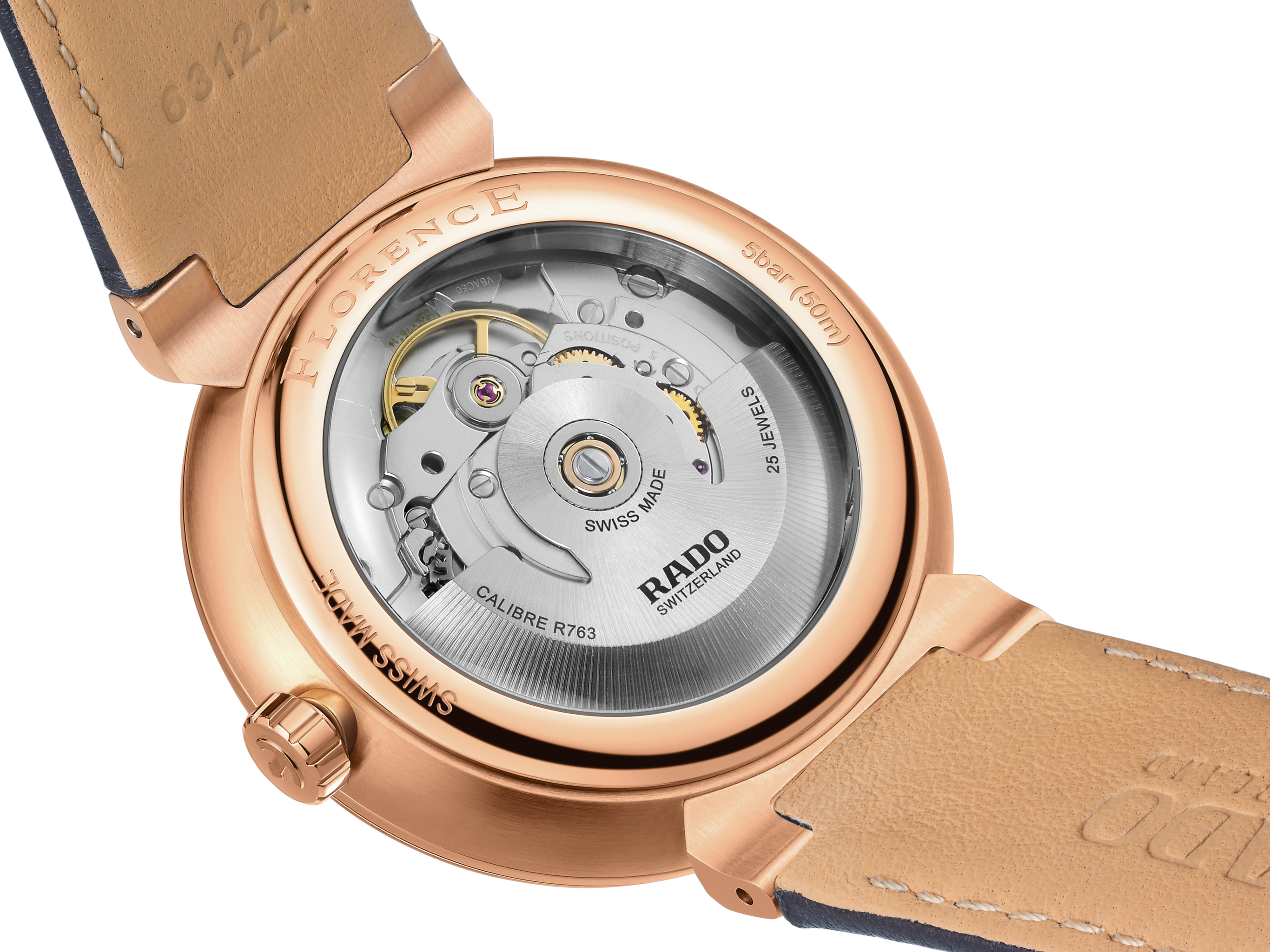 探索精准与典雅相融合的Rado瑞士雷达表Florence佛罗伦萨系列腕表。 39毫米表壳搭配无边框蓝宝石玻璃表镜,金属镀层边缘与蓝色表盘彼此呼应。蓝宝石玻璃既可保护表盘,又能作为表圈无缝融入表壳之中,凸显Florence佛罗伦萨系列极具代表性的精致轮廓。 蓝色表盘犹如戏剧舞台,精致的压印图案尽显细节感。玫瑰金色时标与其上方的可摆动锚型标志经过拉丝和抛光处理,与蓝色背景形成鲜明对比。 表壳搭配蓝色皮革表带,与末端链节搭配在一起,以PVD涂层玫瑰金精钢针扣固定。盒形蓝宝石玻璃底盖下方隐藏着Florence佛罗伦萨腕表的灵魂:R763型自动机芯。机芯经过五个方位精密调节,搭载Nivachron™游丝,提供高精准度和最高长达80小时动力储存,彰显Rado瑞士雷达表对高品质的承诺。