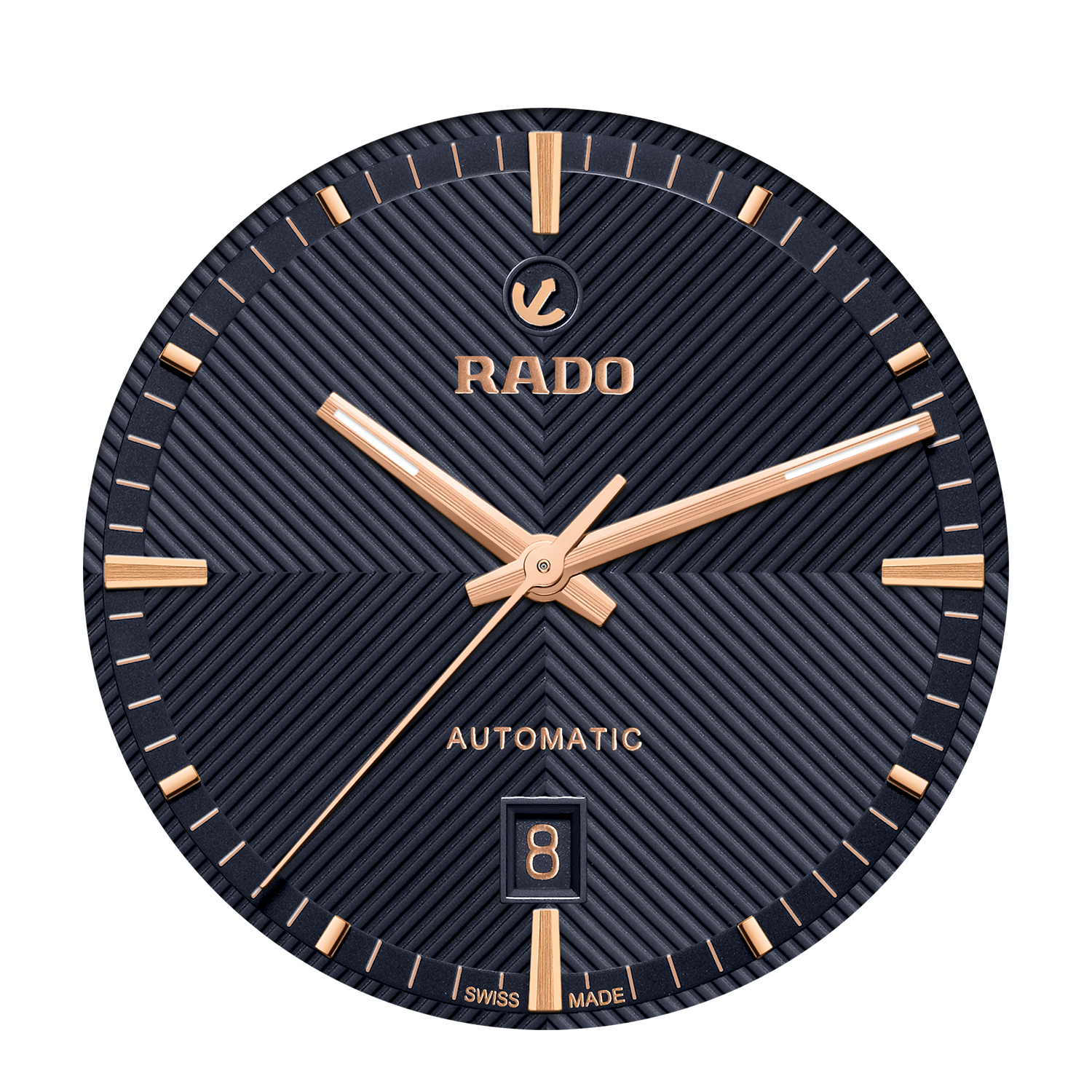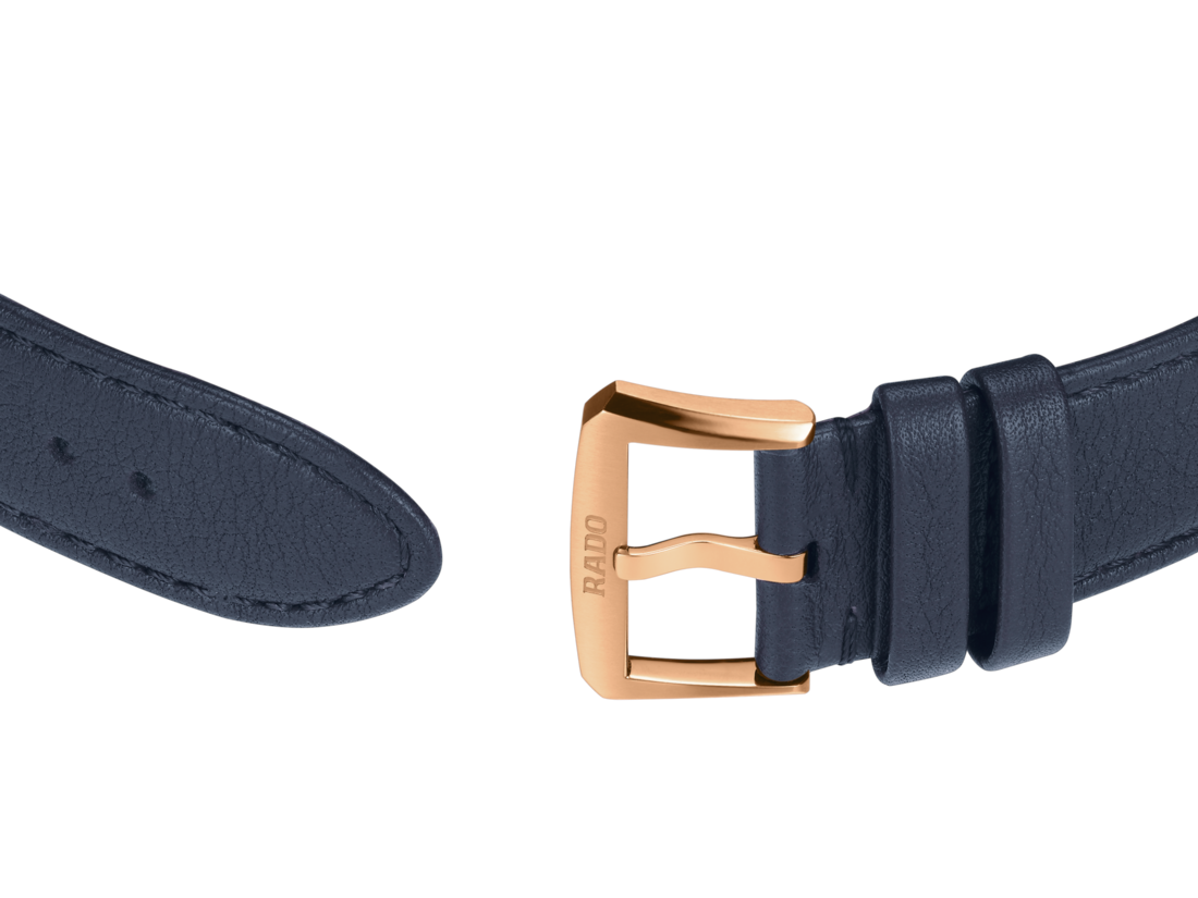 蓝色表盘犹如一幅精致优雅的画布,凸显精致的压印图案。玫瑰金色指针和时标经过精心拉丝和抛光处理,在浓郁的蓝色背景下显得格外引人注目。表盘上饰有Rado瑞士雷达表极具代表性的可摆动锚型标志,营造出迷人的对比效果。指针覆有白色Super-LumiNova®夜光涂层,确保轻松读时,设于6点钟位置的日期窗口则令这款精心制作的表盘更加出众。