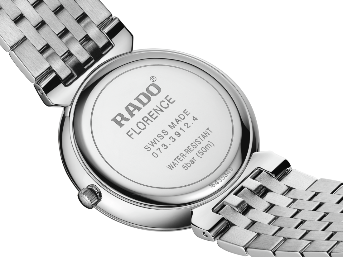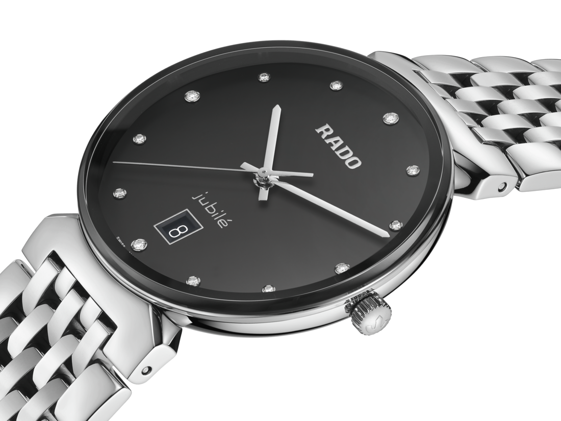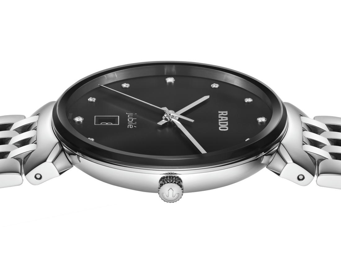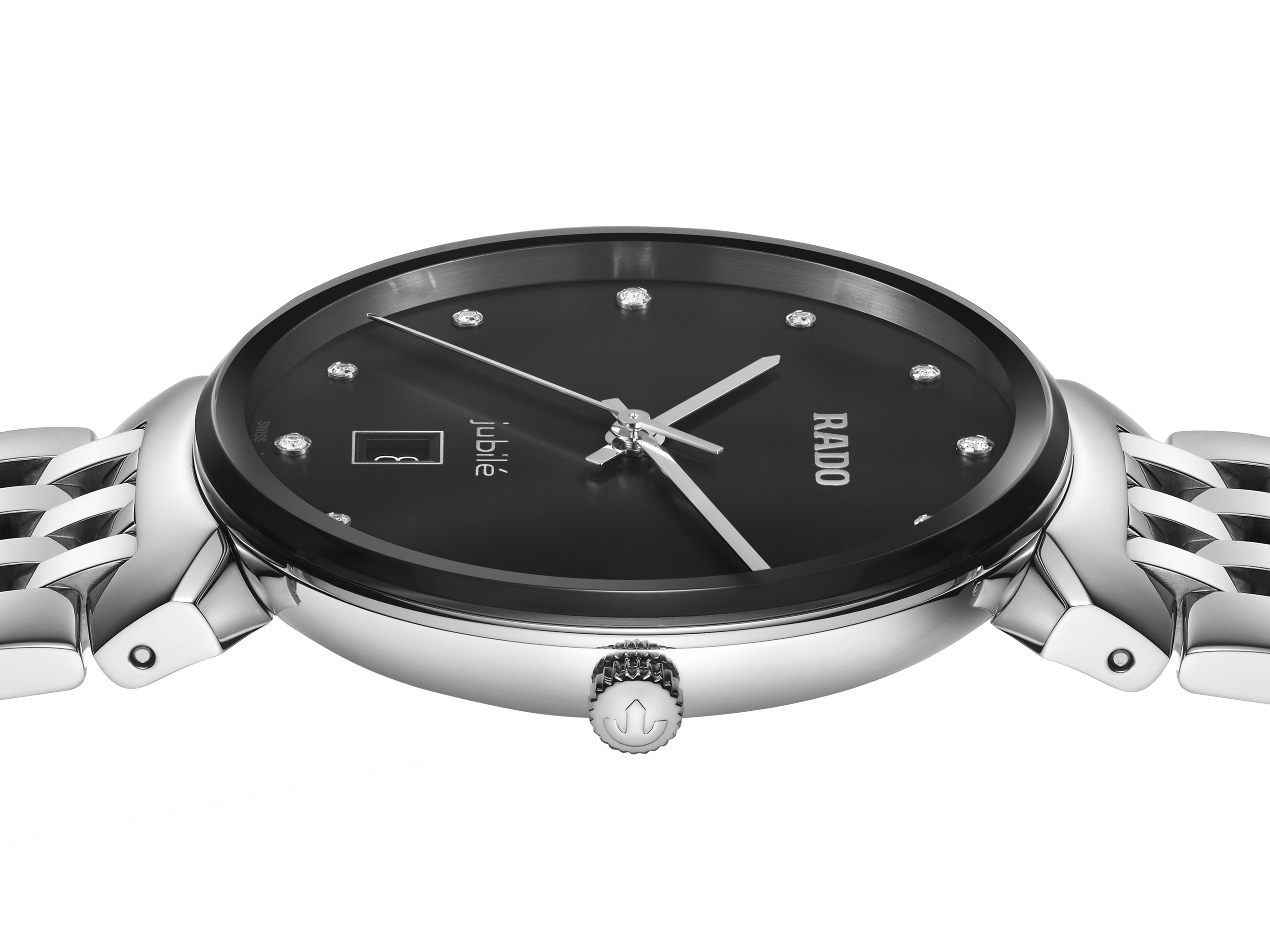Rado瑞士雷达表Florence佛罗伦萨经典系列腕表充满和谐感的设计构思,令人联想起这款腕表所命名城市——意大利佛罗伦萨标志性典雅圆顶和钟塔。该系列腕表搭载高品质自动机械机芯和品牌创新材质工艺——无边框金属镀层蓝宝石玻璃,堪称是经得起时间考验的瑞士时计臻品。这款38毫米腕表拥有无边框弧形斜面蓝宝石水晶玻璃表镜。表壳、表圈、表冠和表链均采用抛光精钢制成。黑色太阳纹表盘镶嵌着12颗钻石,印有“jubilé”标志,与铑色指针完美搭配。搭载三针R073型石英机芯,让腕表具有更加优异的精度和抗震性。腕表防水性能达50米。此外,另有小尺寸可供挑选,是理想的情侣款腕表。