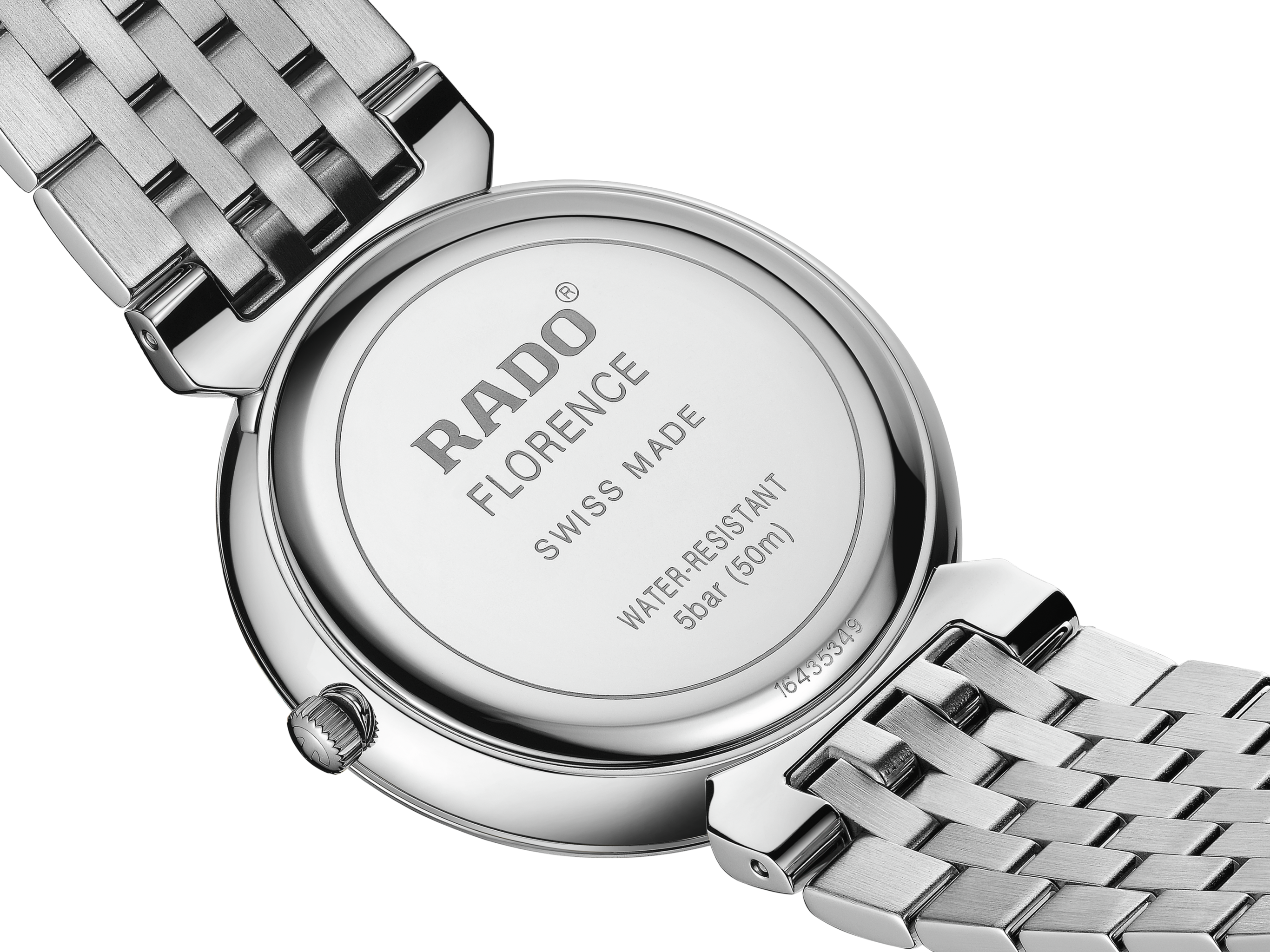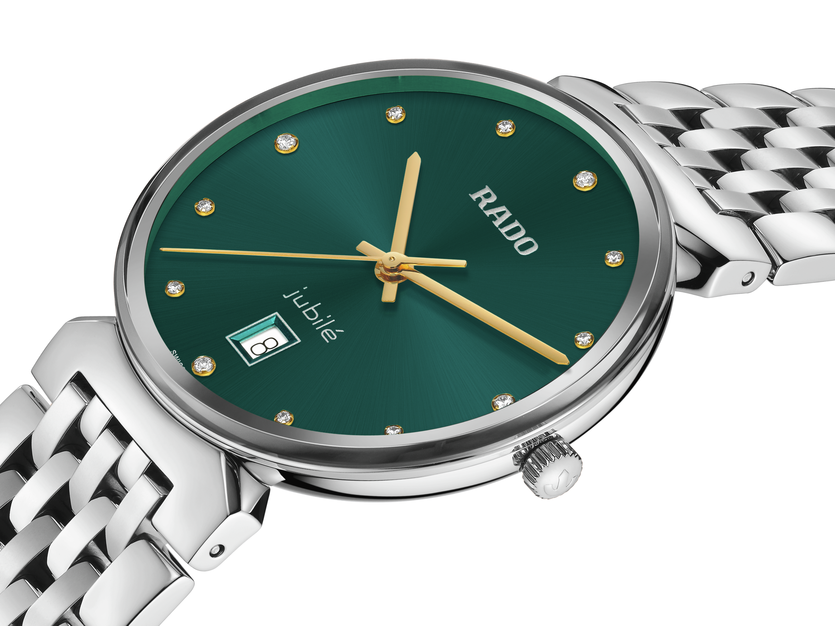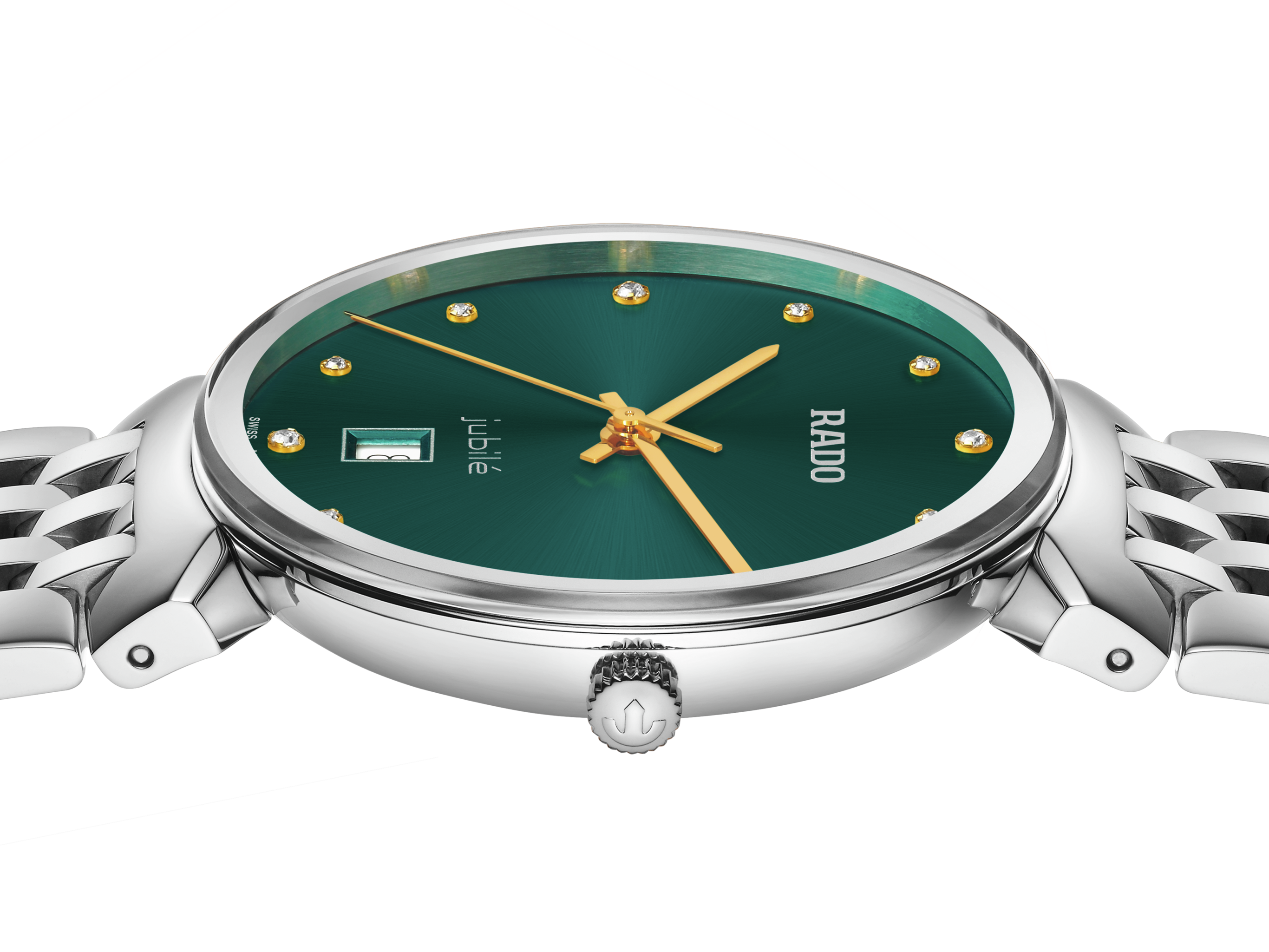 Rado瑞士雷达表Florence佛罗伦萨系列的和谐设计,令人想起腕表命名城市的典雅圆顶和钟塔。搭载性能可靠的三针R073型石英机芯,让腕表具有更加优异的精度和抗震性。这款38毫米腕表拥有无边框弧形斜面蓝宝石水晶表镜。腕表采用抛光精钢表壳、表冠、表圈和底盖。抛光精钢制成的表链,令这款经典时计的整体外观更臻完美。绿色表盘镶嵌着12颗钻石,印有银色“jubilé”标志,与黄金色指针完美搭配。腕表防水性能达50米。此外,另有小尺寸可供挑选,是理想的情侣款腕表。