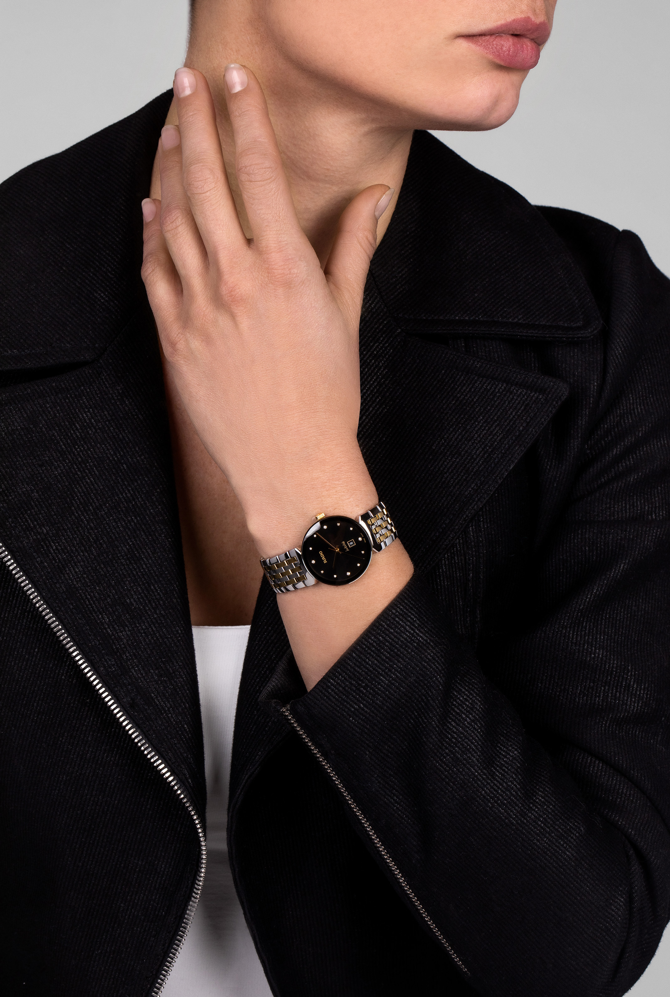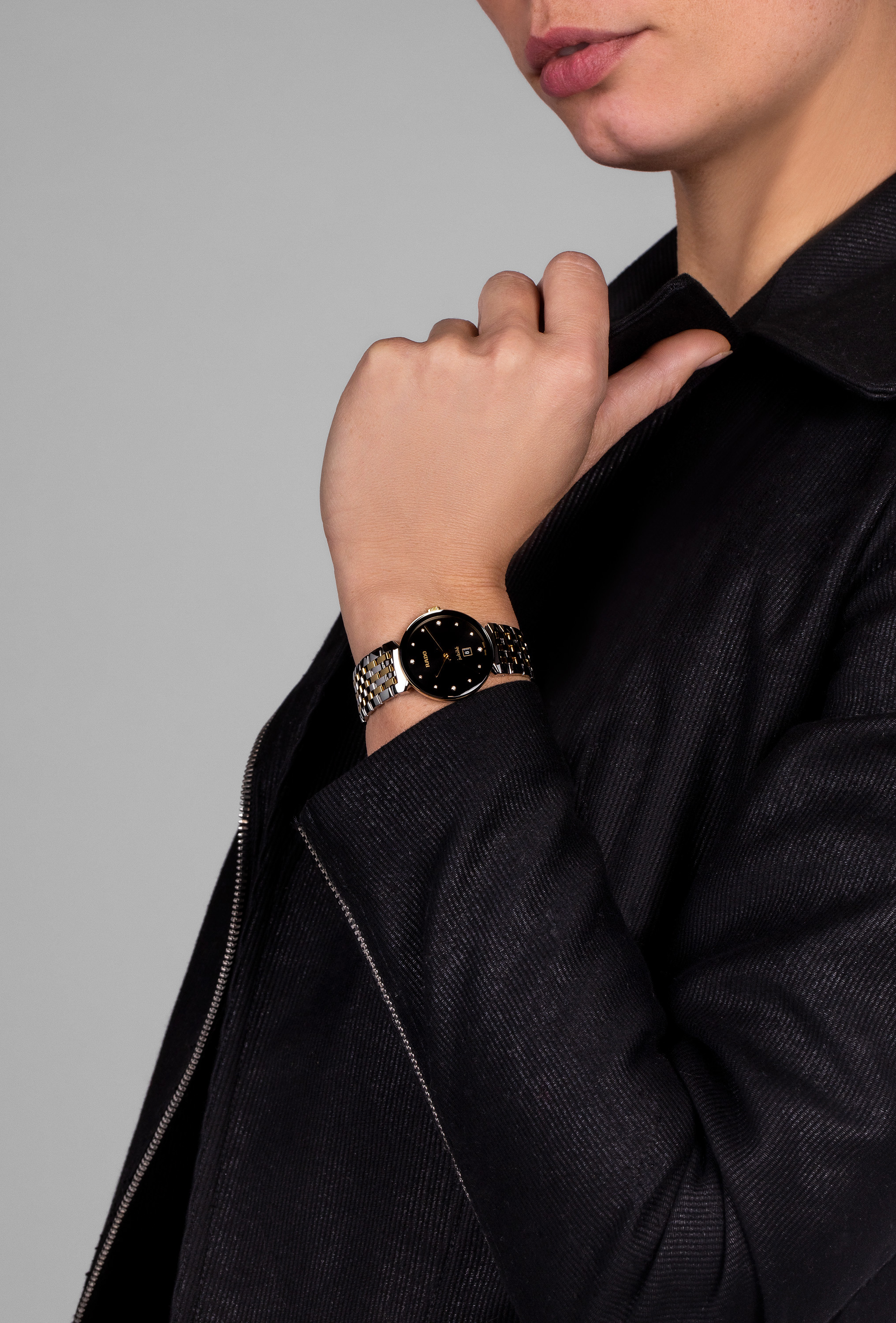 Rado瑞士雷达表Florence佛罗伦萨经典系列腕表充满和谐感的设计构思,令人联想起这款腕表所命名城市——意大利佛罗伦萨标志性典雅圆顶和钟塔。该系列腕表搭载高品质自动机械机芯和品牌创新材质工艺——无边框金属镀层蓝宝石玻璃,堪称是经得起时间考验的瑞士时计臻品。这款30毫米腕表拥有无边框弧形斜面蓝宝石水晶玻璃表镜。采用抛光精钢制成的表链,搭配黄金色中央链节,令这款经典时计的整体外观更臻完美。黑色太阳纹表盘镶嵌着12颗钻石,印有“jubilé”标志,与黄金色指针完美搭配。搭载三针R079型石英机芯,让腕表具有更加优异的精度和抗震性。腕表防水性能达50米。此外,另有大尺寸可供挑选,是理想的情侣款腕表。