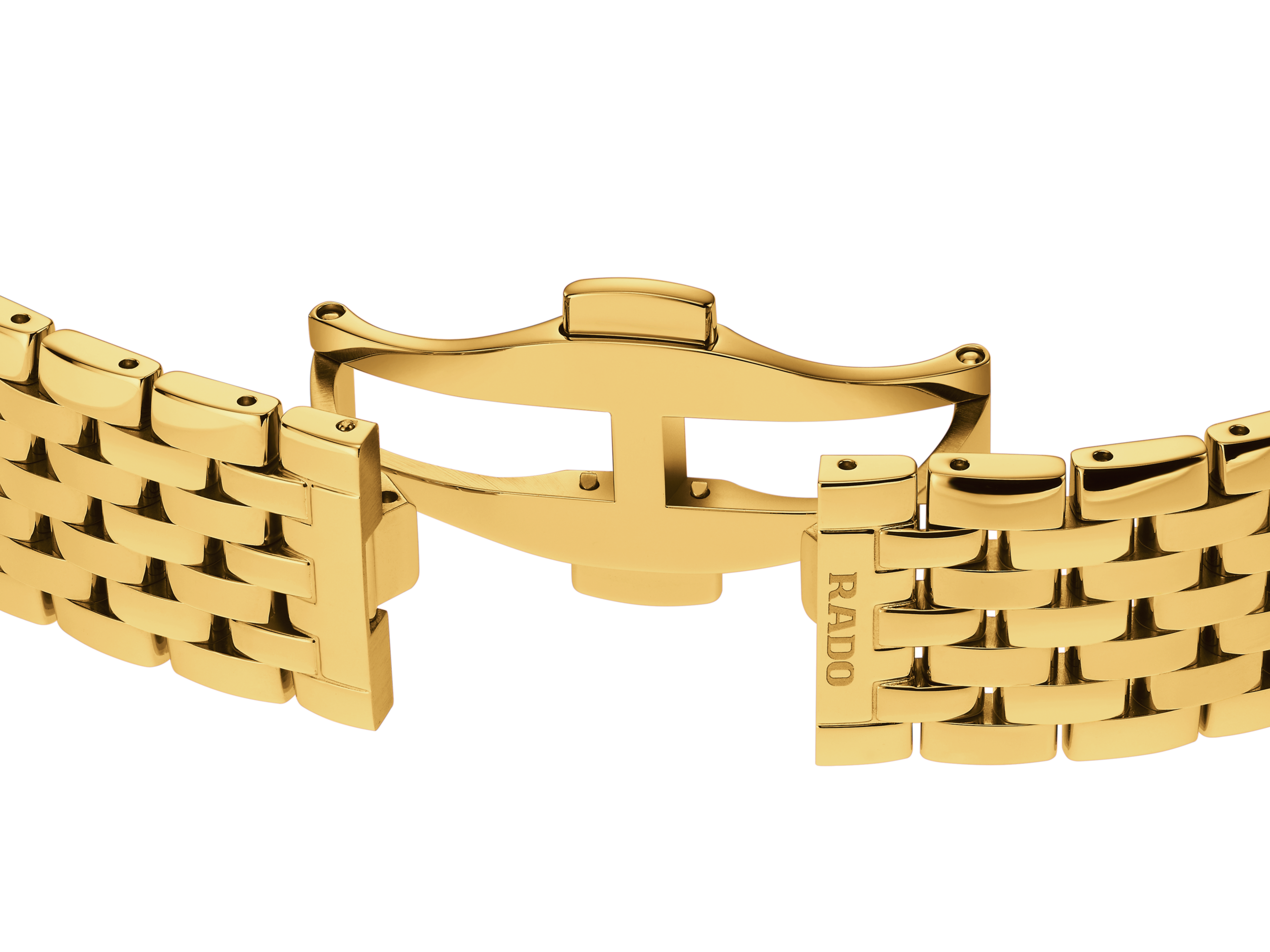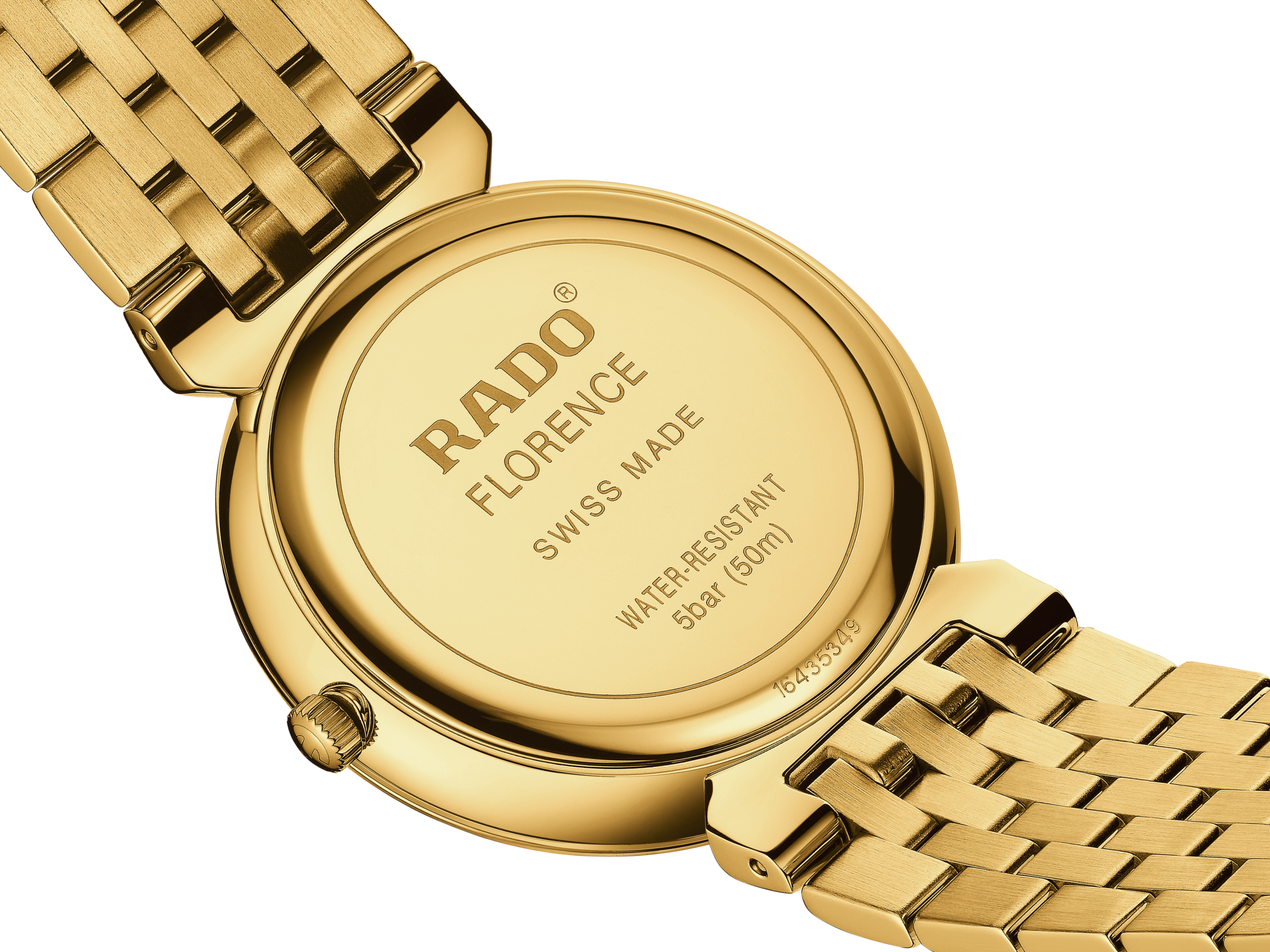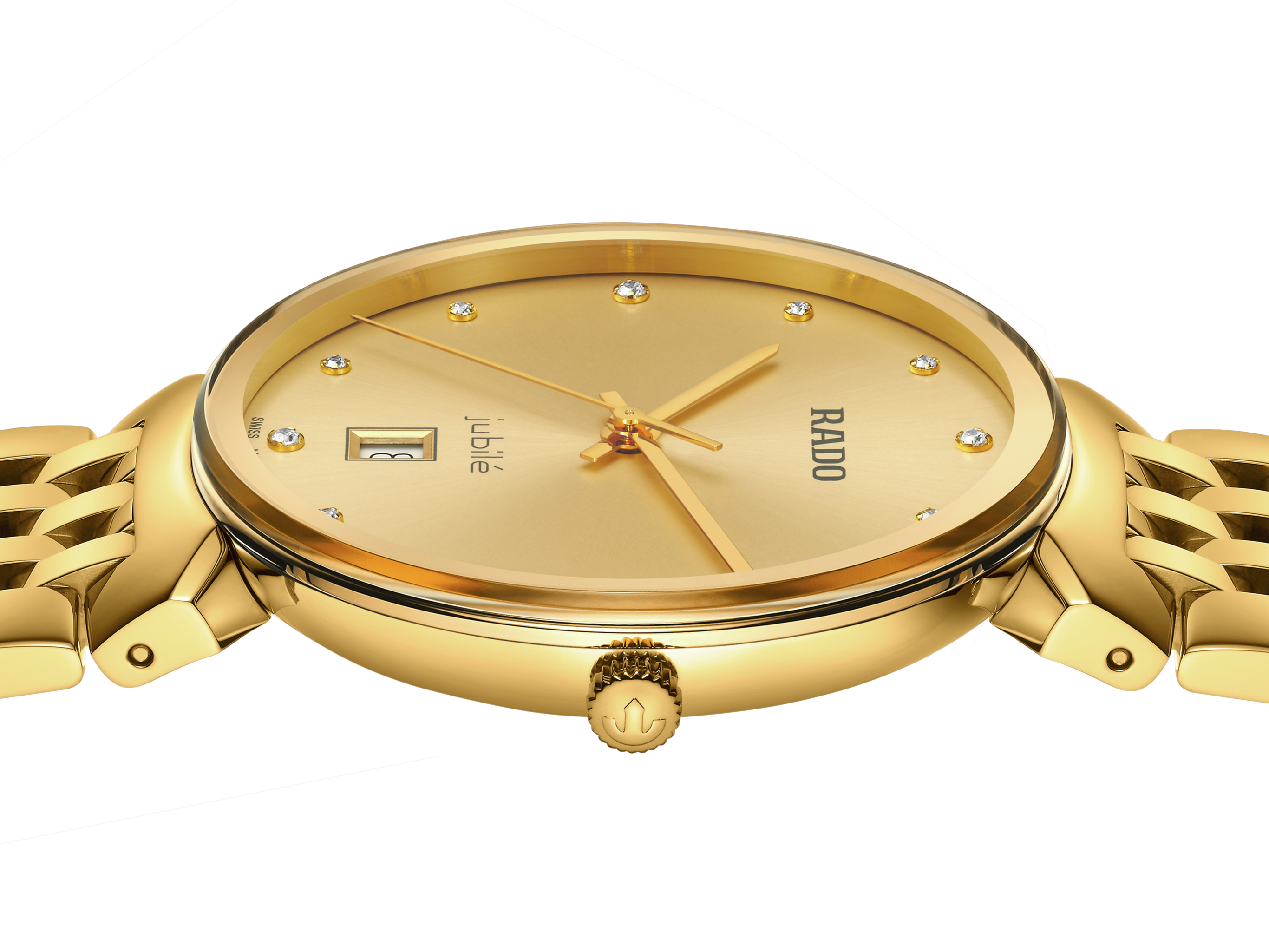 Rado瑞士雷达表Florence佛罗伦萨系列的和谐设计,令人想起腕表命名城市的典雅圆顶和钟塔。搭载性能可靠的三针R073型石英机芯,让腕表具有更加优异的精度和抗震性。这款38毫米腕表拥有无边框弧形斜面蓝宝石水晶表镜。腕表采用抛光黄金色PVD涂层精钢表壳、表冠、表圈和底盖。抛光黄金色涂层精钢制成的表链,令这款经典时计的整体外观更臻完美。黄金色表盘镶嵌着12颗钻石,印有“jubilé”标志,与黄金色指针完美搭配。腕表防水性能达50米。此外,另有小尺寸可供挑选,是理想的情侣款腕表。
