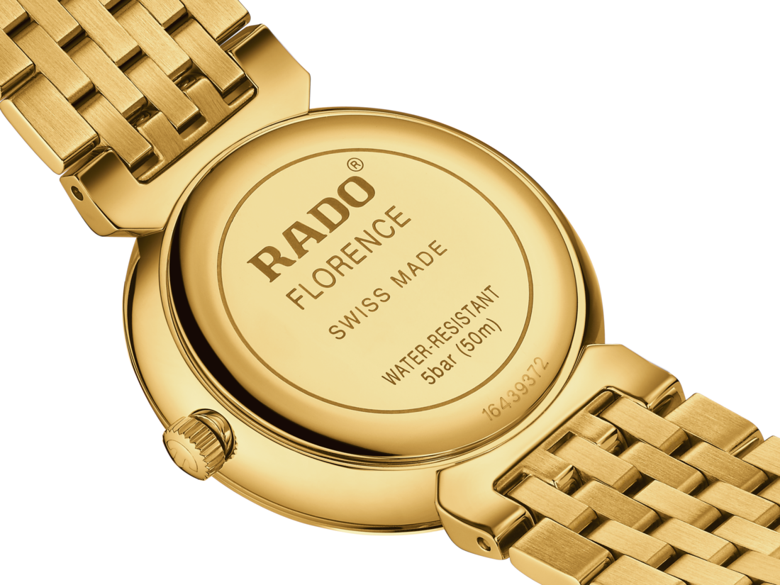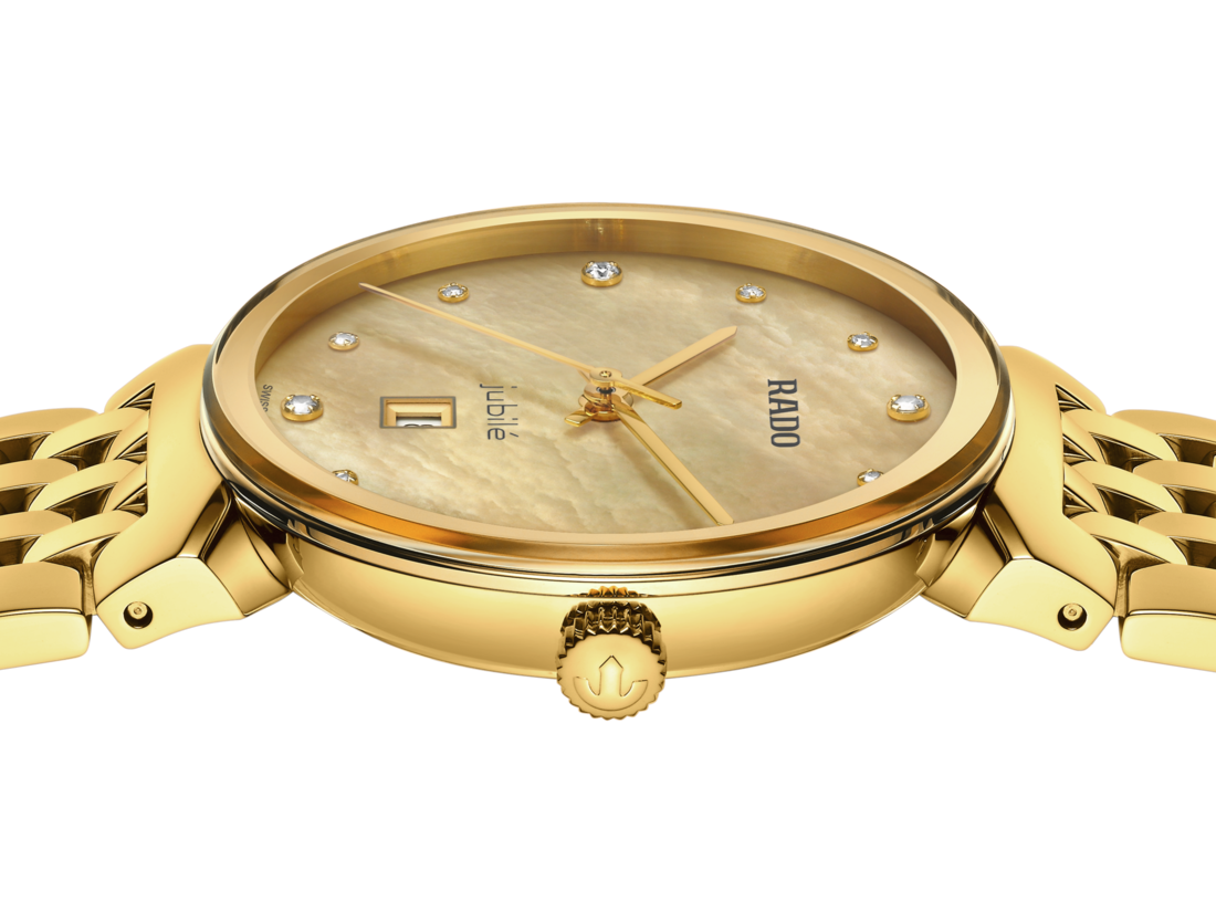 Rado瑞士雷达表Florence佛罗伦萨系列的和谐设计,令人想起腕表命名城市的典雅圆顶和钟塔。搭载性能可靠的三针R079型石英机芯,让腕表具有更加优异的精度和抗震性。这款30毫米腕表拥有无边框弧形斜面蓝宝石水晶表镜。腕表采用抛光黄金色PVD涂层精钢表壳、表冠、表圈和底盖。抛光黄金色涂层精钢制成的表链,令这款经典时计的整体外观更臻完美。珍珠母贝表盘镶嵌着12颗钻石,印有“jubilé”标志,与黄金色指针完美搭配。腕表防水性能达50米。此外,另有大尺寸可供挑选,是理想的情侣款腕表。